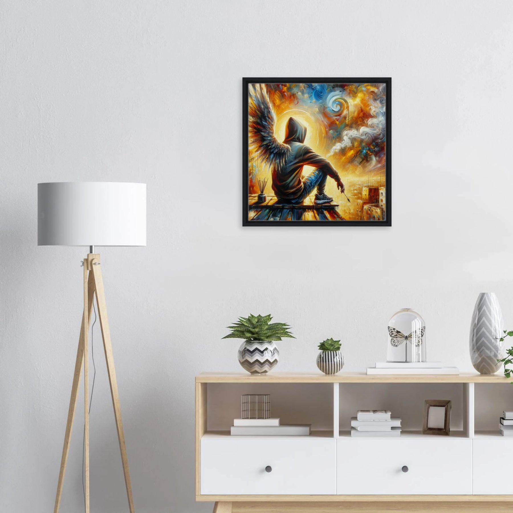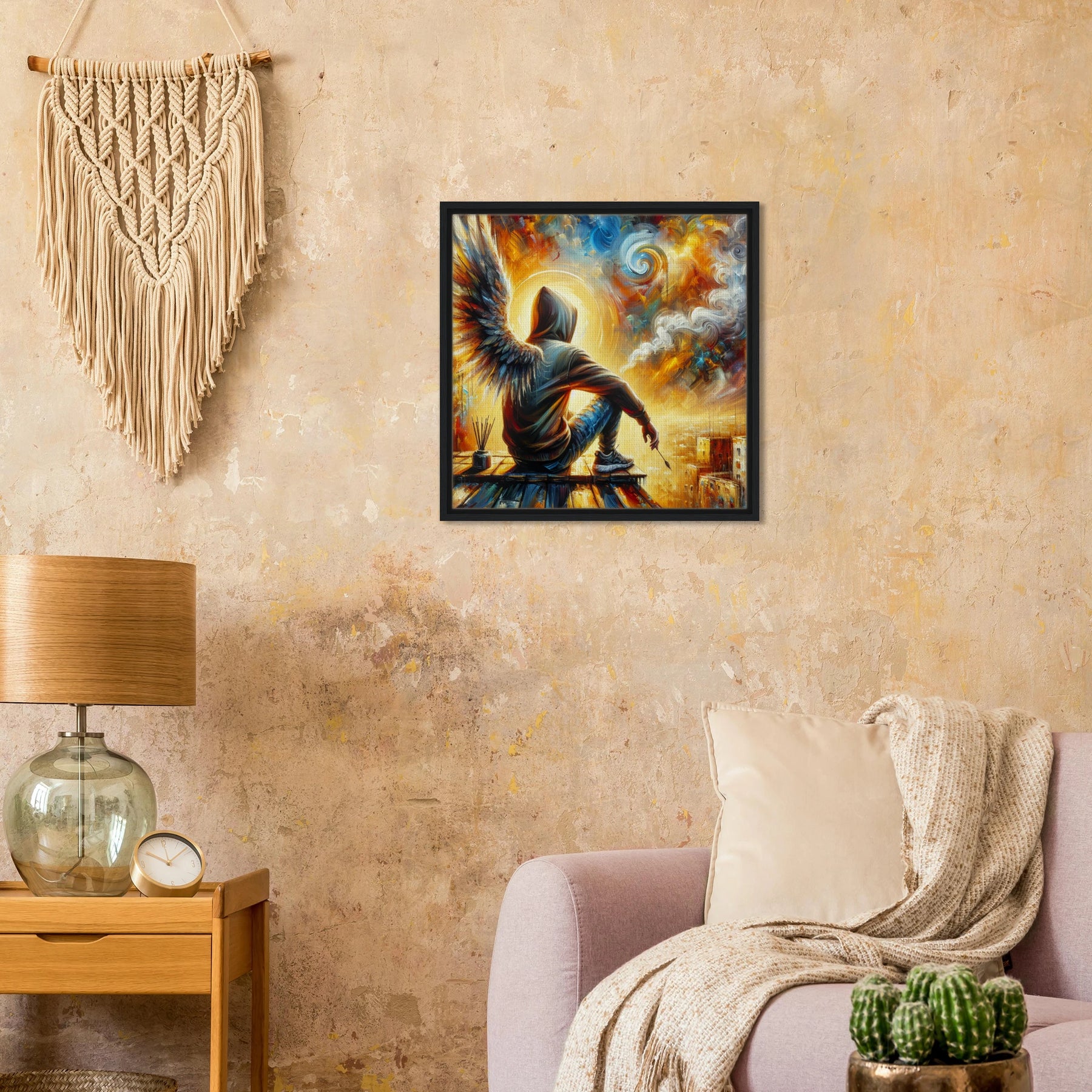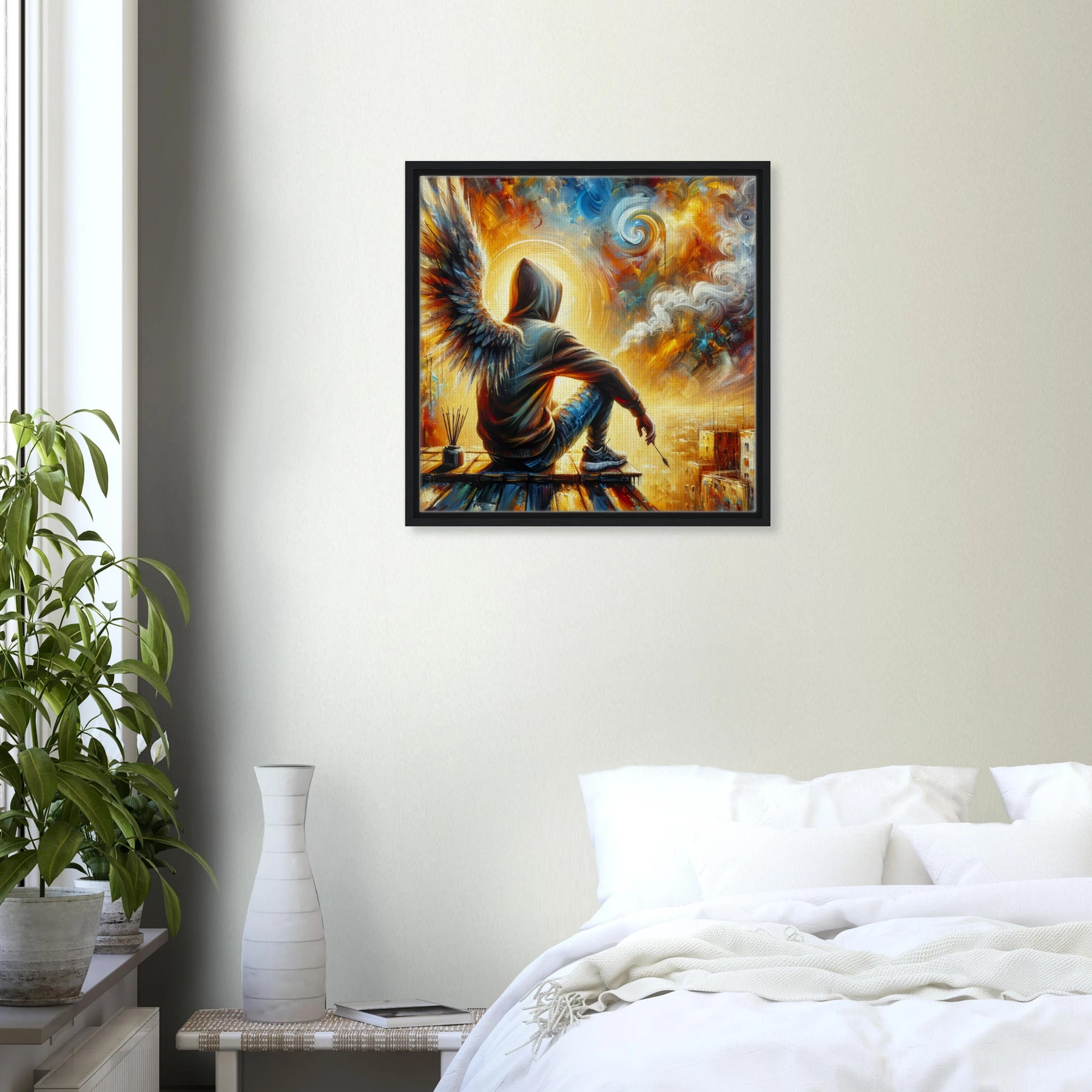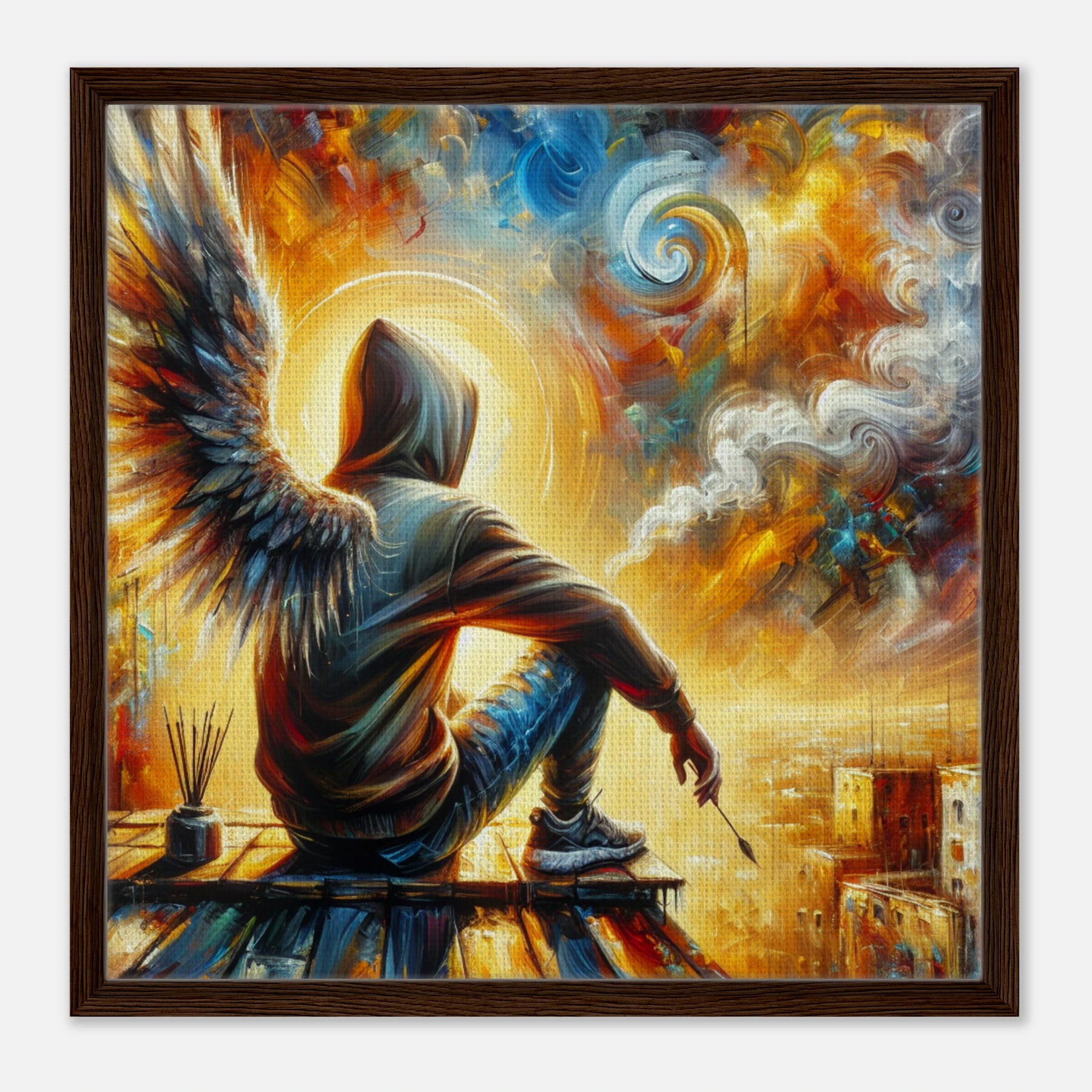 Diese gerahmte Leinwand zeigt einen Engel aus der Urban Angel-Serie – kraftvoll, ästhetisch und voller Tiefe. Die strukturierte Oberfläche bringt das Motiv besonders lebendig zur Geltung, der hochwertige Rahmen sorgt für eine elegante Galerie-Optik.