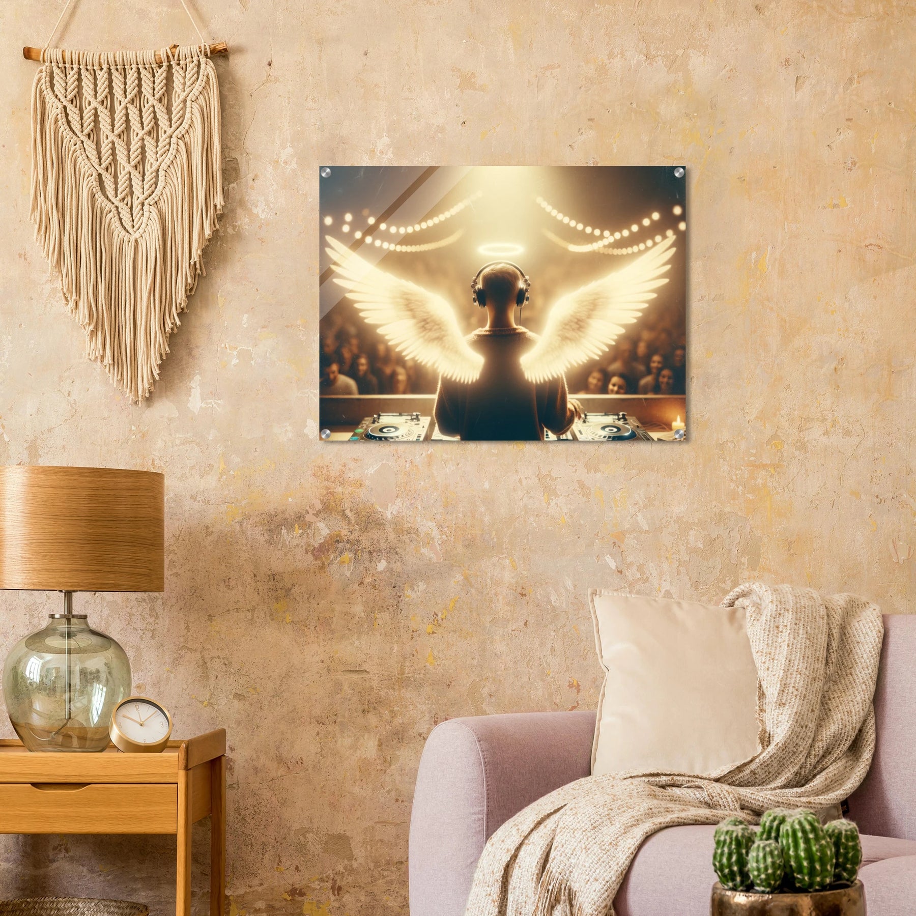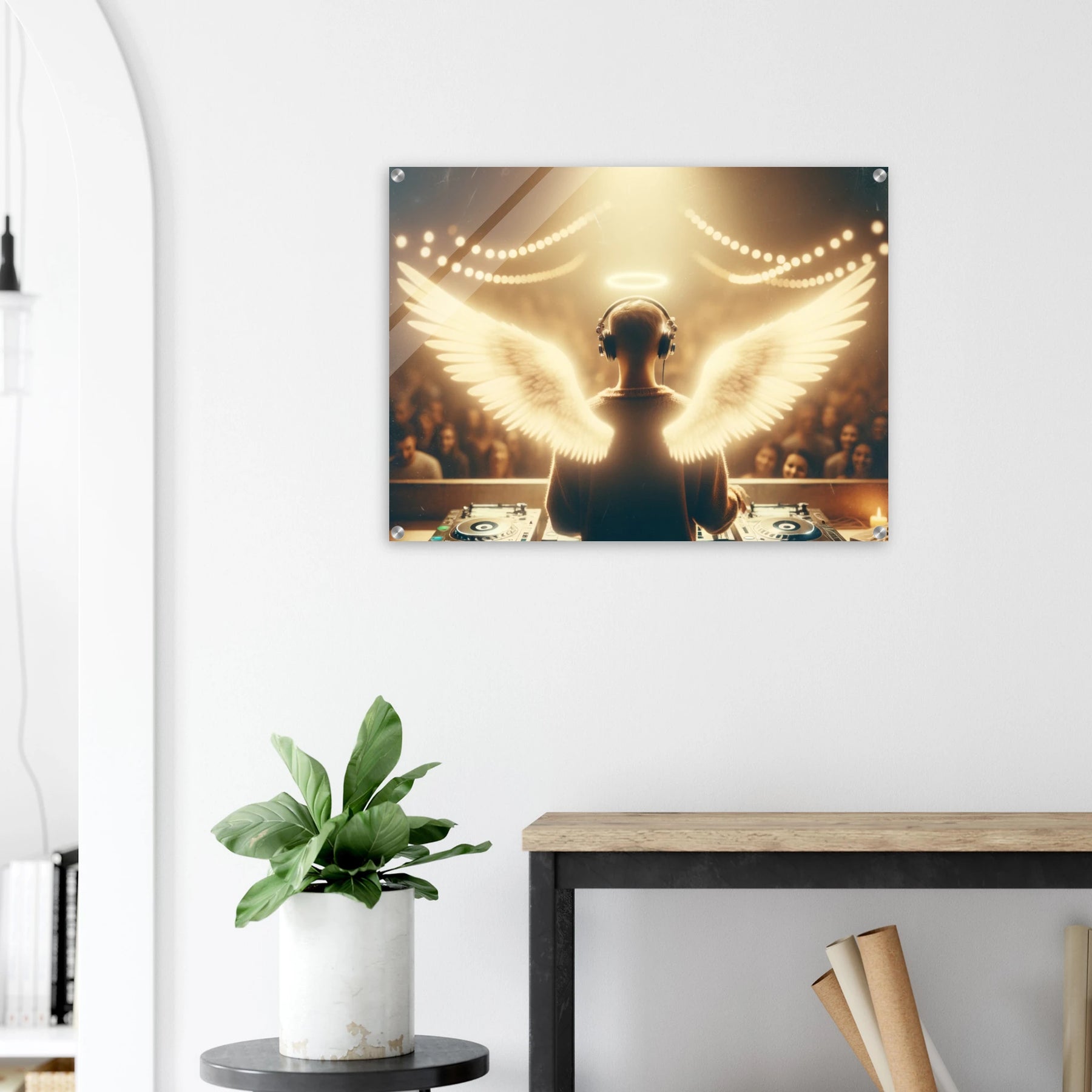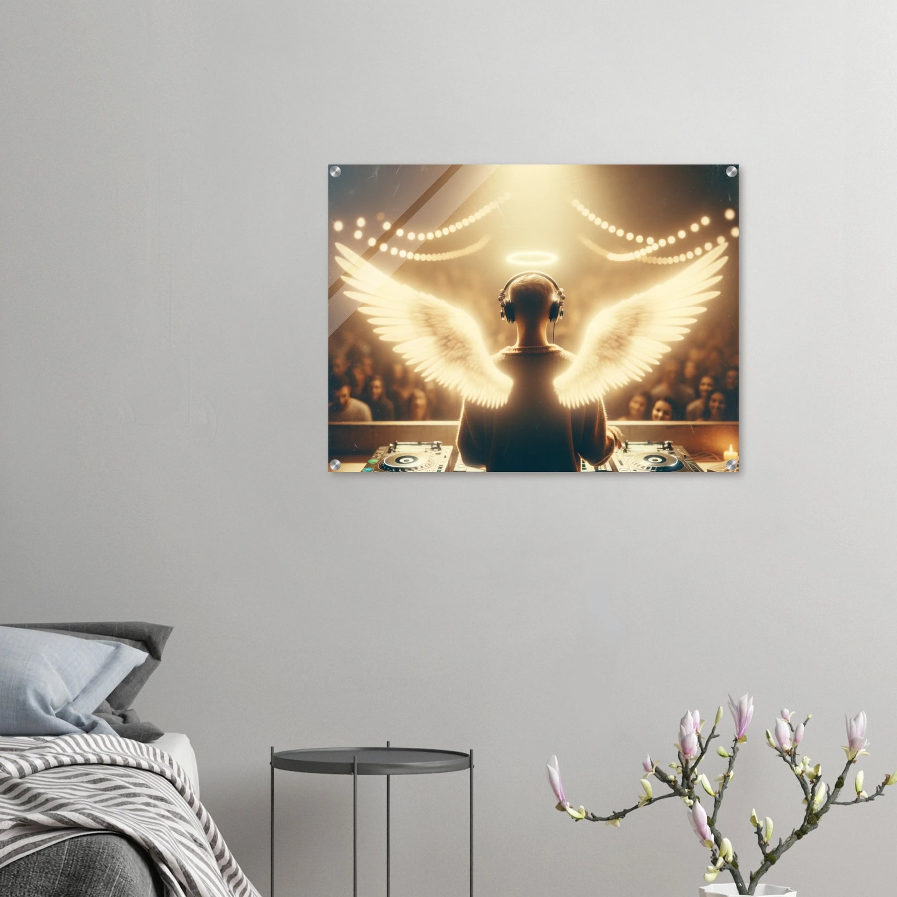 DJ mit Engelsflügeln und Licht-Halo – Party Heaven Acrylglasdruck, macht Party-Musik vor Turntables