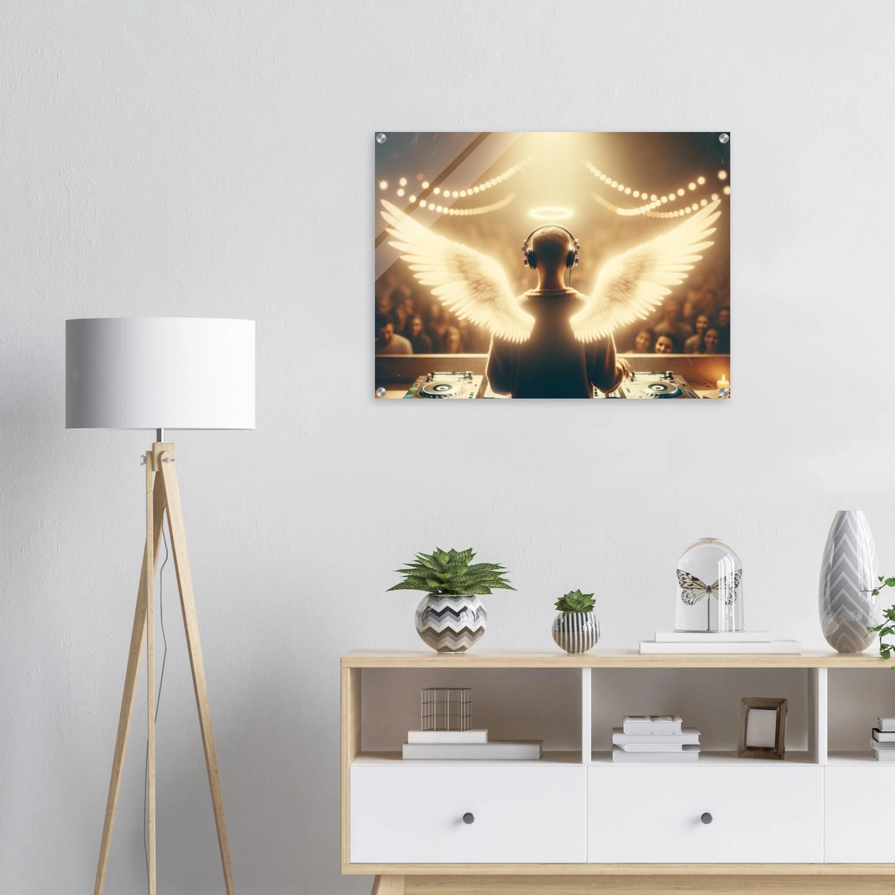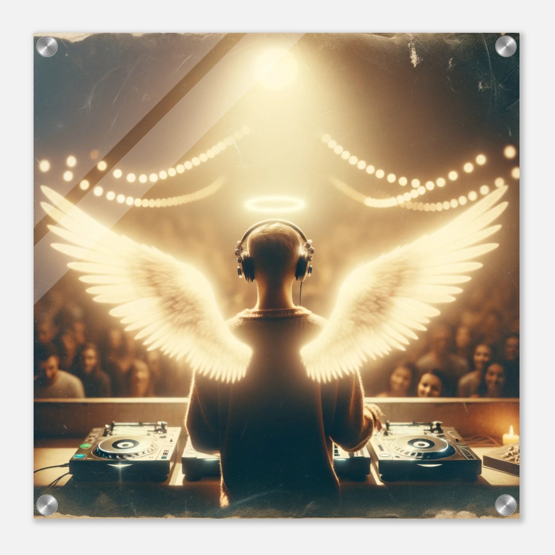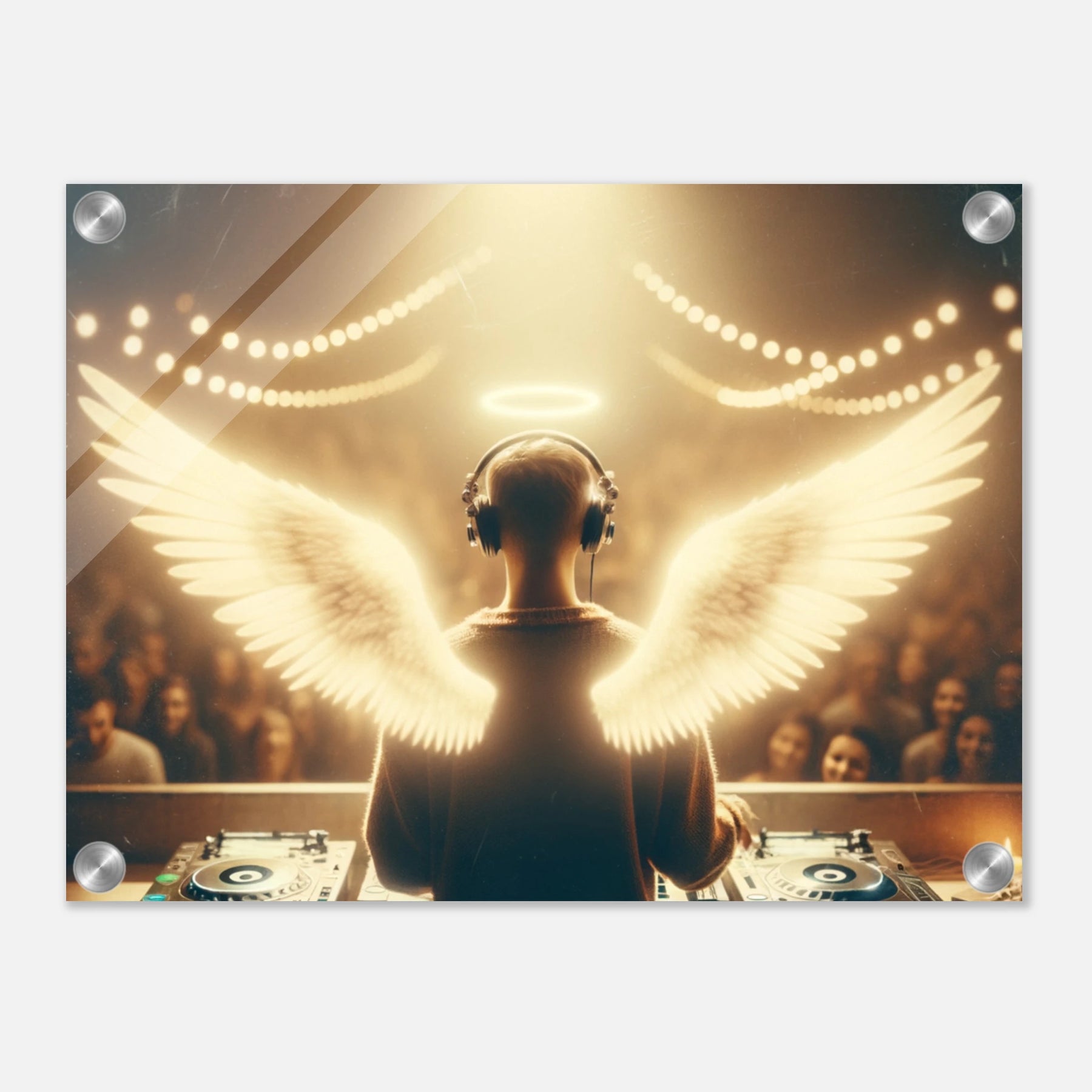 DJ mit Engelsflügeln und Licht-Halo – Party Heaven Acrylglasdruck, macht Party-Musik vor Turntables