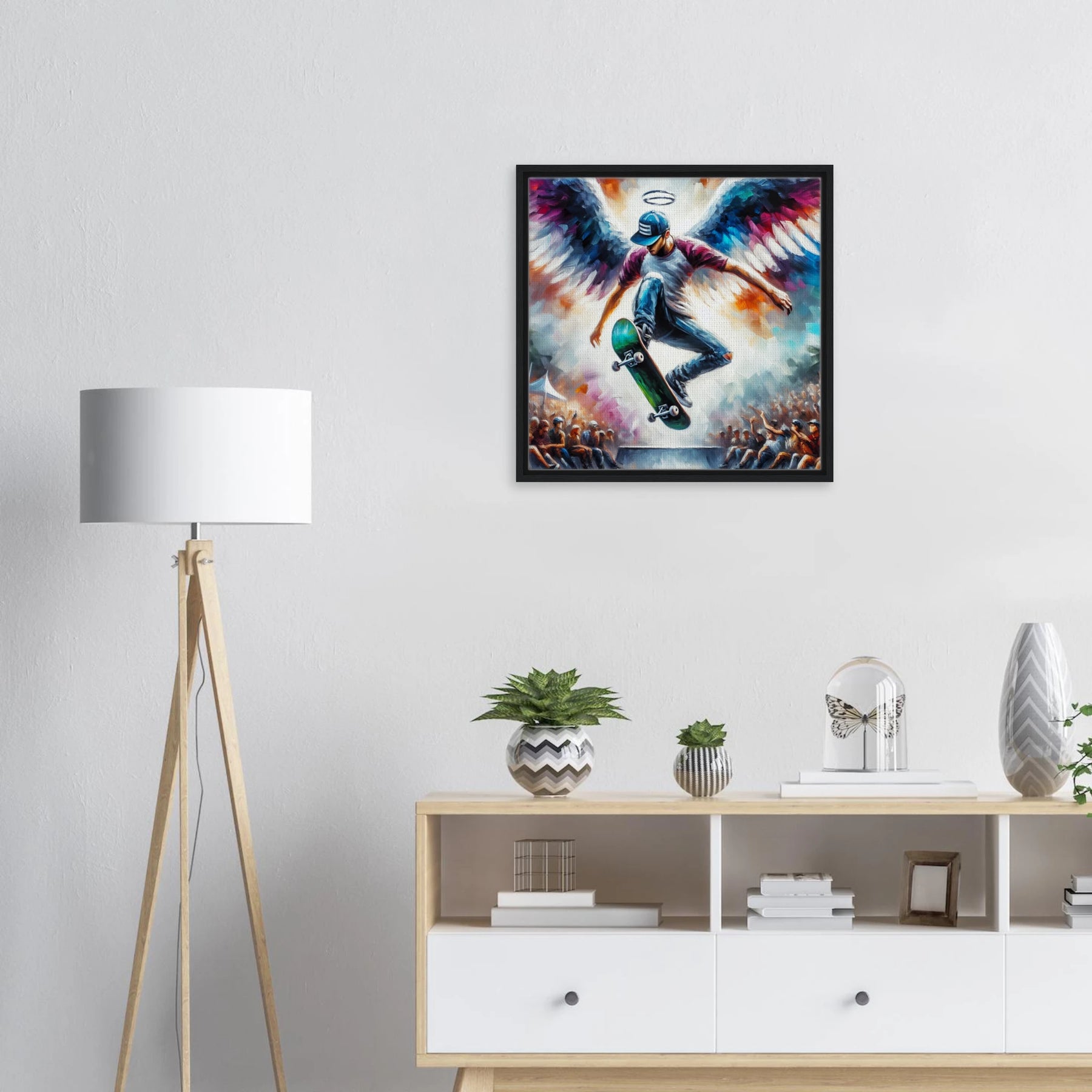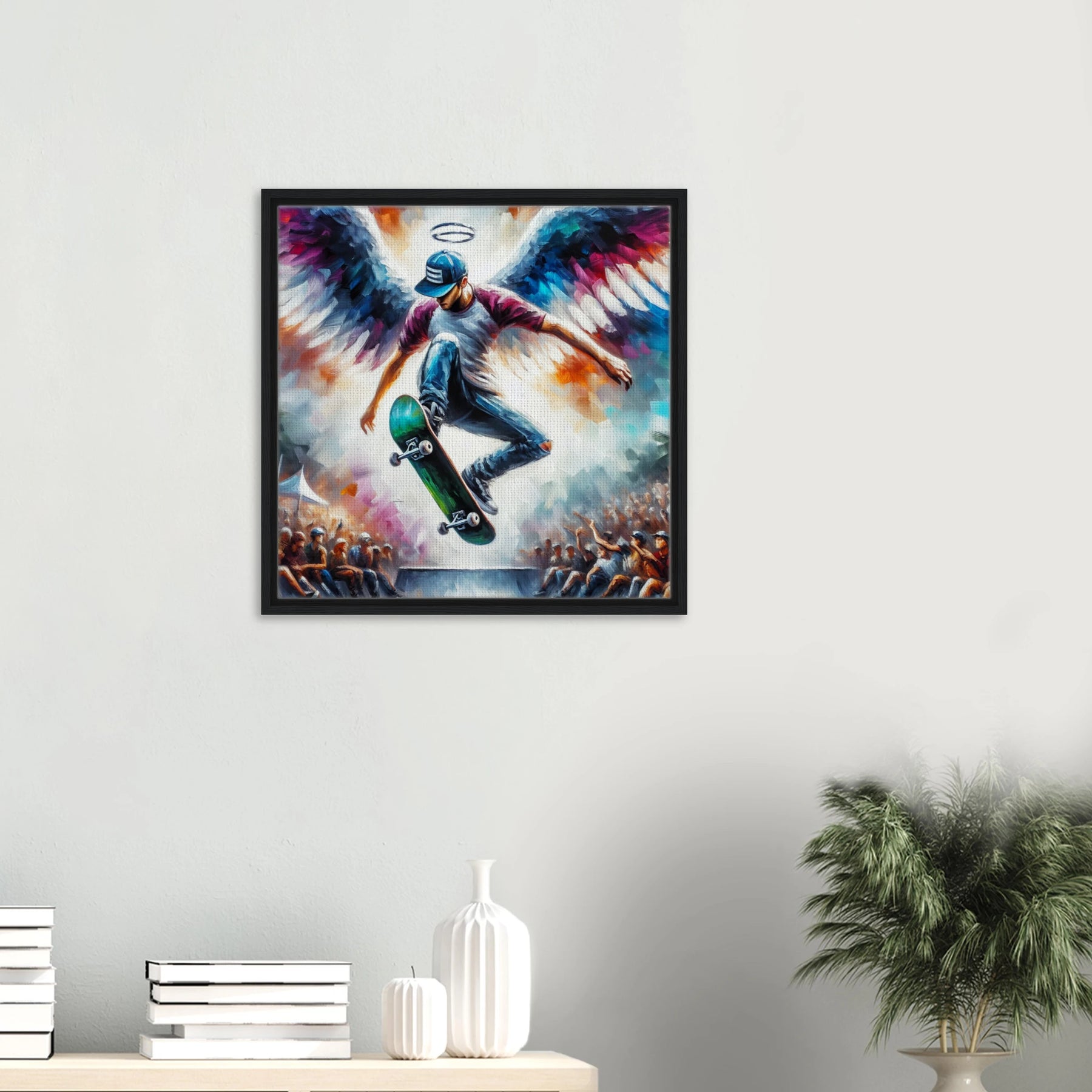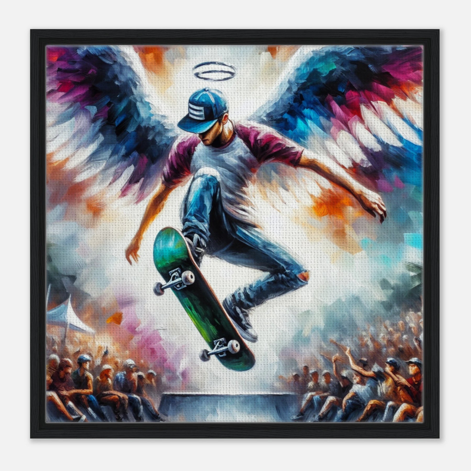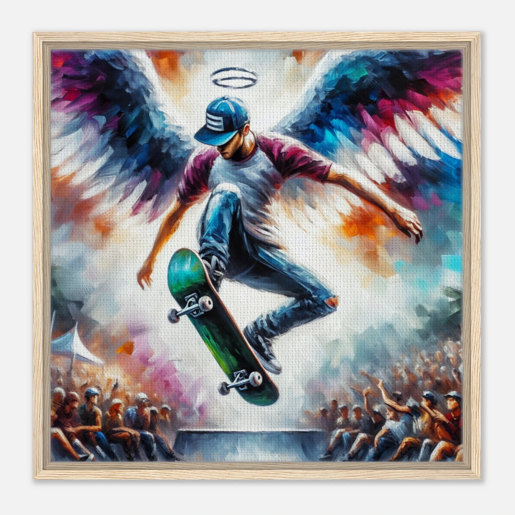 Skateboard-Engel – bunter Leinwanddruck eines verstorbenen Skaters mit Flügeln beim Olli im Himmel