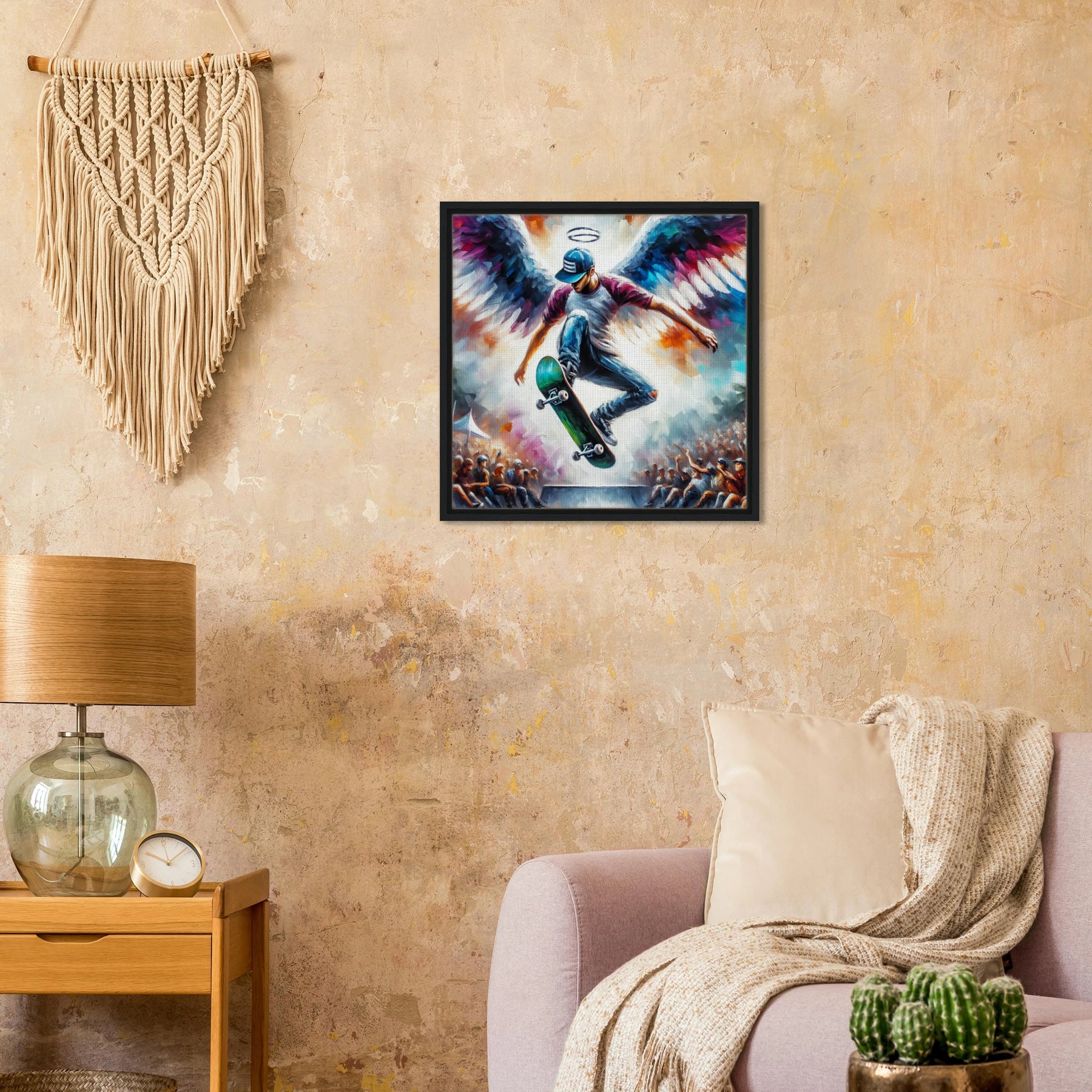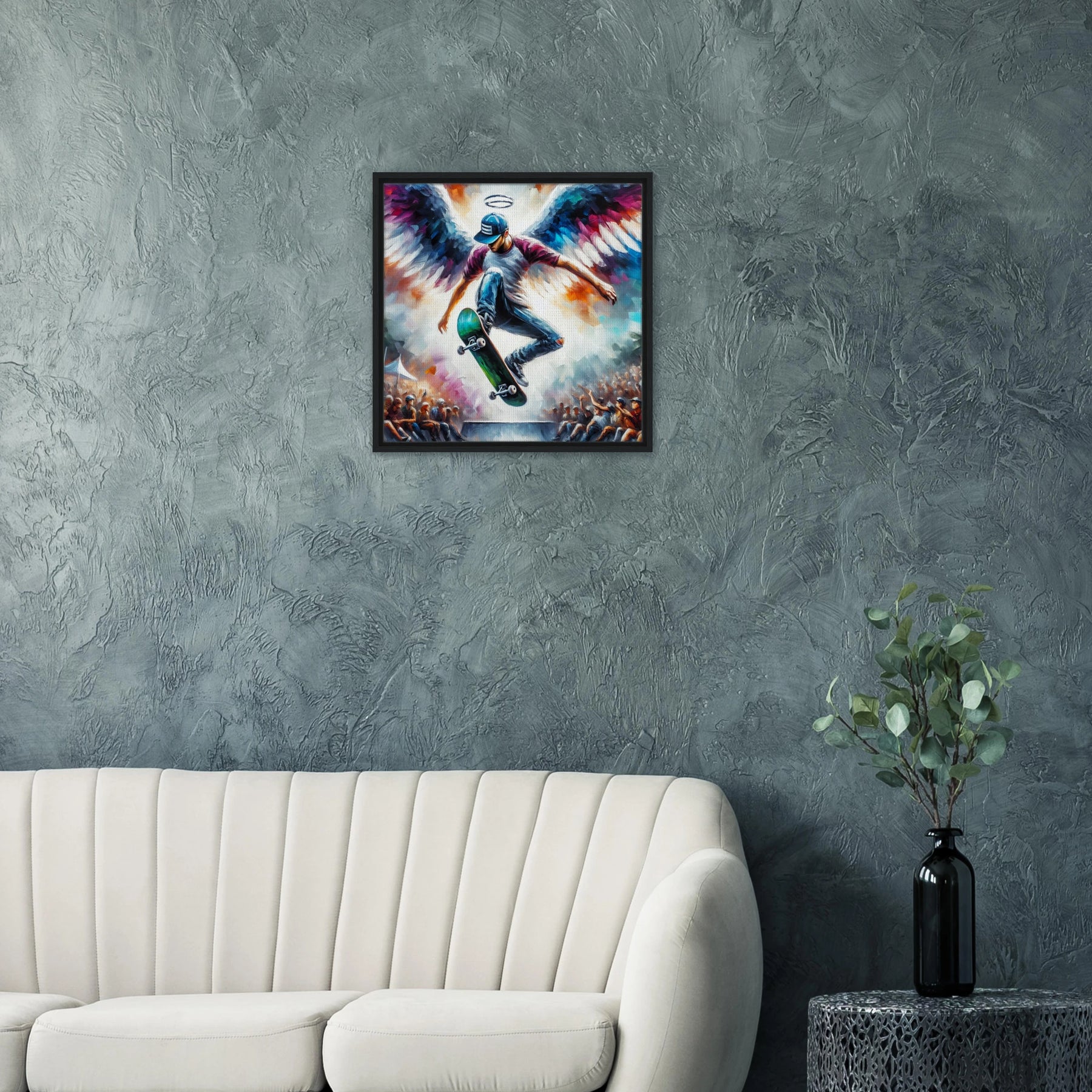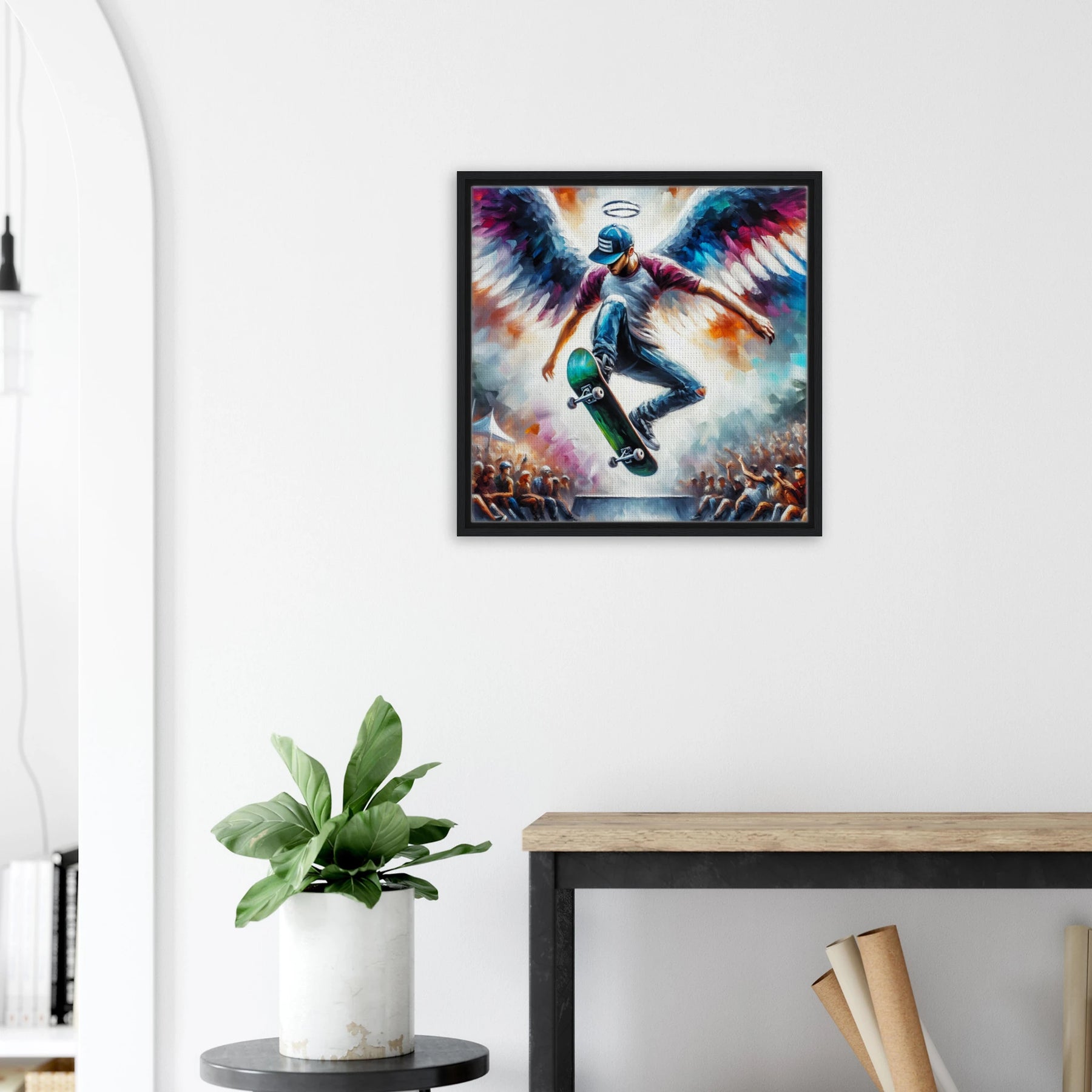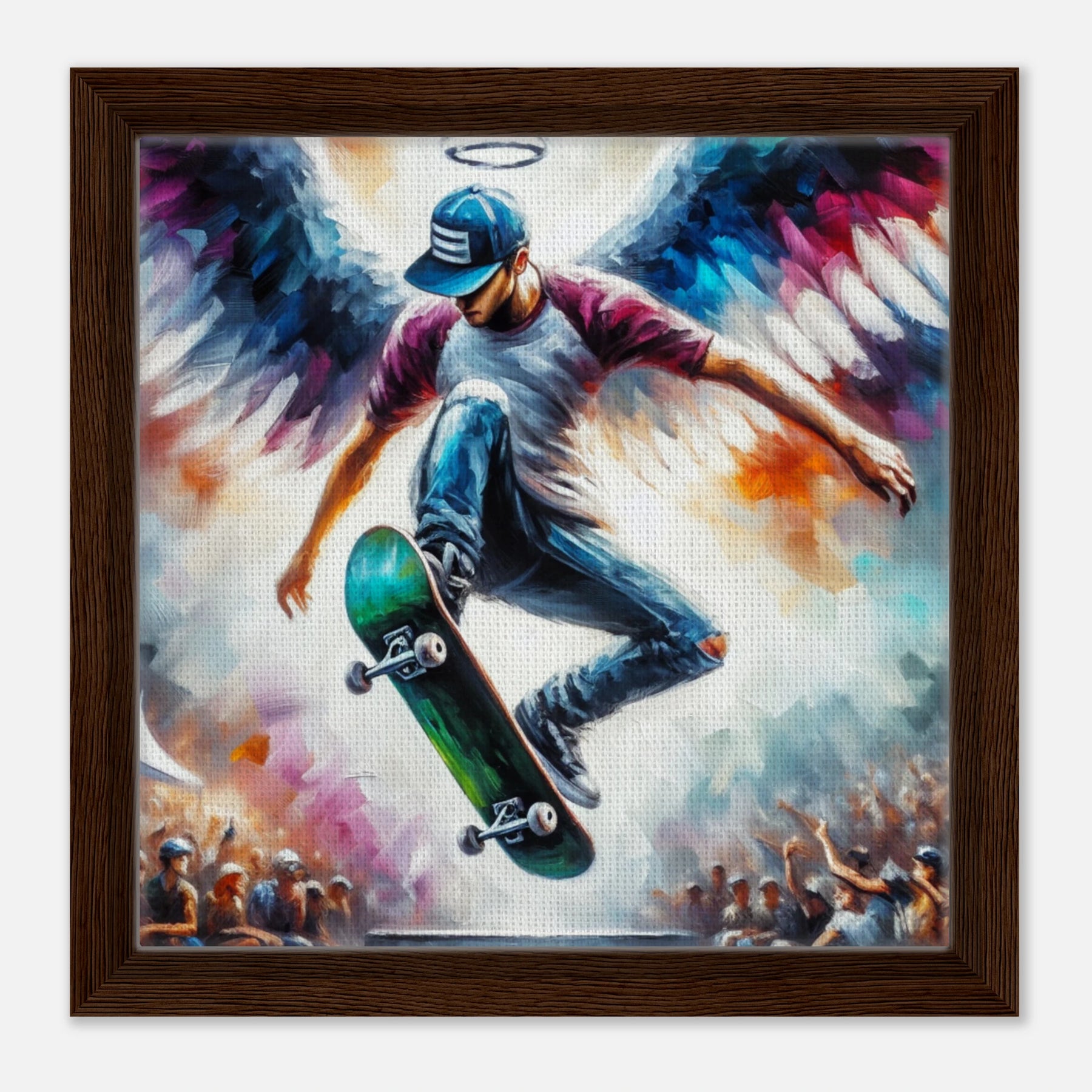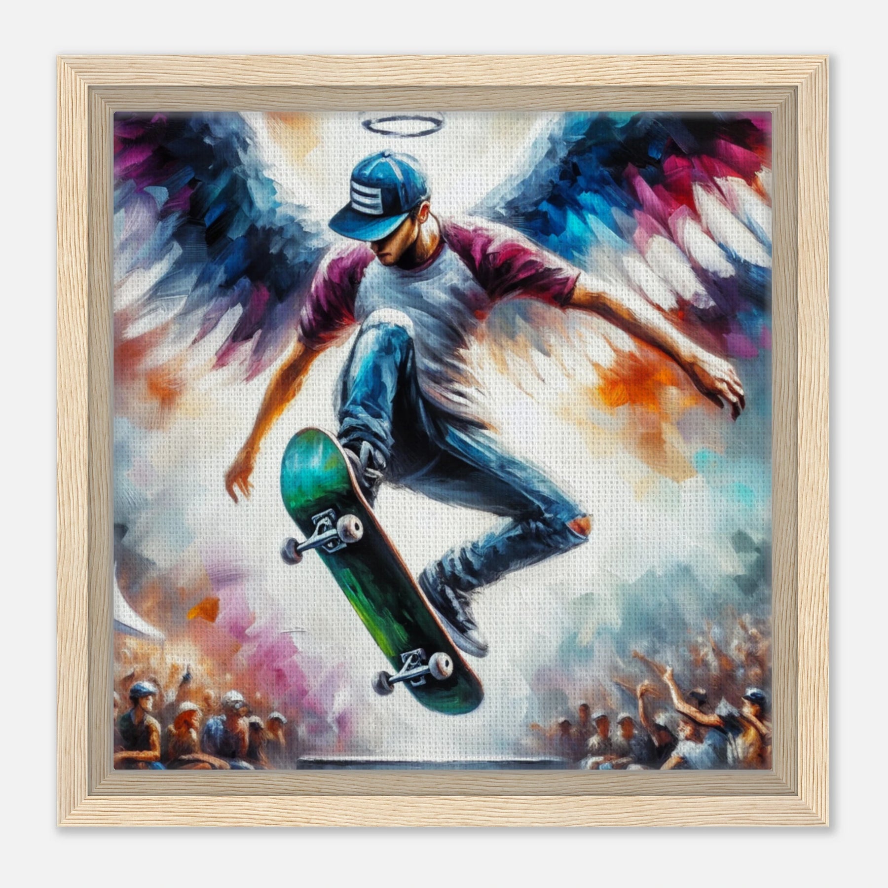 Skateboard-Engel – bunter Leinwanddruck eines verstorbenen Skaters mit Flügeln beim Olli im Himmel