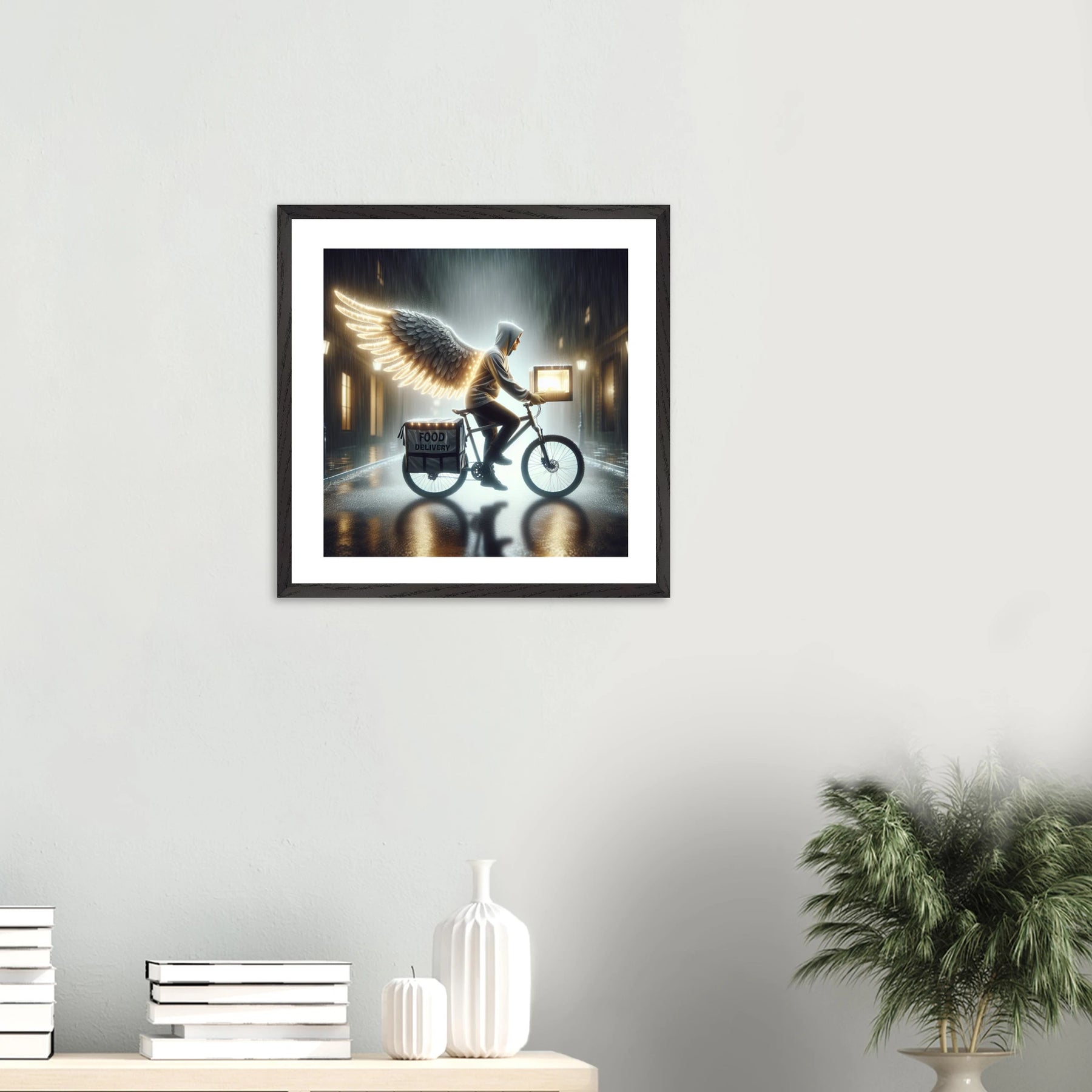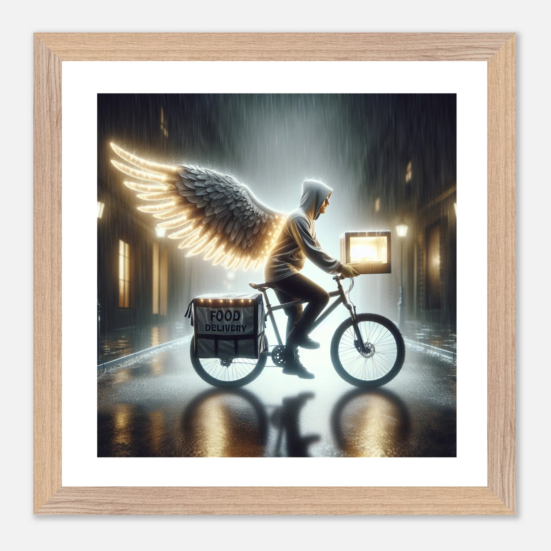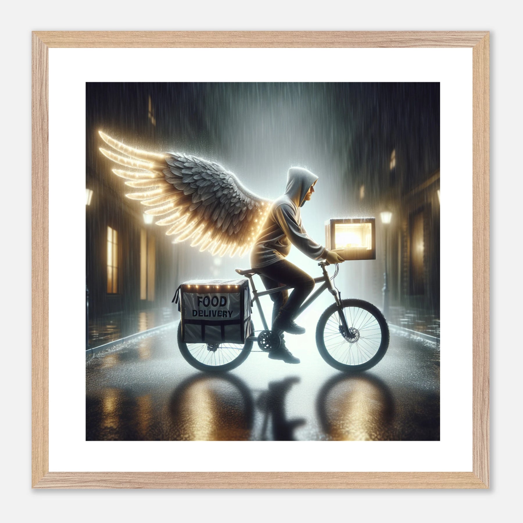 Soul Delivery – Fahrradkurier mit Engelsflügeln liefert Hoffnung und Essen in leuchtender Stadtkulisse als Poster