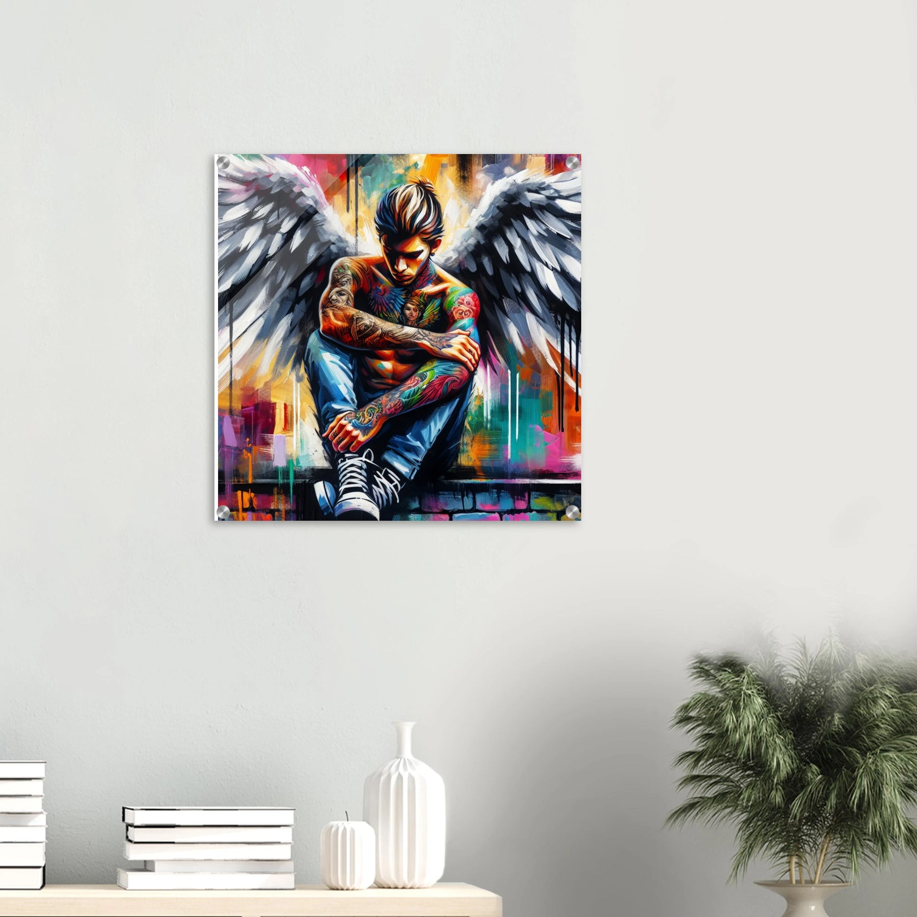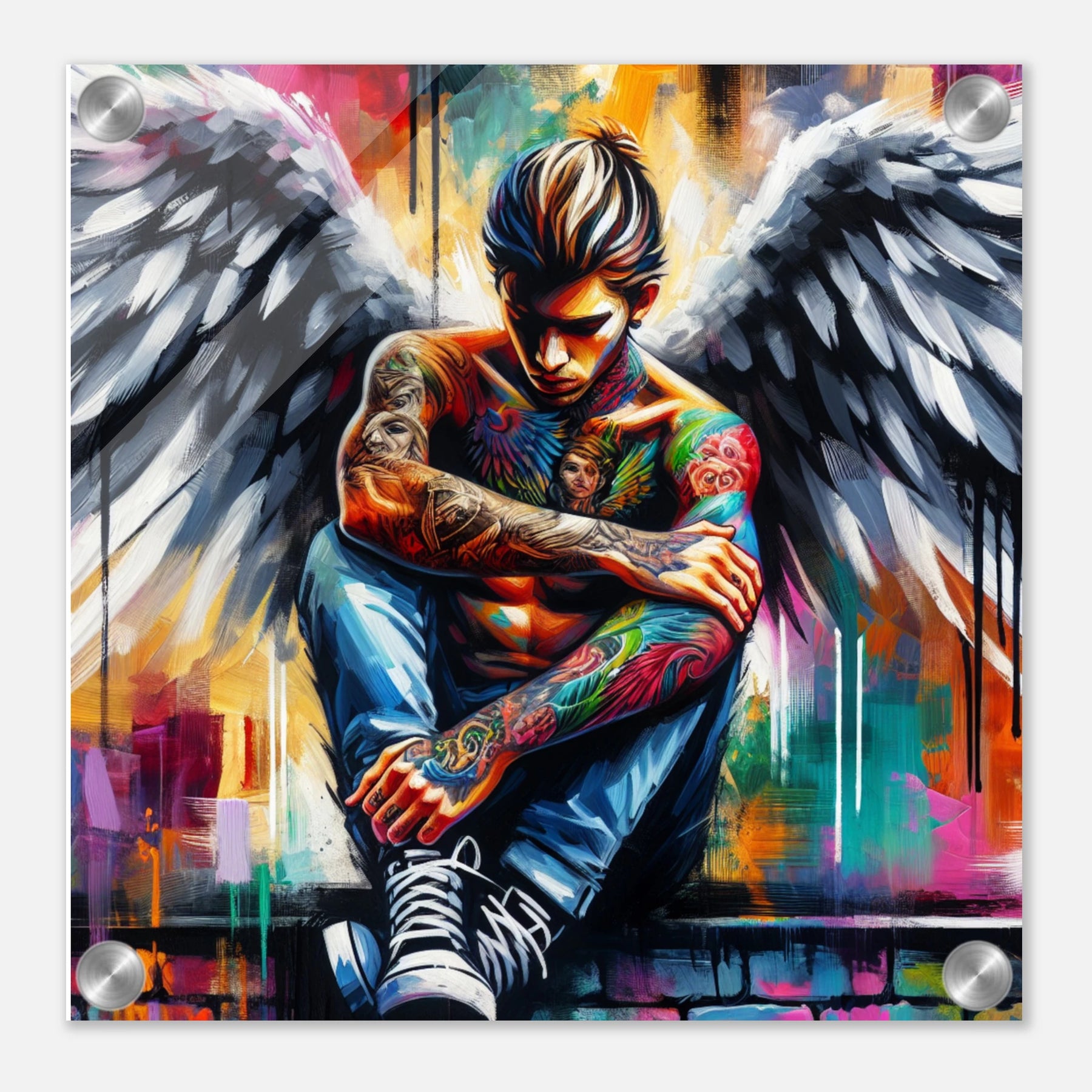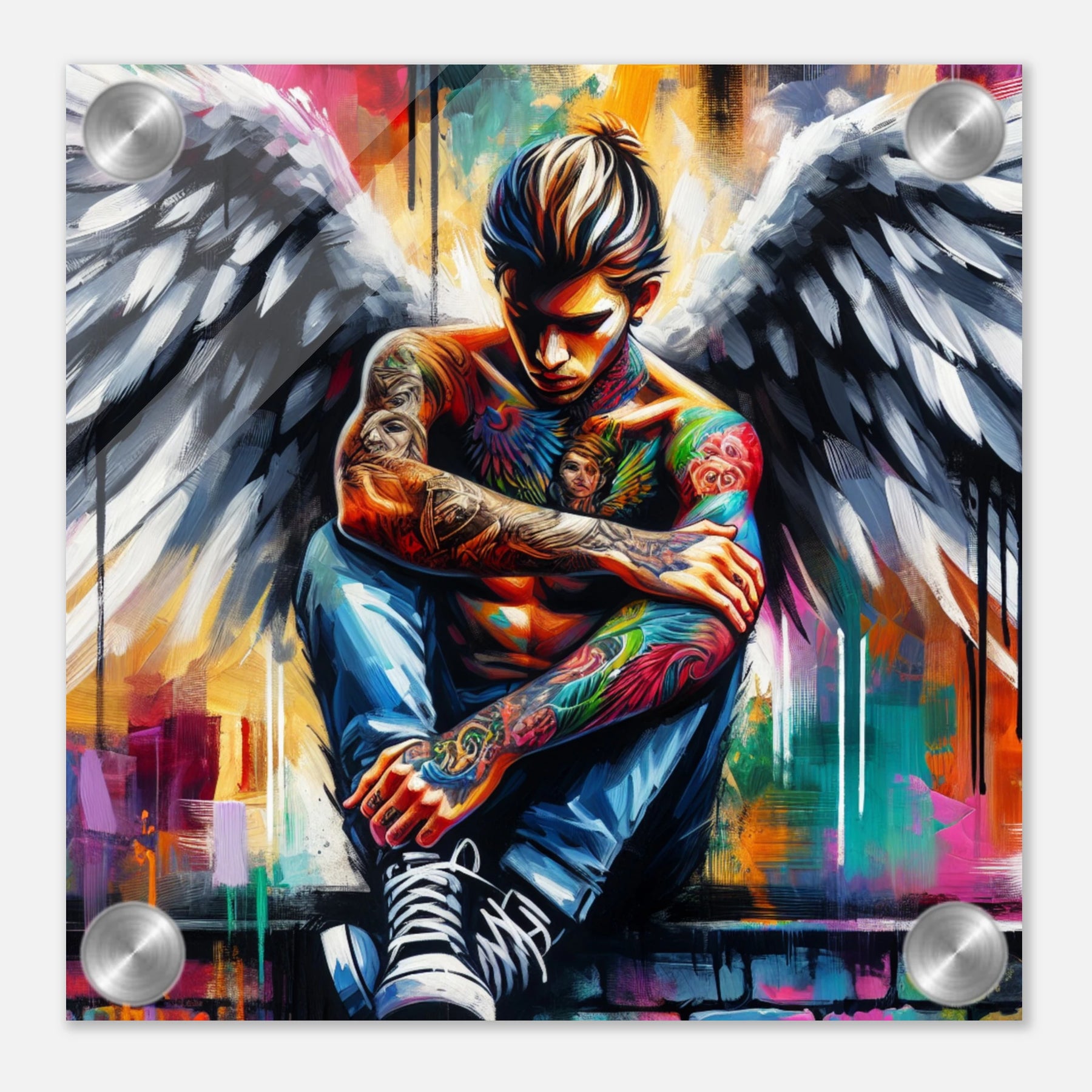 Farbenprächtiger trauriger Engel mit Tattoos – stilvoller junger Mann mit Rockabilly-Look und Flügeln auf Acrylglasdruck