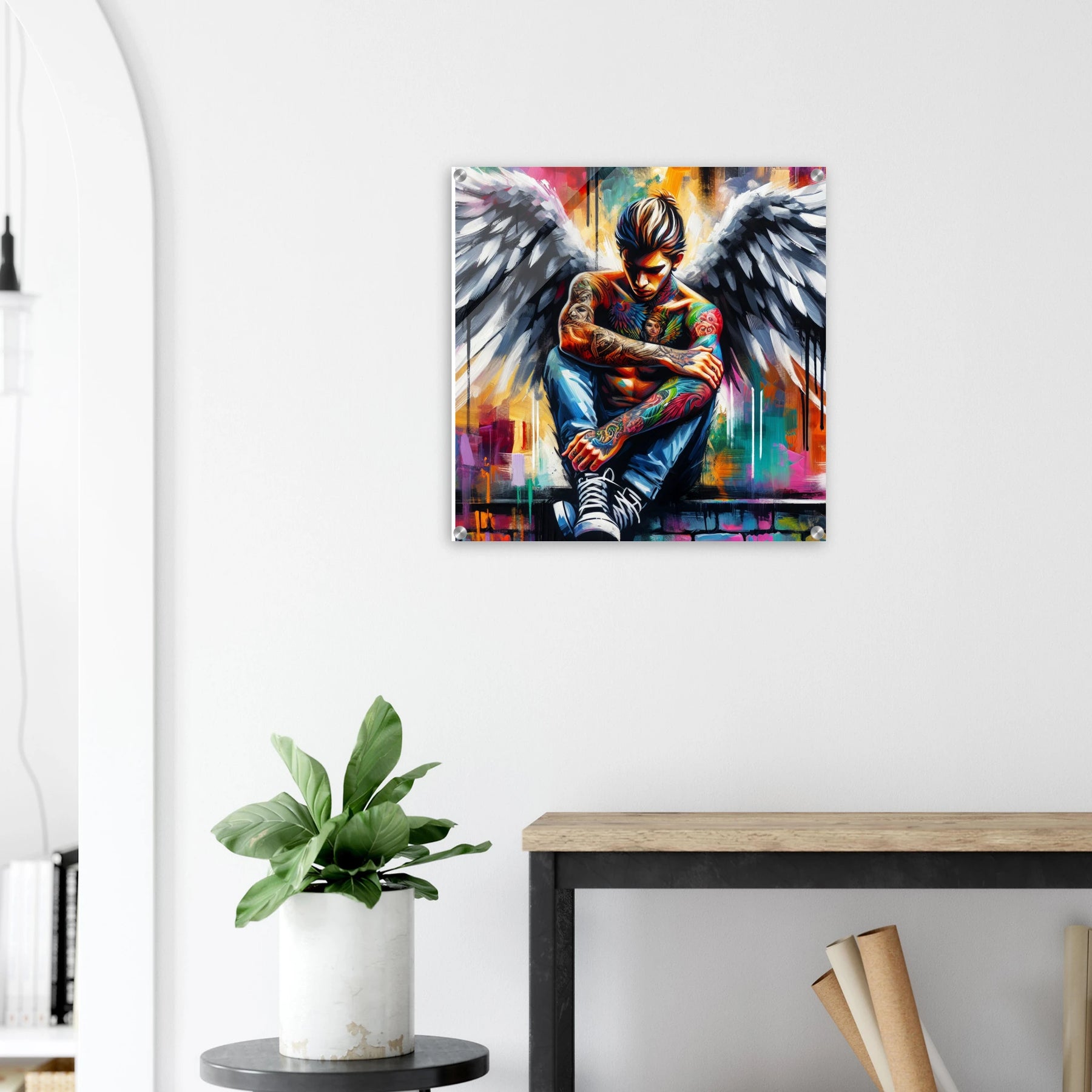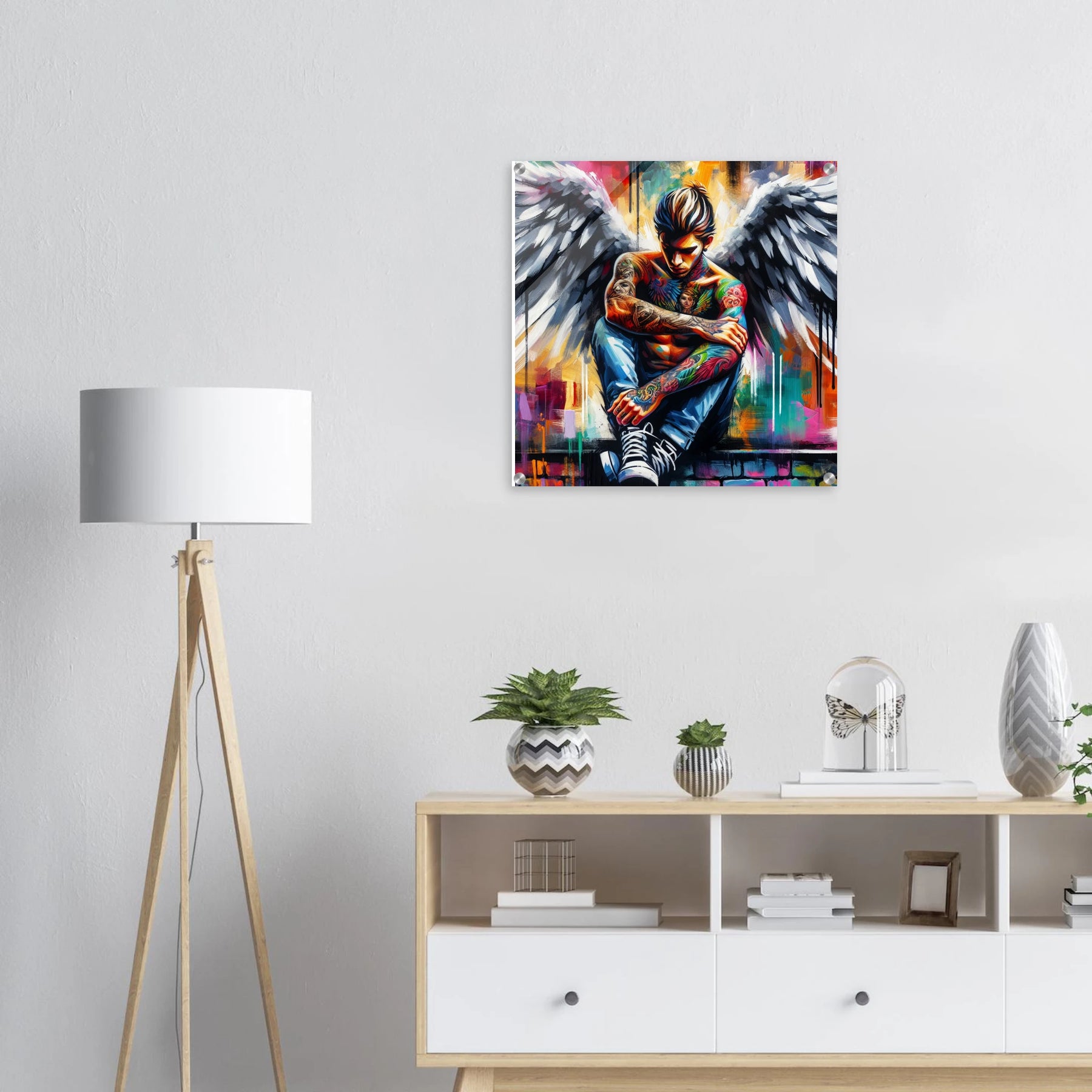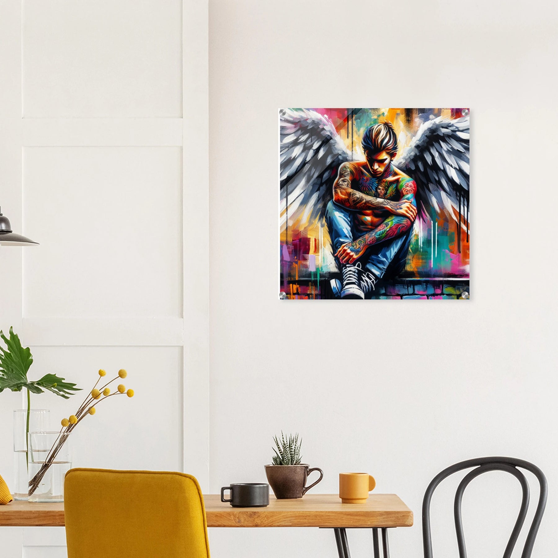 Farbenprächtiger trauriger Engel mit Tattoos – stilvoller junger Mann mit Rockabilly-Look und Flügeln auf Acrylglasdruck