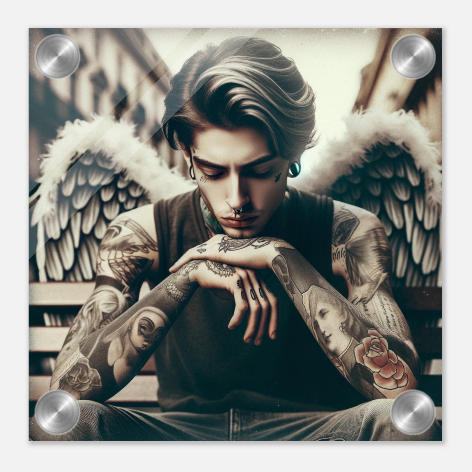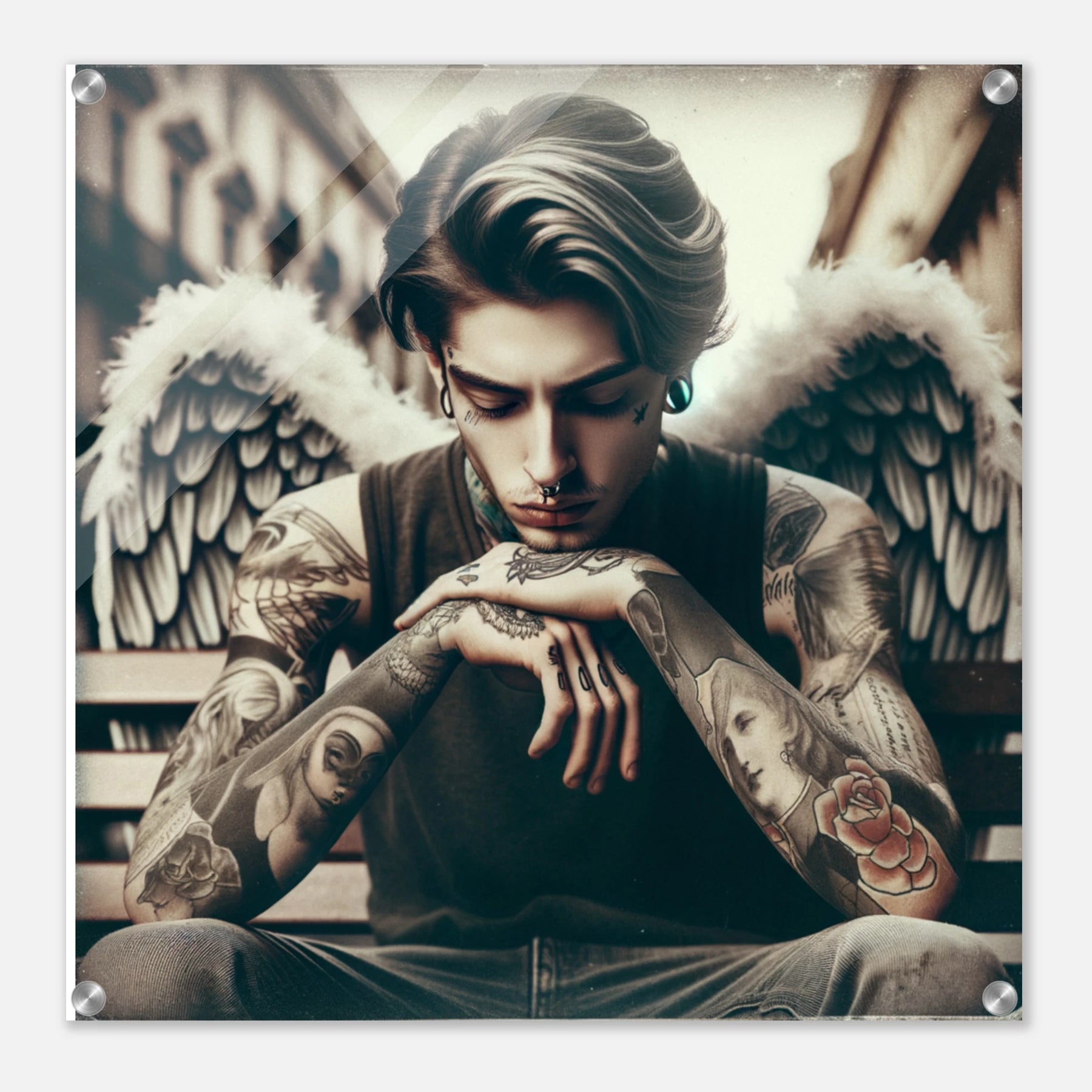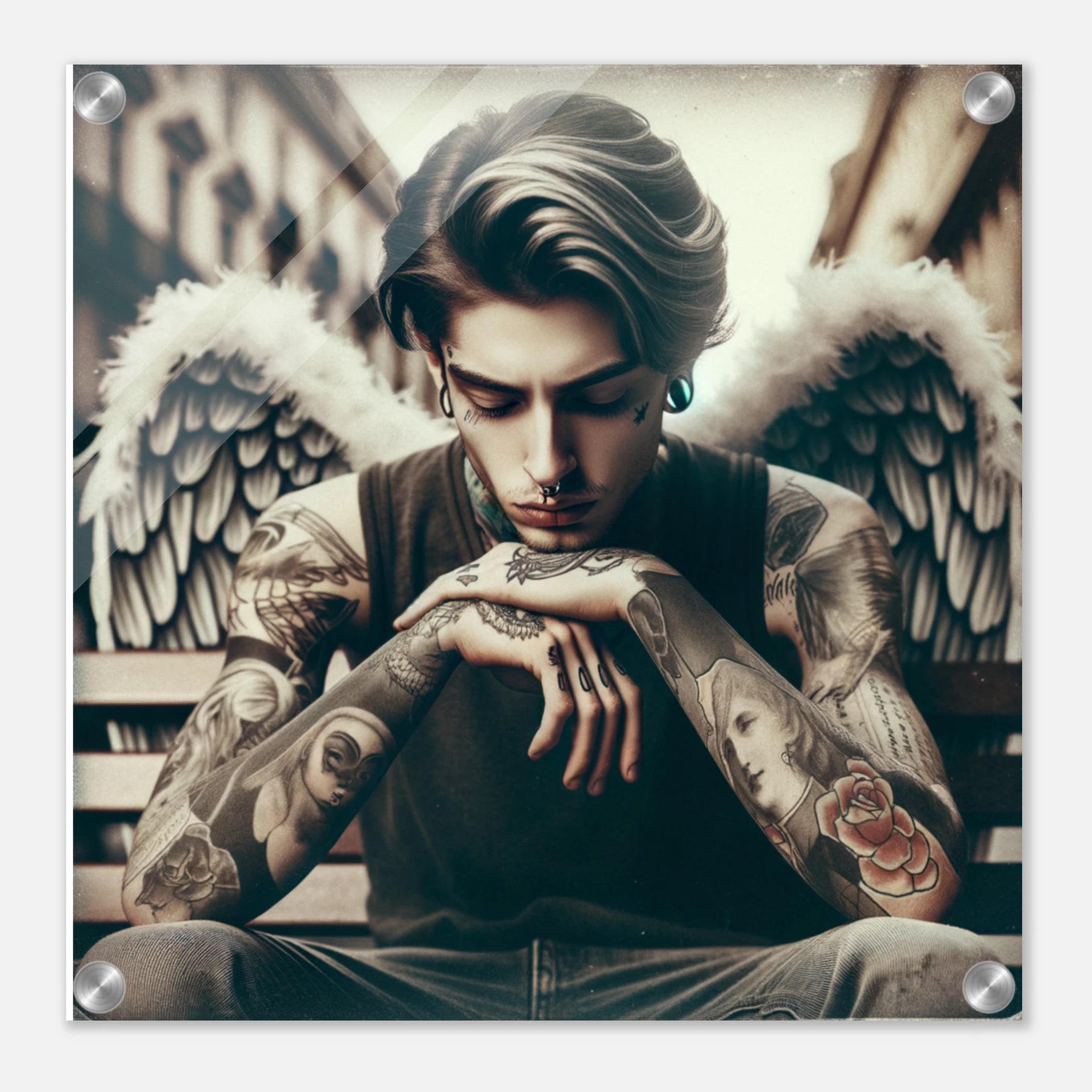 Urbaner Engel mit Tattoos – jugendlicher Außenseiter als spirituelles Motiv auf Acrylglas