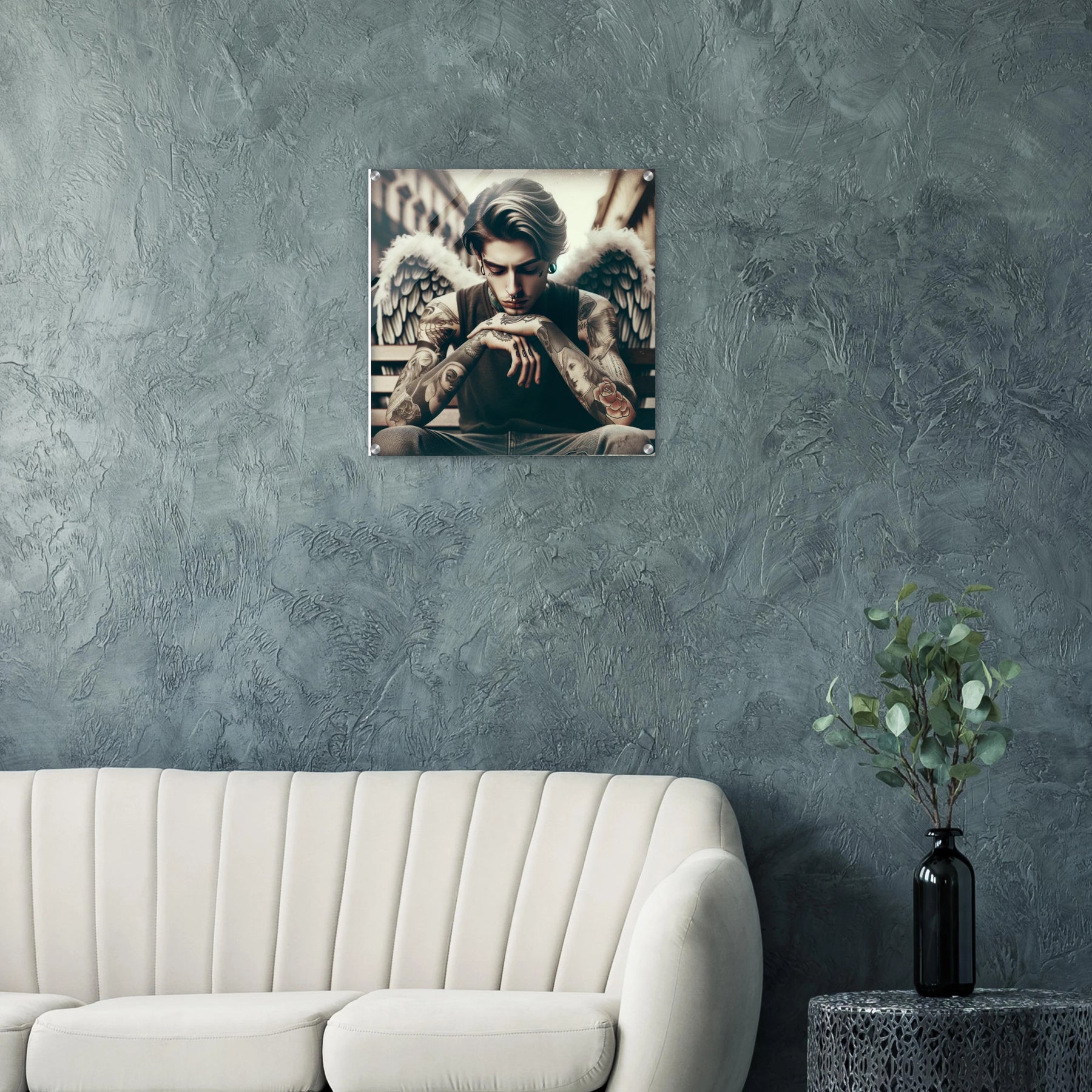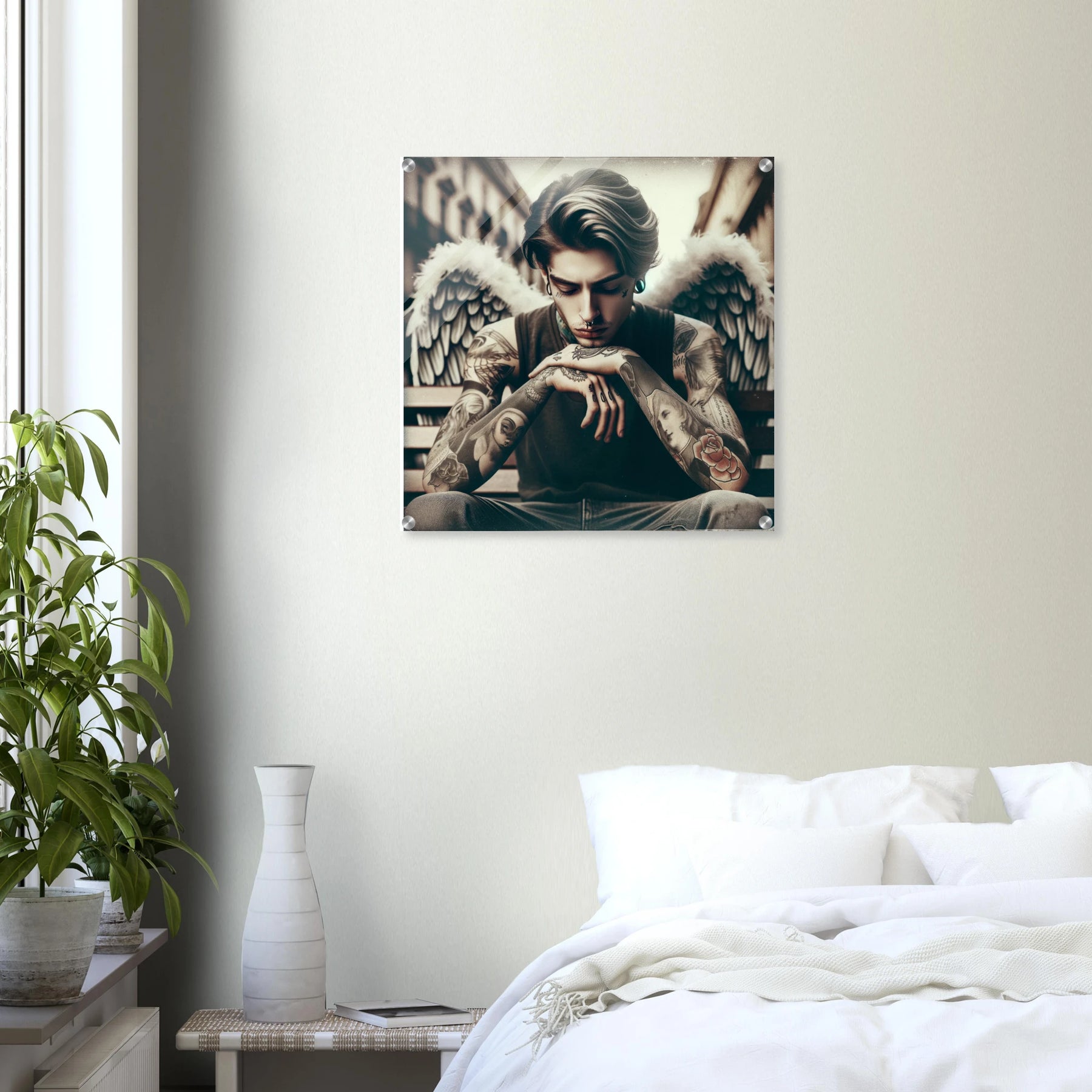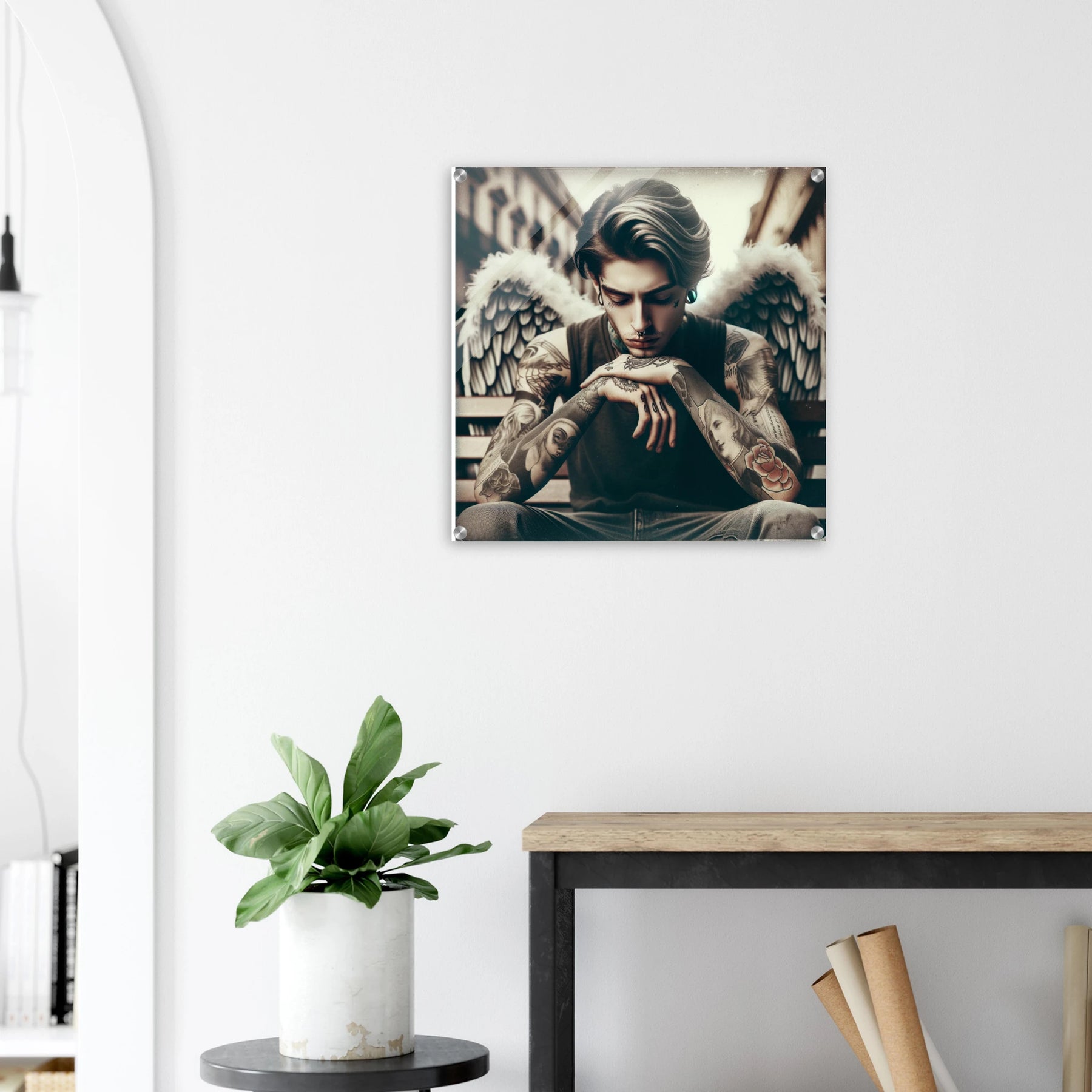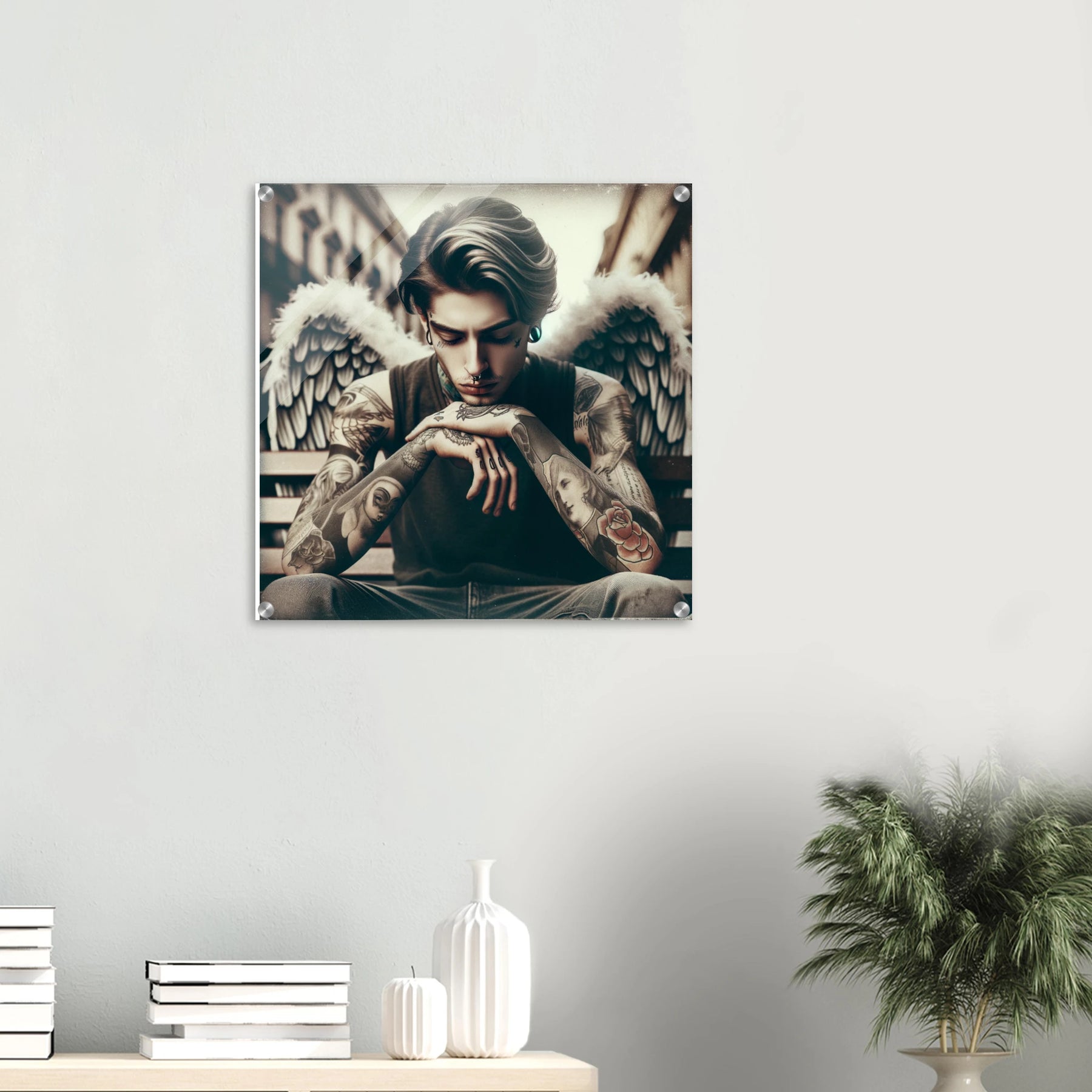 Urbaner Engel mit Tattoos – jugendlicher Außenseiter als spirituelles Motiv auf Acrylglas