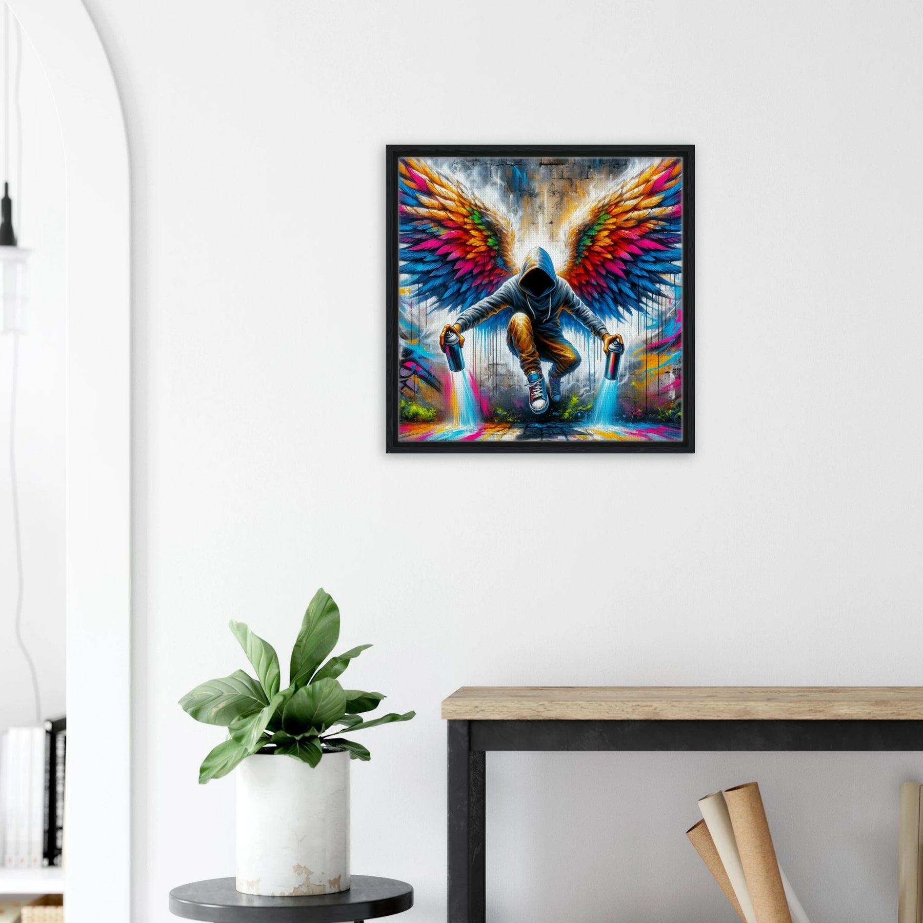 Urbaner Engel als Graffiti – farbenfrohes Street Art Kunstwerk mit Flügeln in Neonfarben auf Leinwand