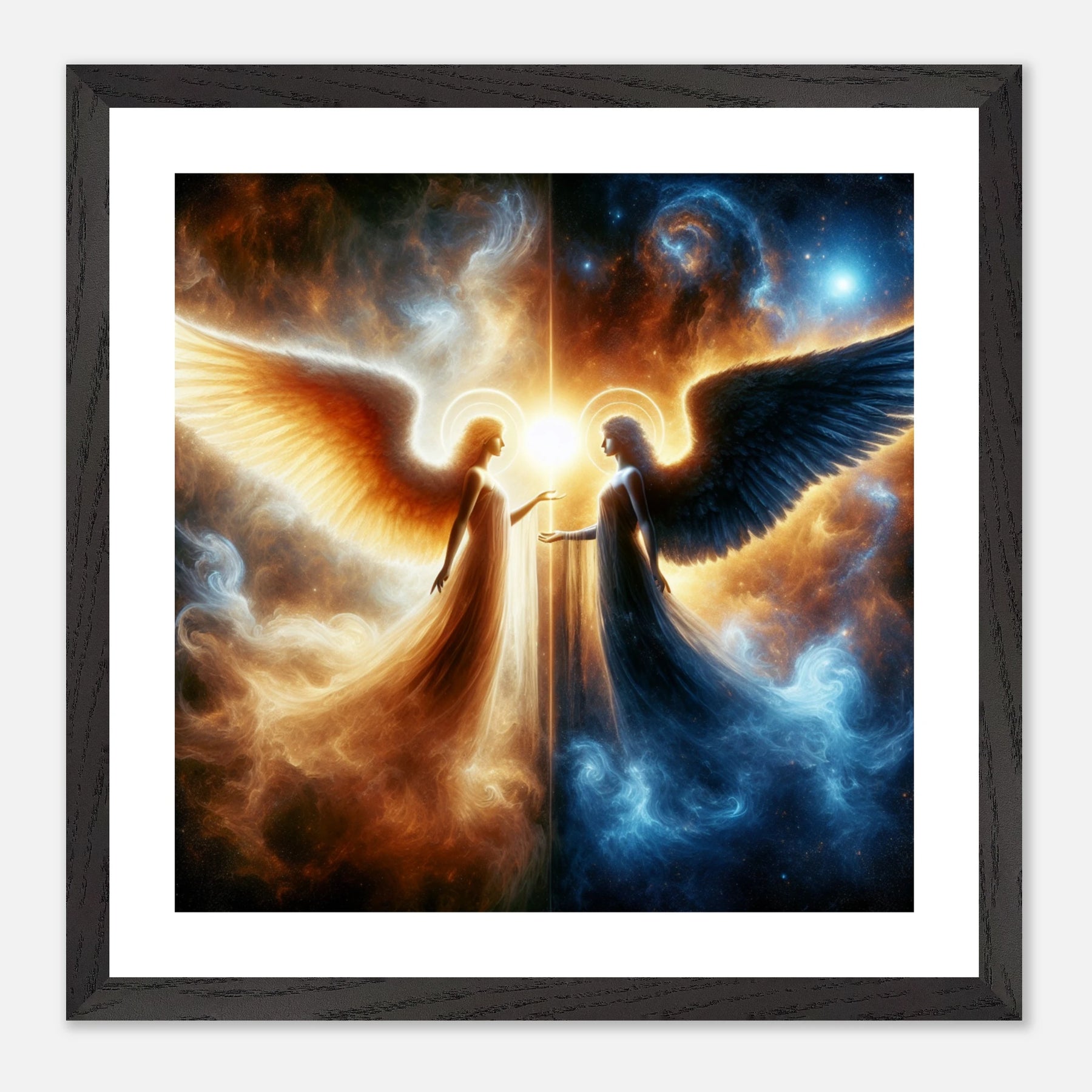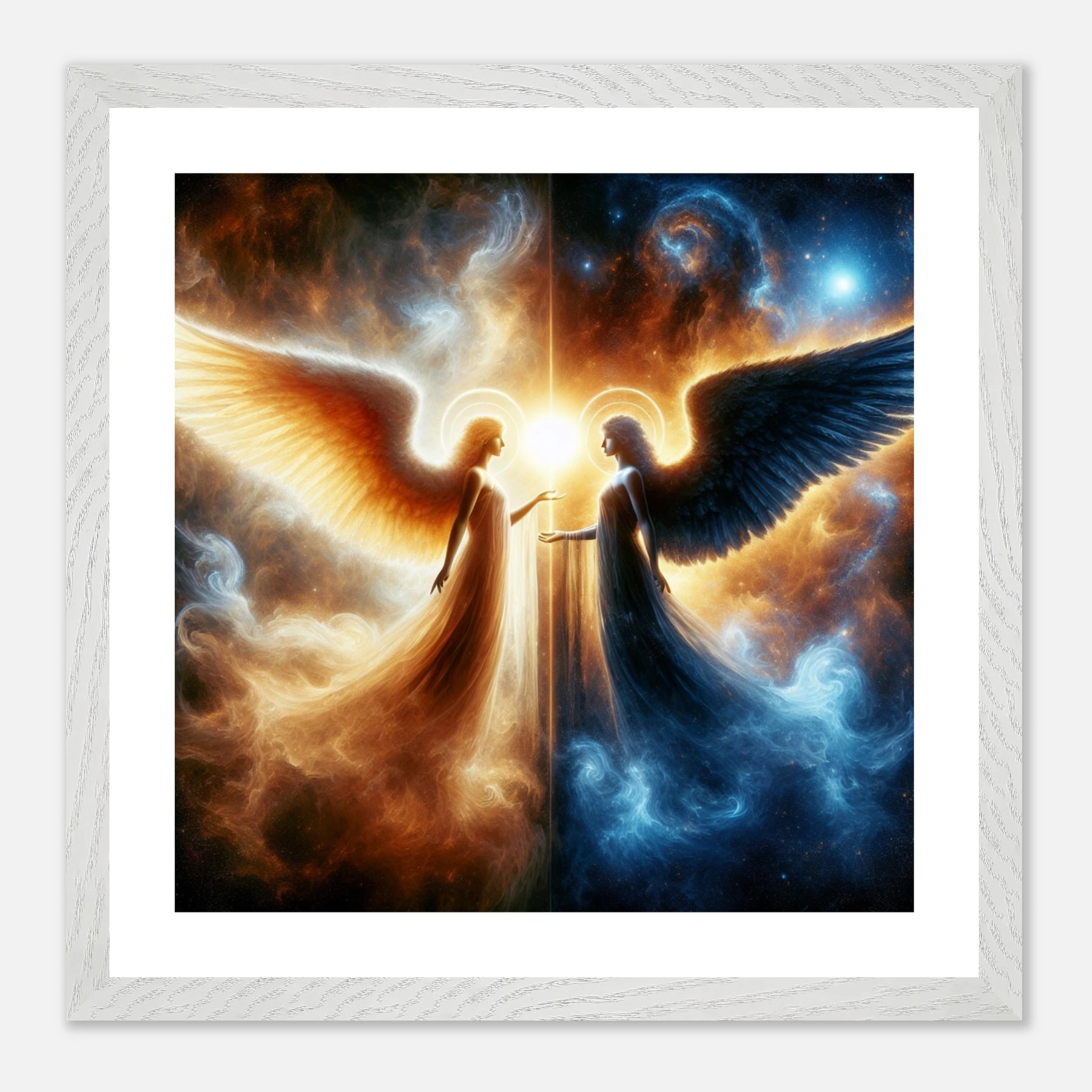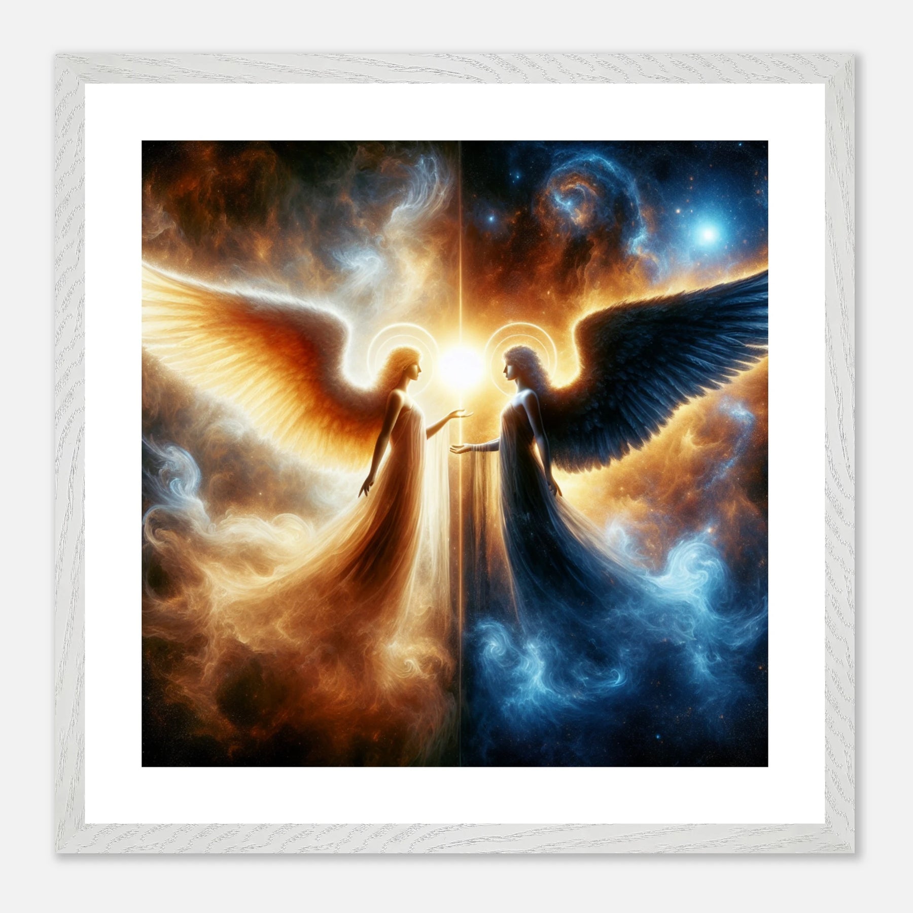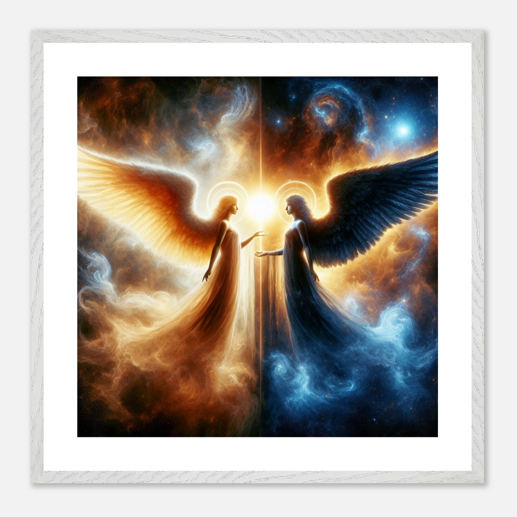 Gerahmtes Premium-Poster: Zwei Engel im Weltraum gegenübergestellt, heller Schutzengel und kühler dunkler Engel, inspirierende Wandkunst für Meditationsräume und Sci-Fi-Enthusiasten