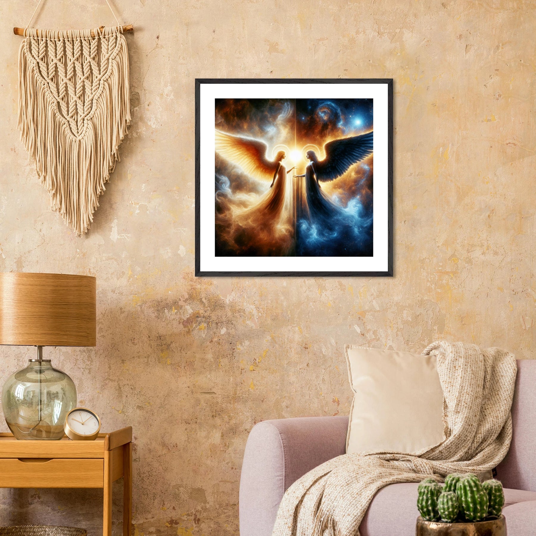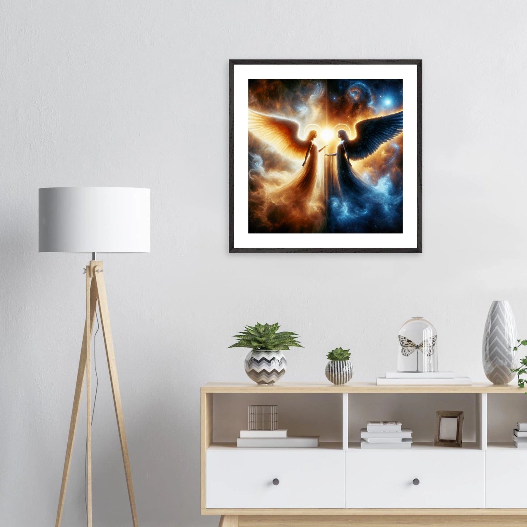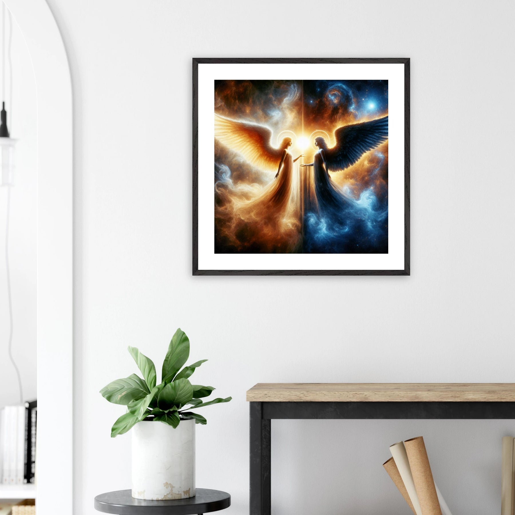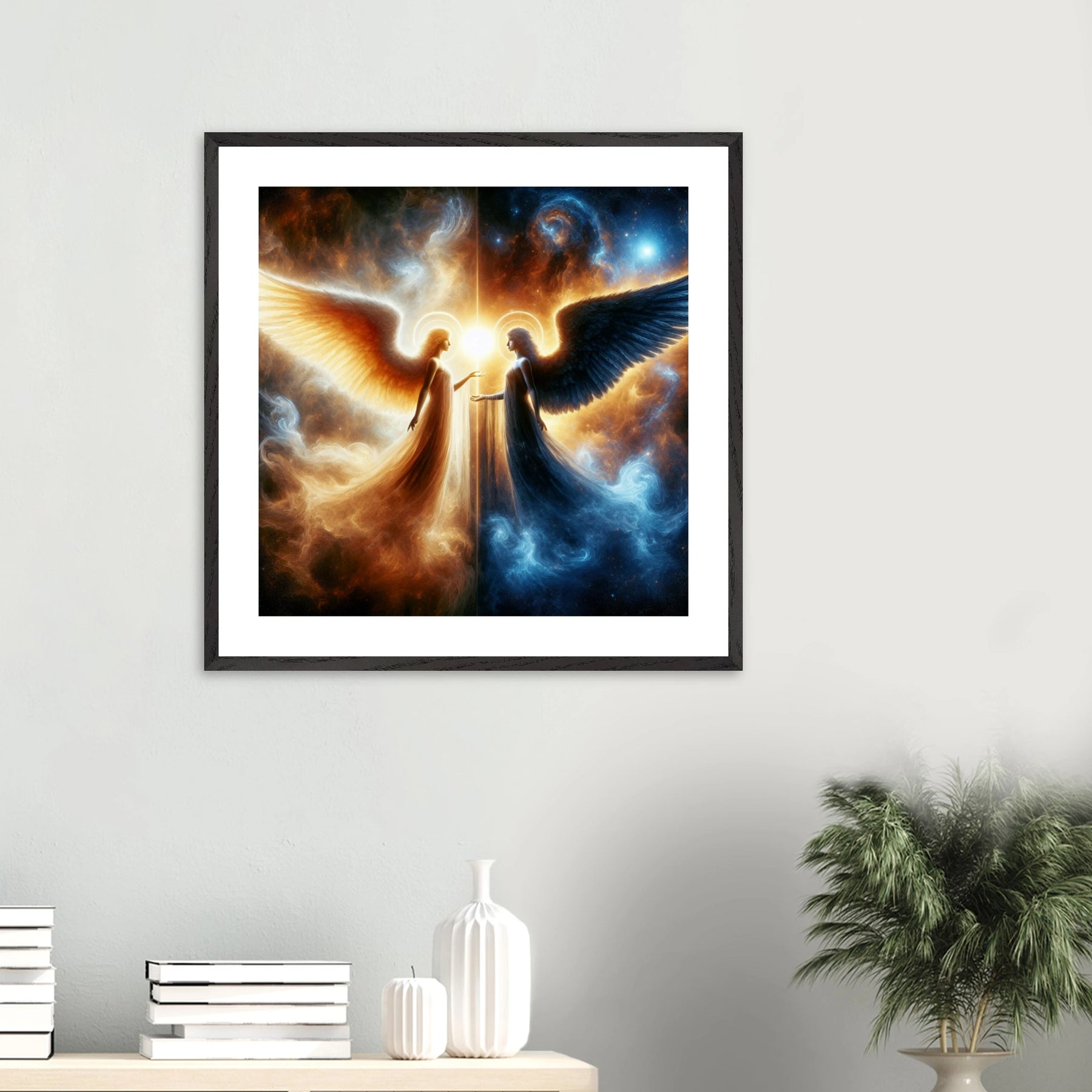Gerahmtes Premium-Poster: Zwei Engel im Weltraum gegenübergestellt, heller Schutzengel und kühler dunkler Engel, inspirierende Wandkunst für Meditationsräume und Sci-Fi-Enthusiasten