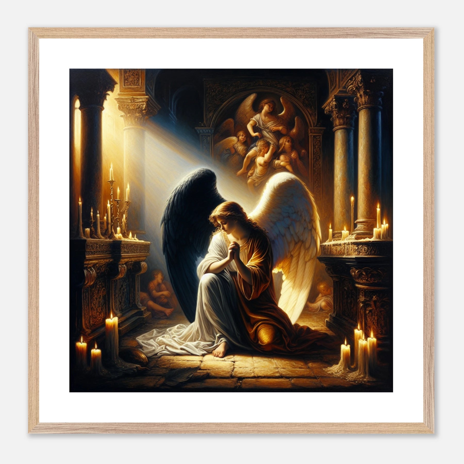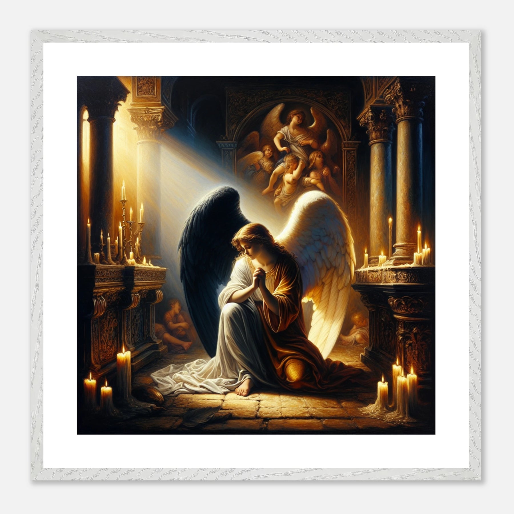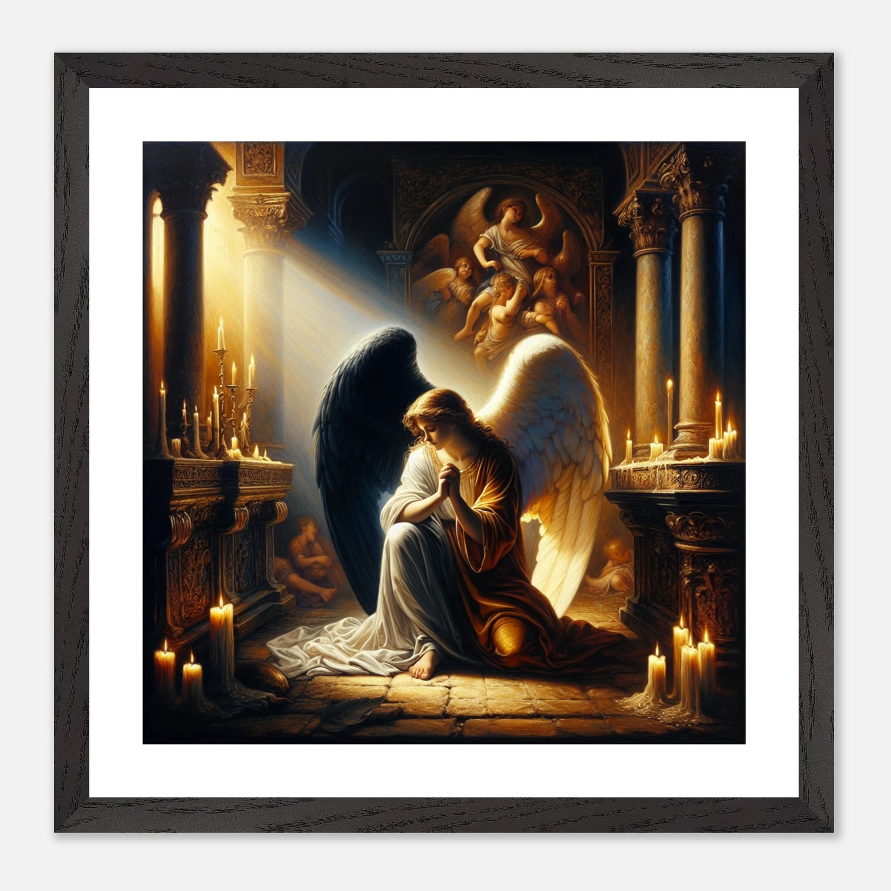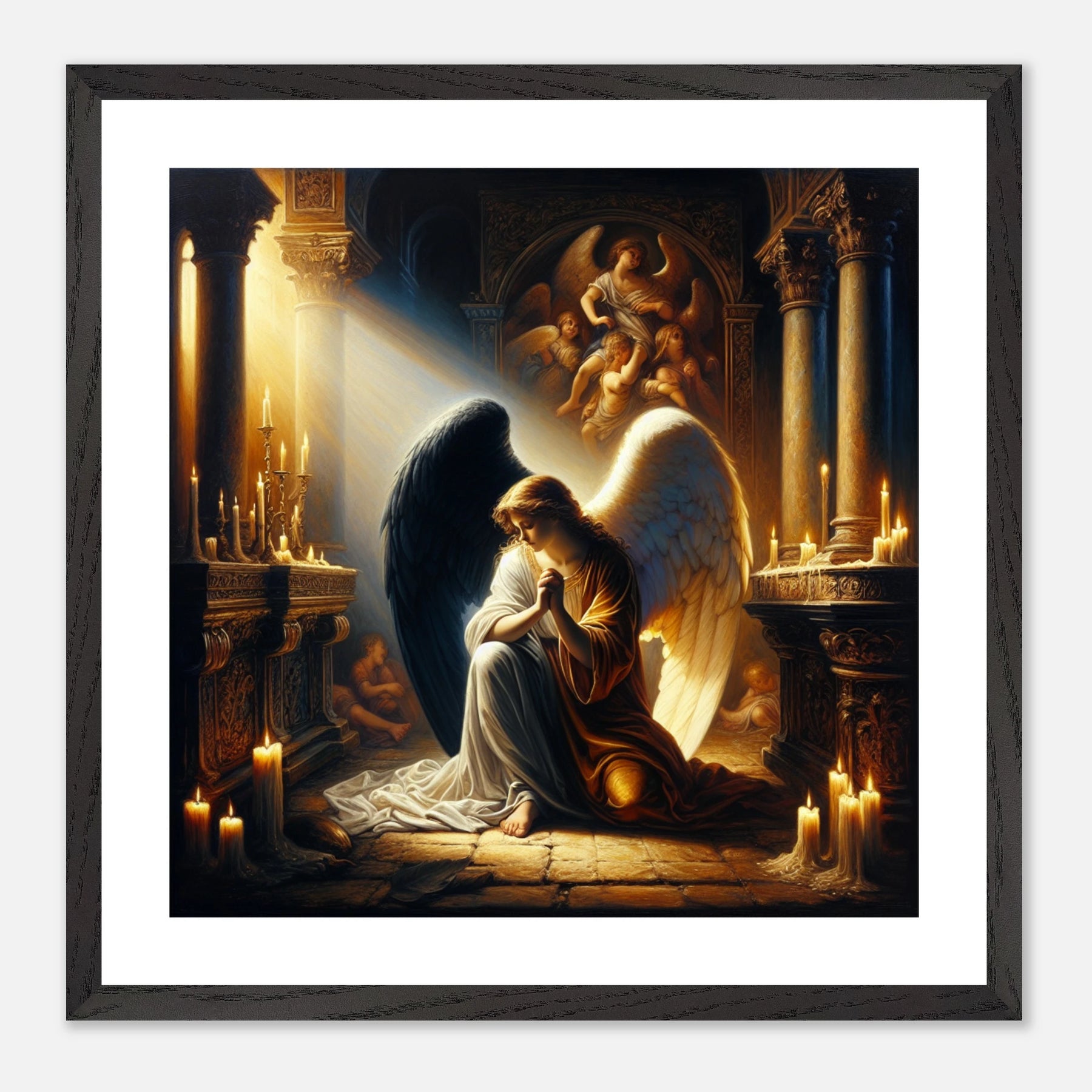 Gerahmtes Premium-Poster: Engel mit schwarzen und weißen Flügeln, betend vor dem Altar einer Kirche im Kerzenschein, ideale Wandkunst für Schlafzimmer oder Gebetsraum