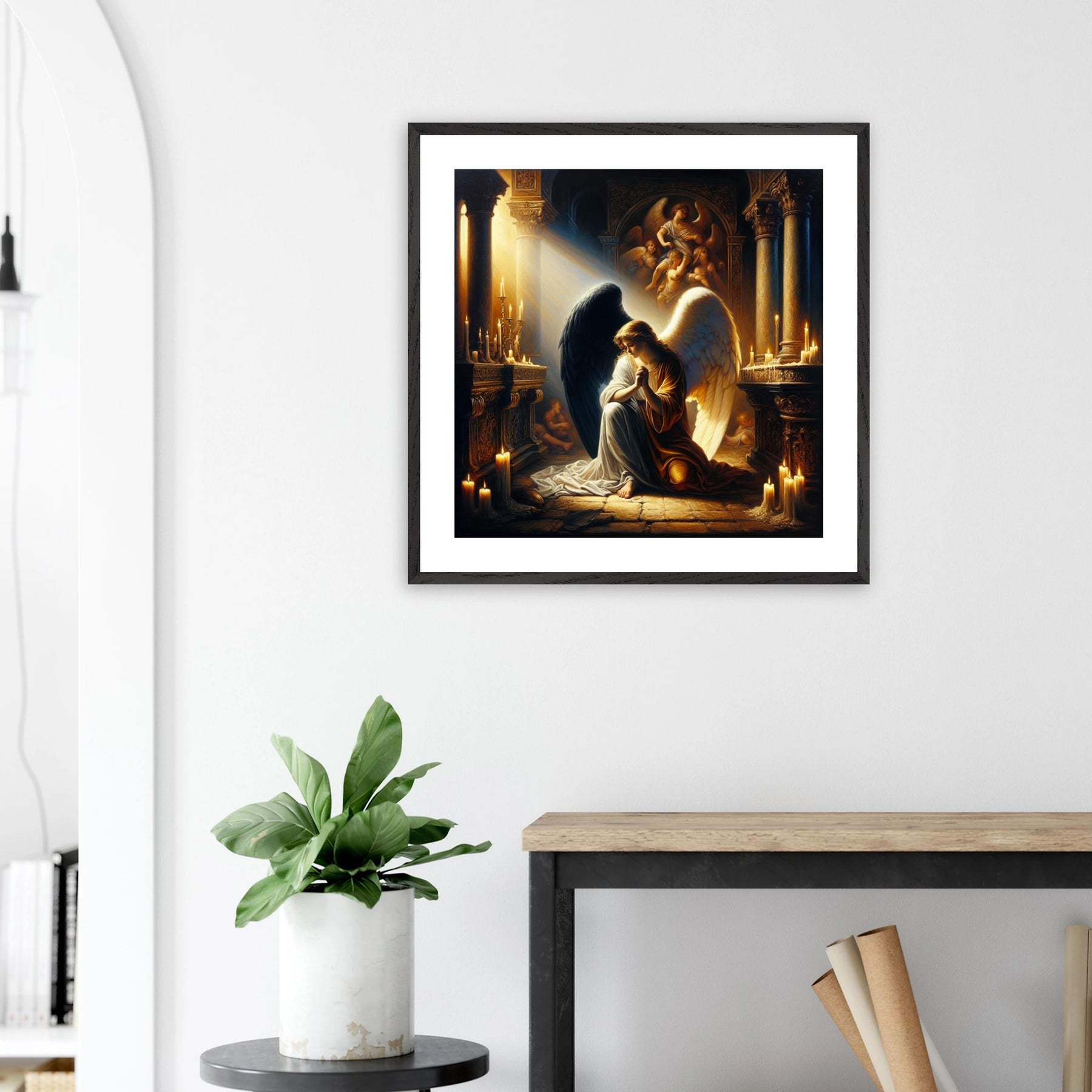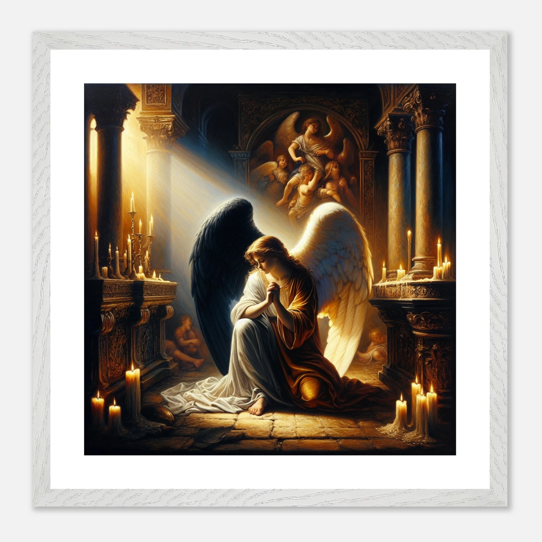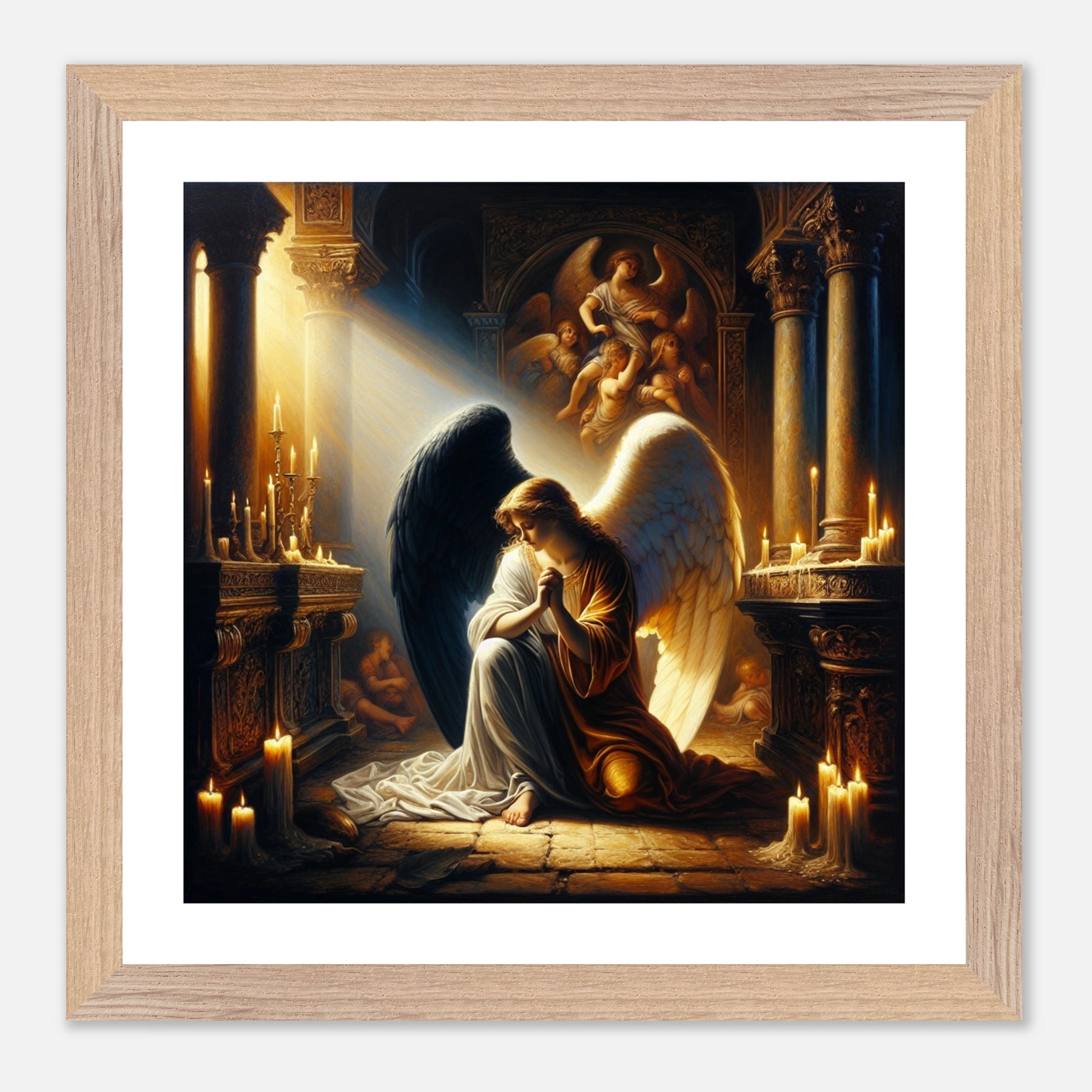 Gerahmtes Premium-Poster: Engel mit schwarzen und weißen Flügeln, betend vor dem Altar einer Kirche im Kerzenschein, ideale Wandkunst für Schlafzimmer oder Gebetsraum