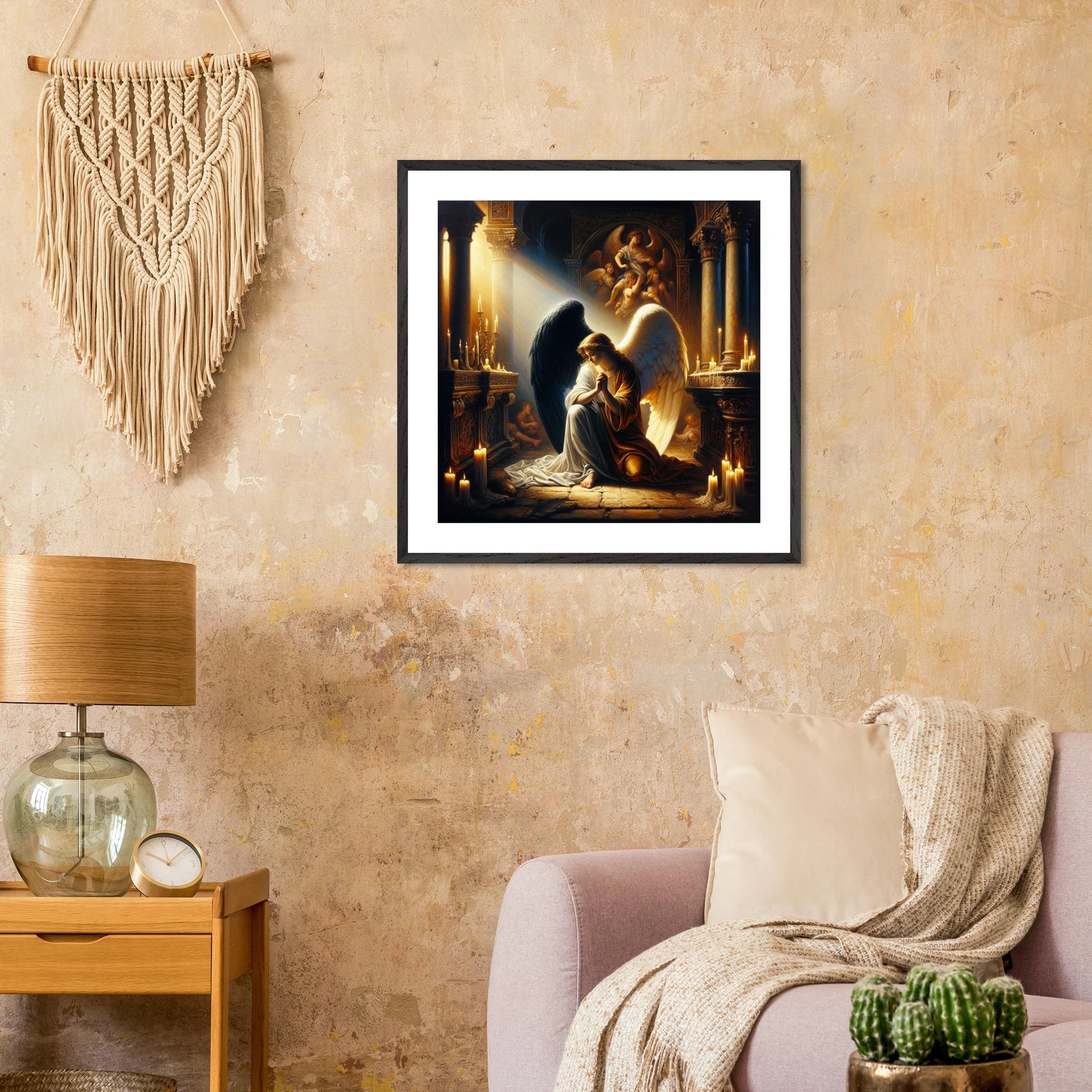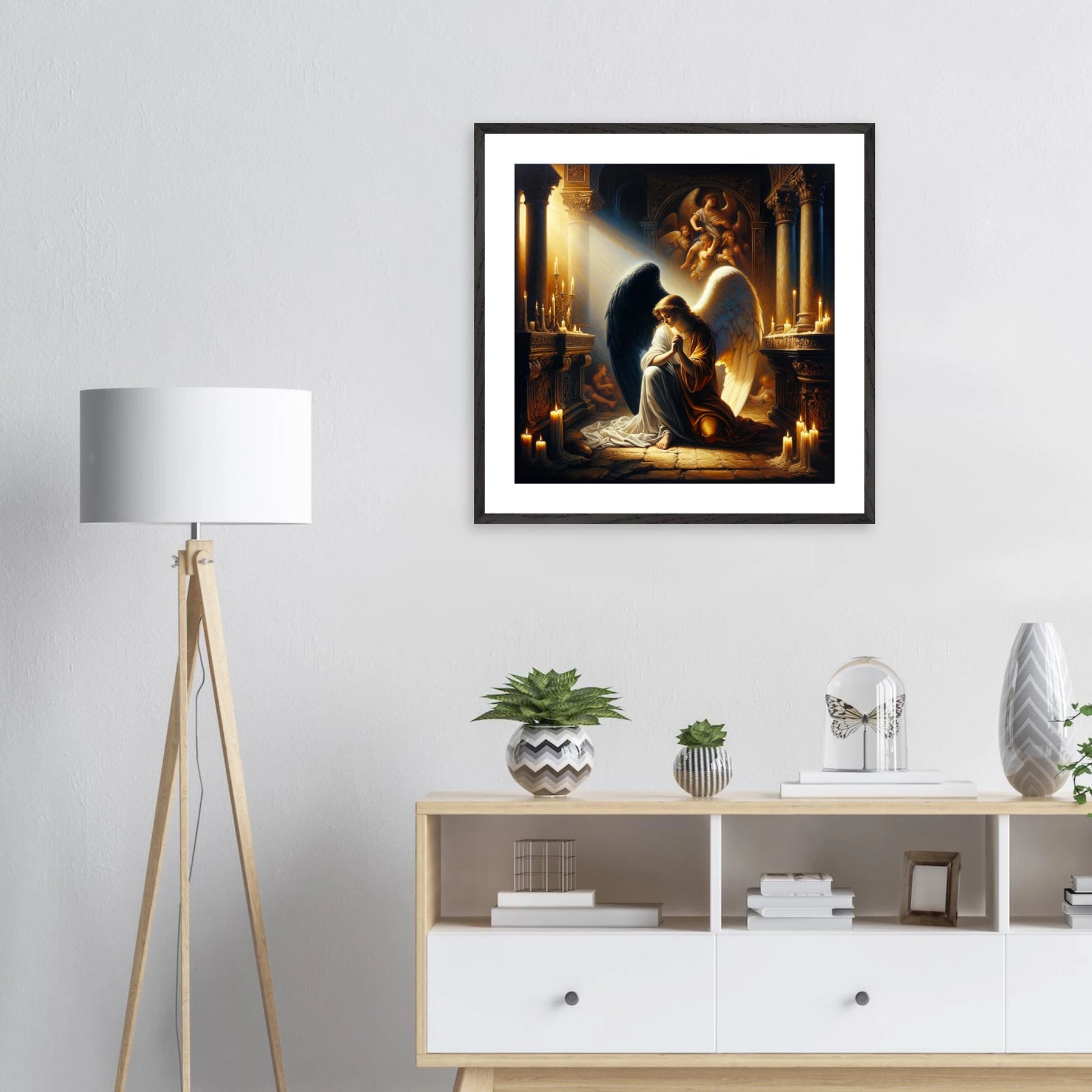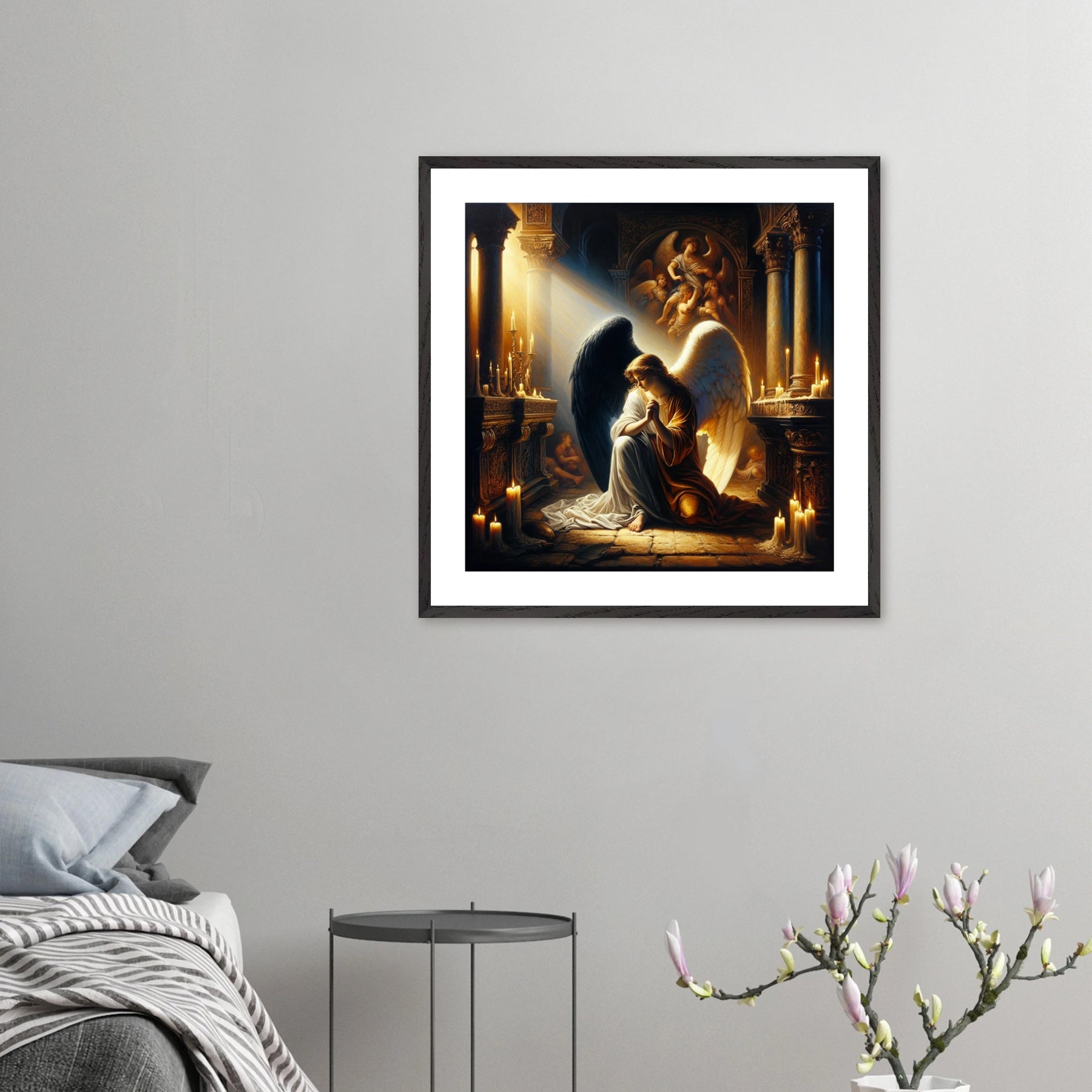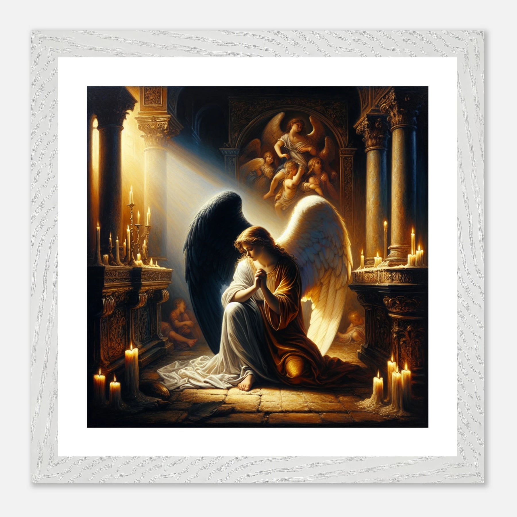 Gerahmtes Premium-Poster: Engel mit schwarzen und weißen Flügeln, betend vor dem Altar einer Kirche im Kerzenschein, ideale Wandkunst für Schlafzimmer oder Gebetsraum