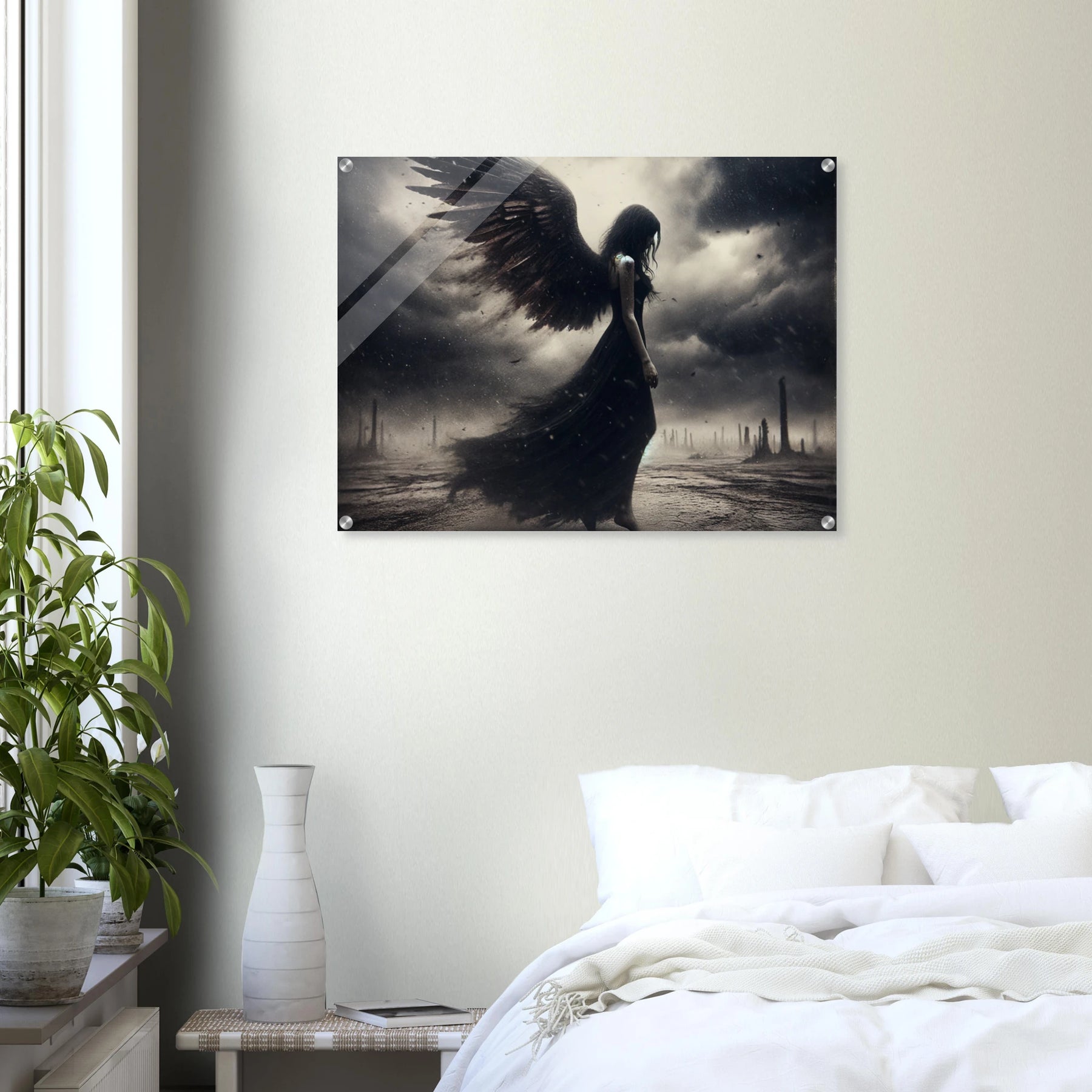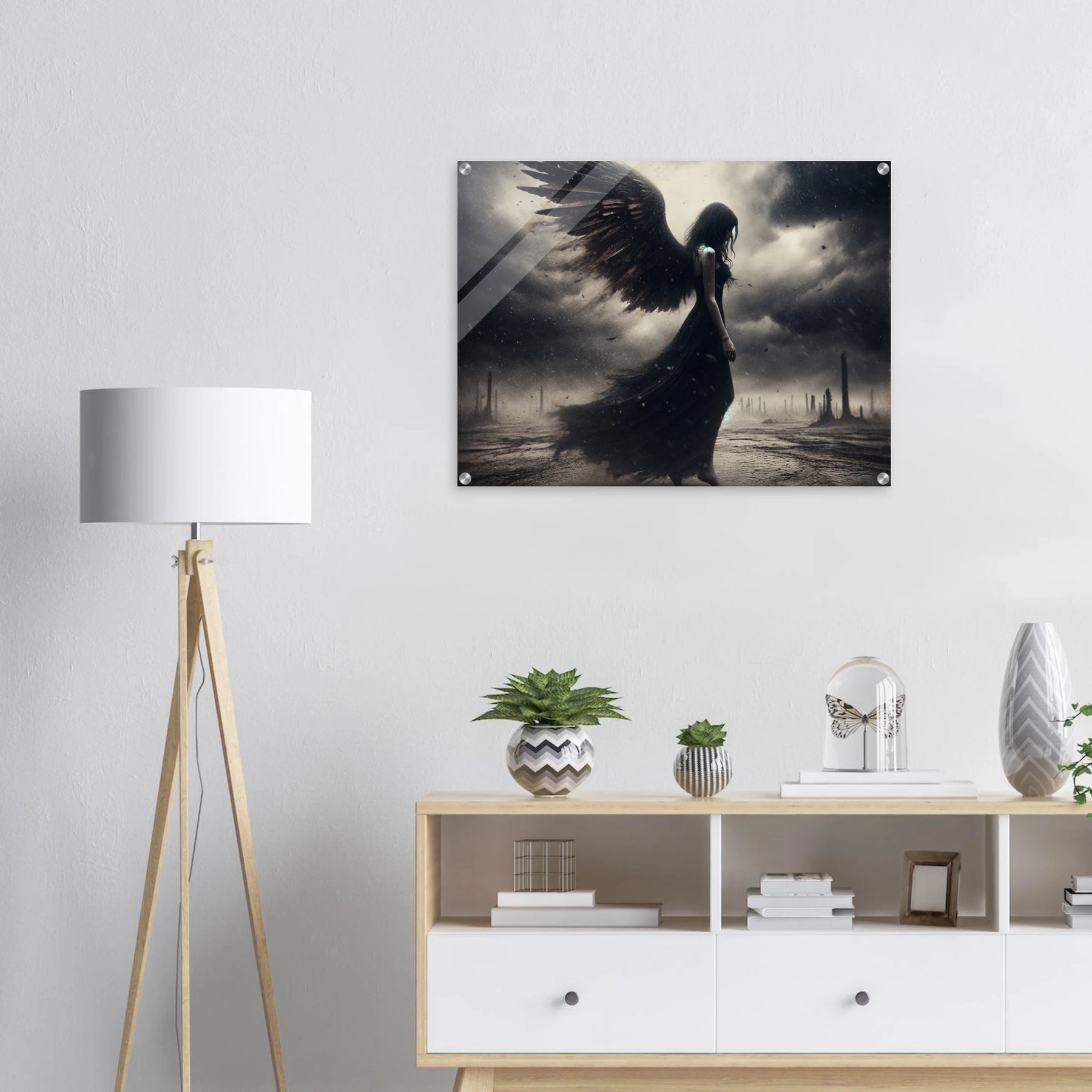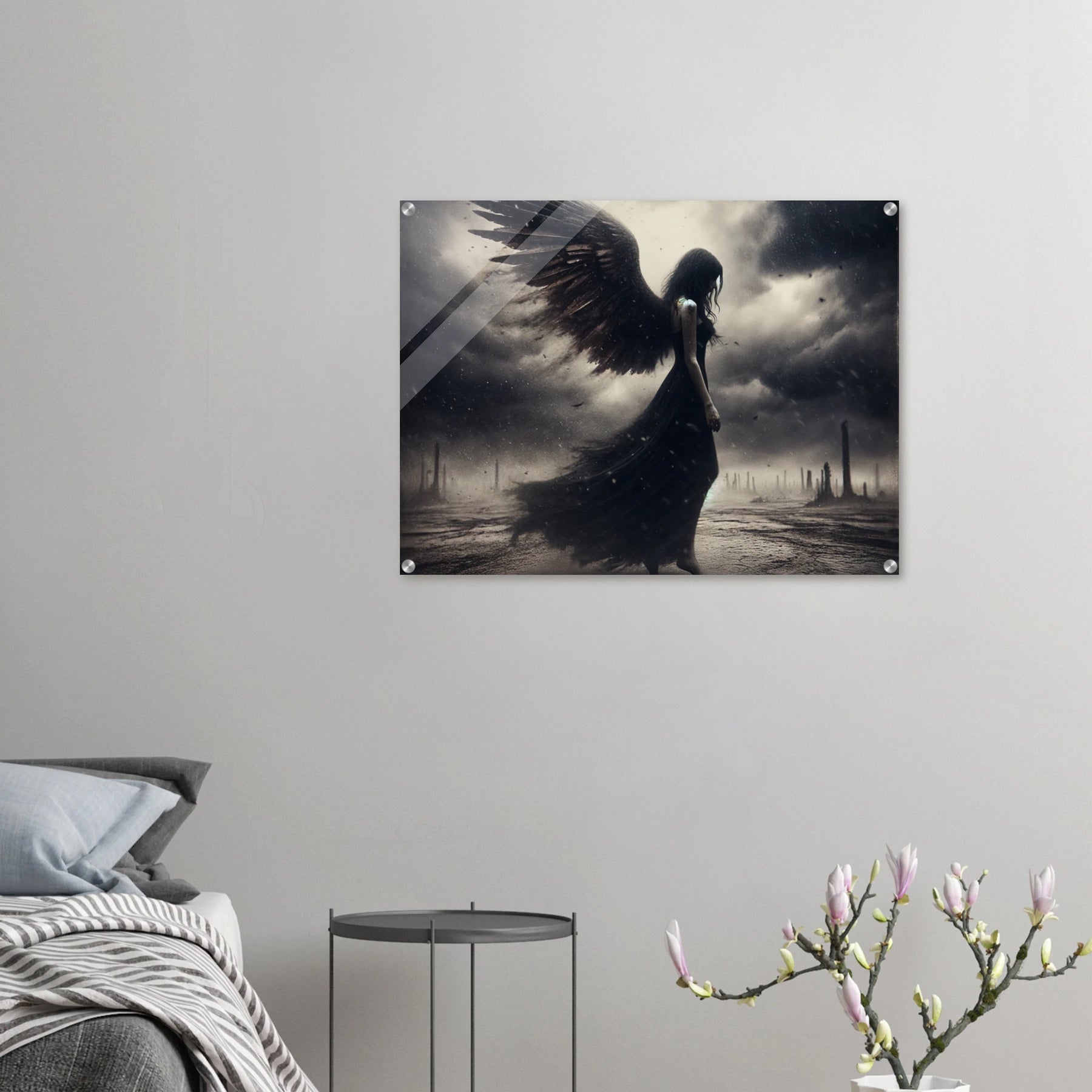 Acrylglasdruck: Todesengel in schwarz wandelt auf einer Erde aus Staub und Asche, bedrückte und traurige Stimmung, eindrucksvolle Wandkunst für Liebhaber düsterer und melancholischer Szenen