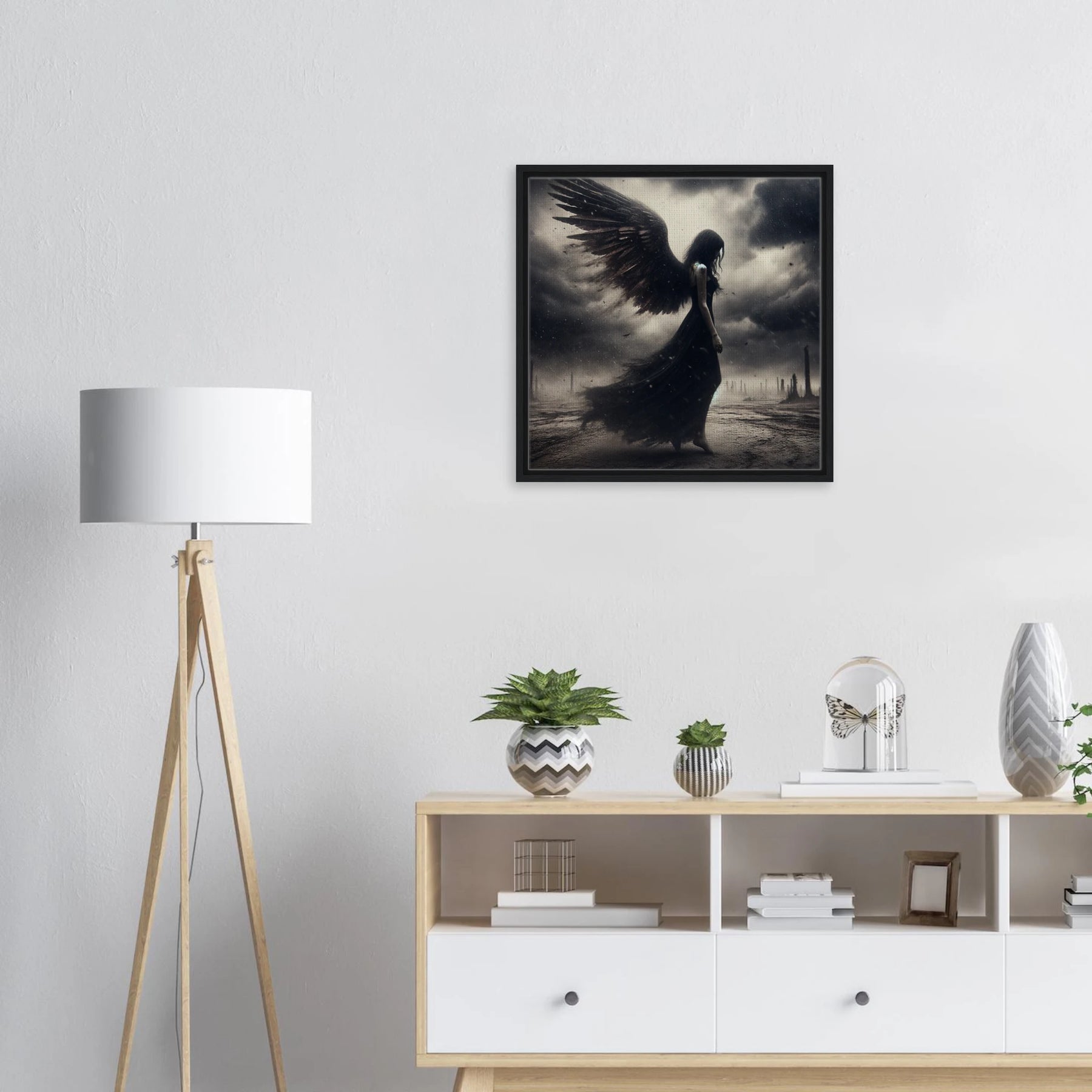 Gerahmte Leinwand: Ashes of the Forsaken, schwarzer Todesengel auf einer Erde aus Staub und Asche, symbolisiert Verzweiflung und Trauer, emotionale Wanddekoration für Wohnzimmer und nachdenkliche Räume
