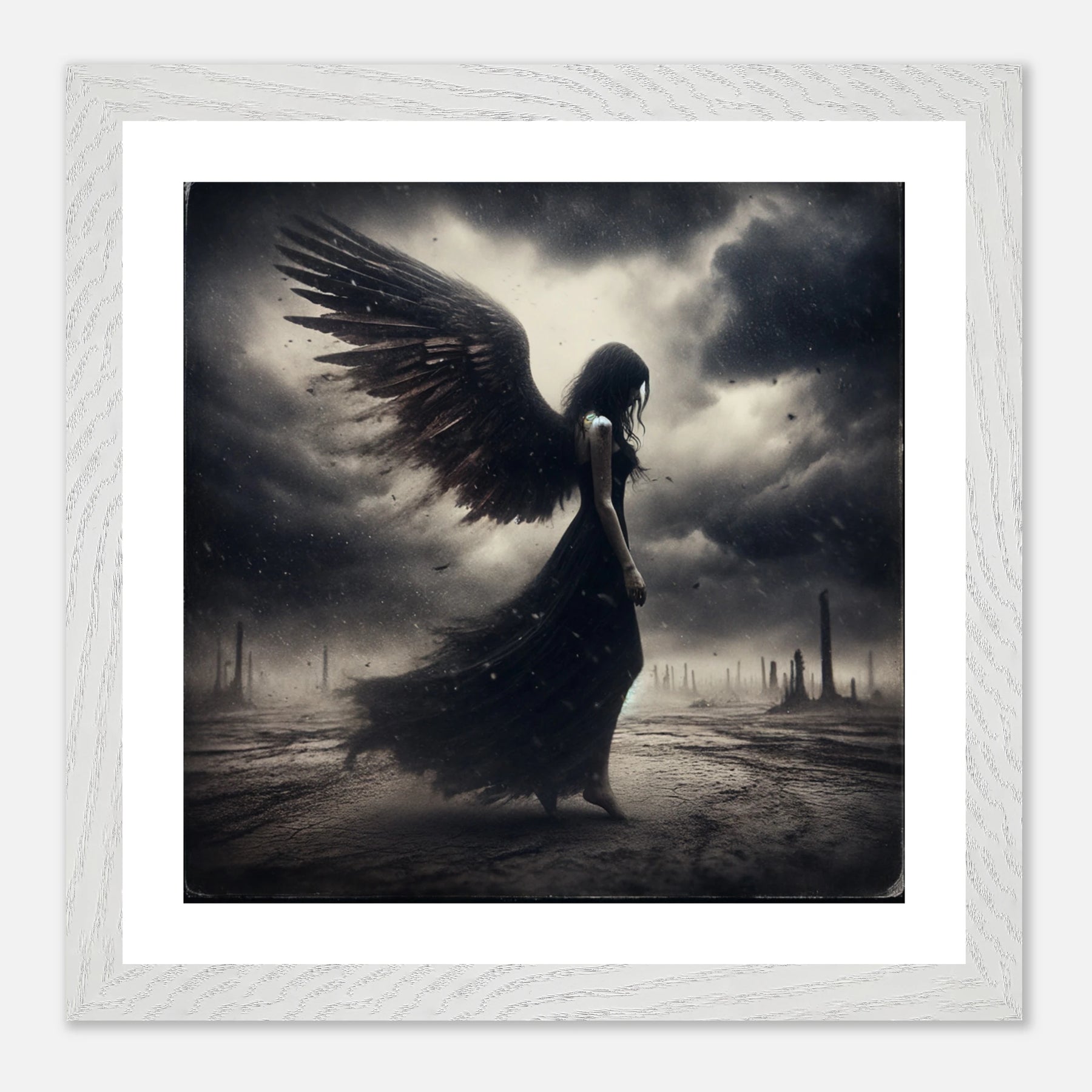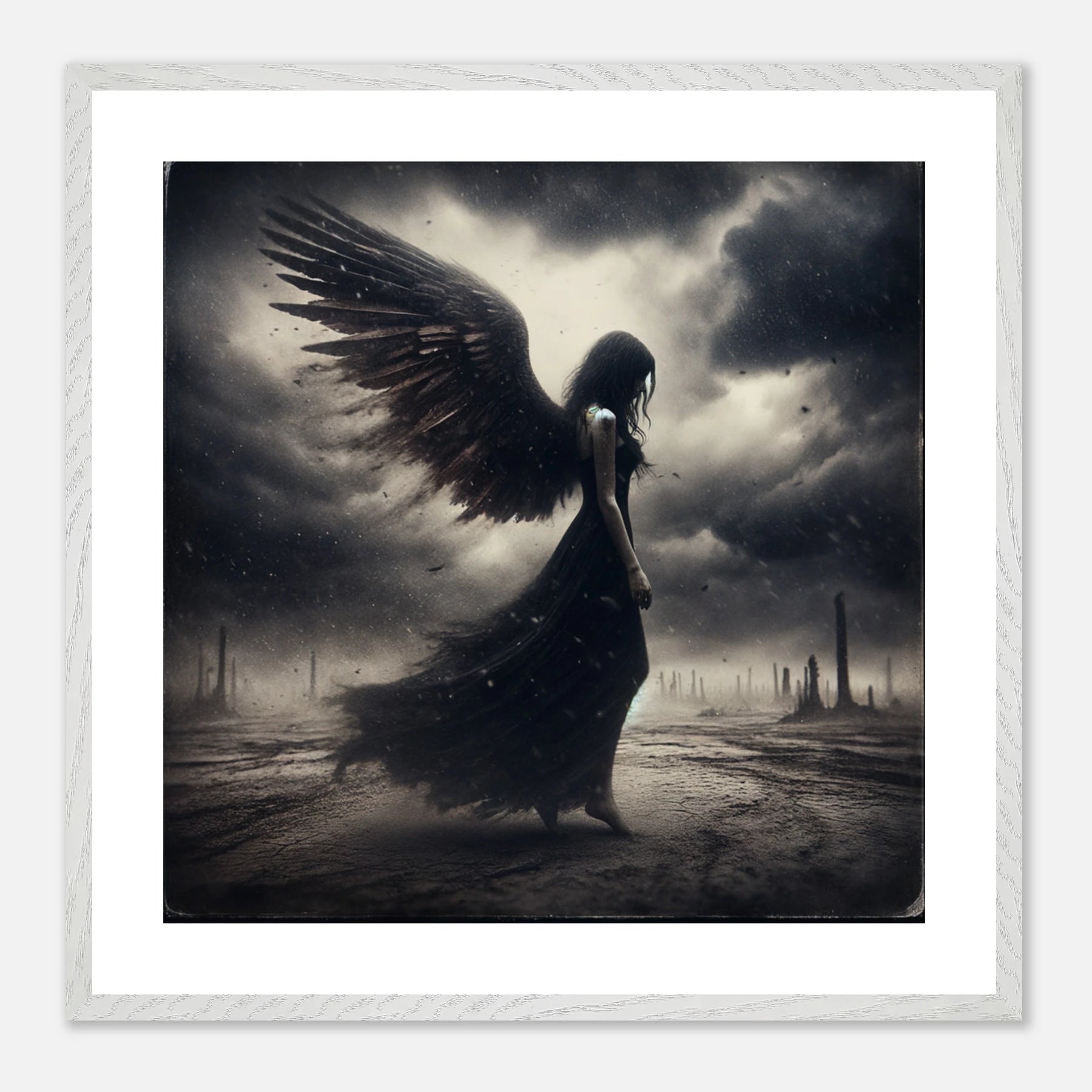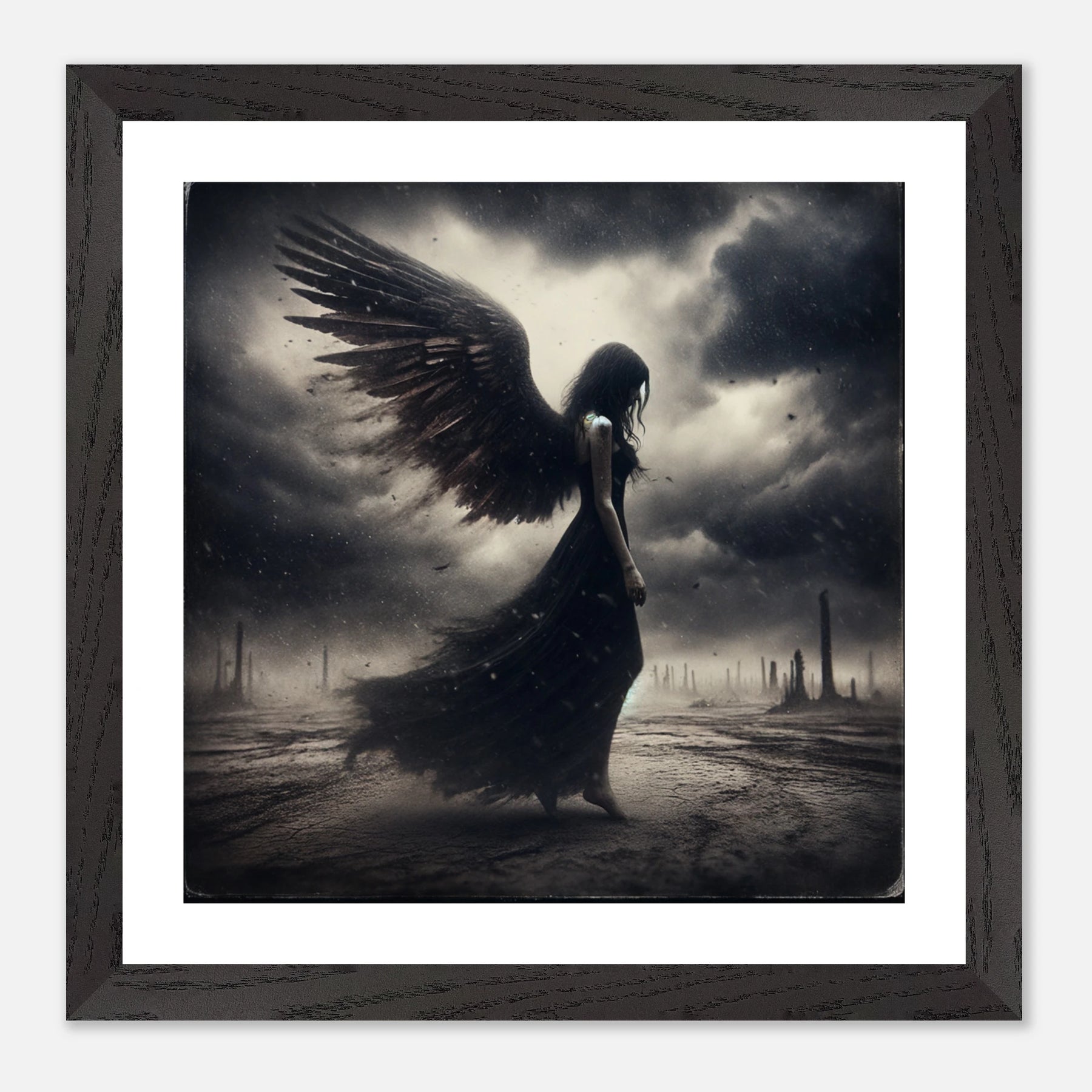 Gerahmtes Premium-Poster: Todesengel in schwarz wandelt auf einer Erde aus Staub und Asche, bedrückte und traurige Stimmung, ideale Wandkunst für melancholische und reflektierende Umgebungen