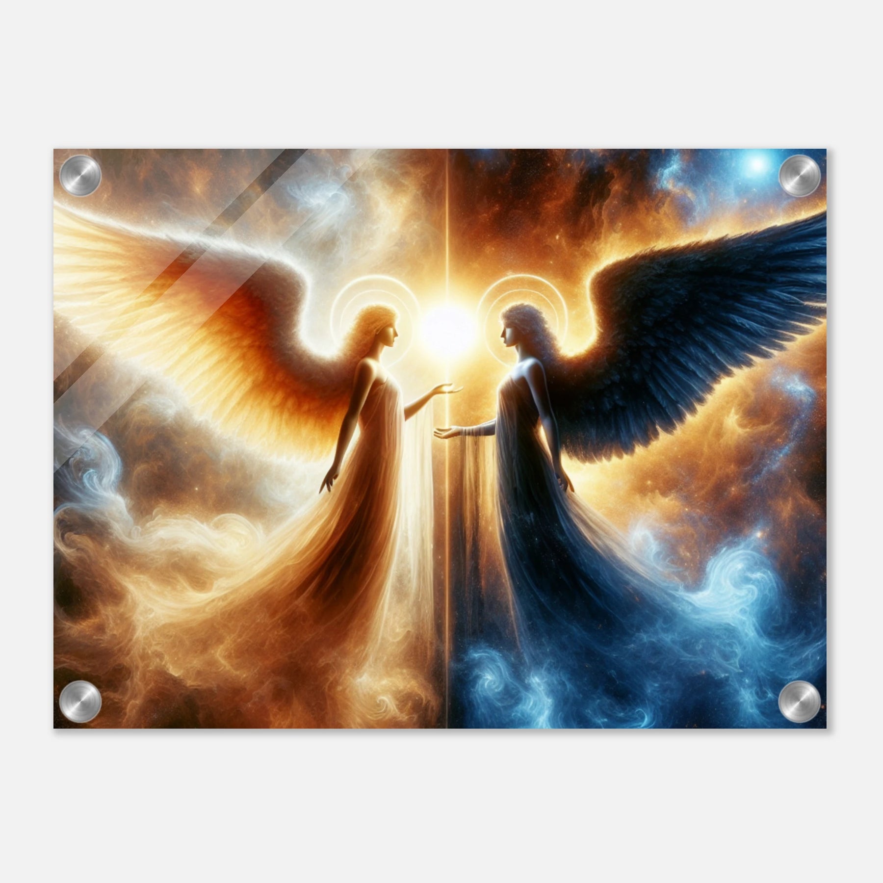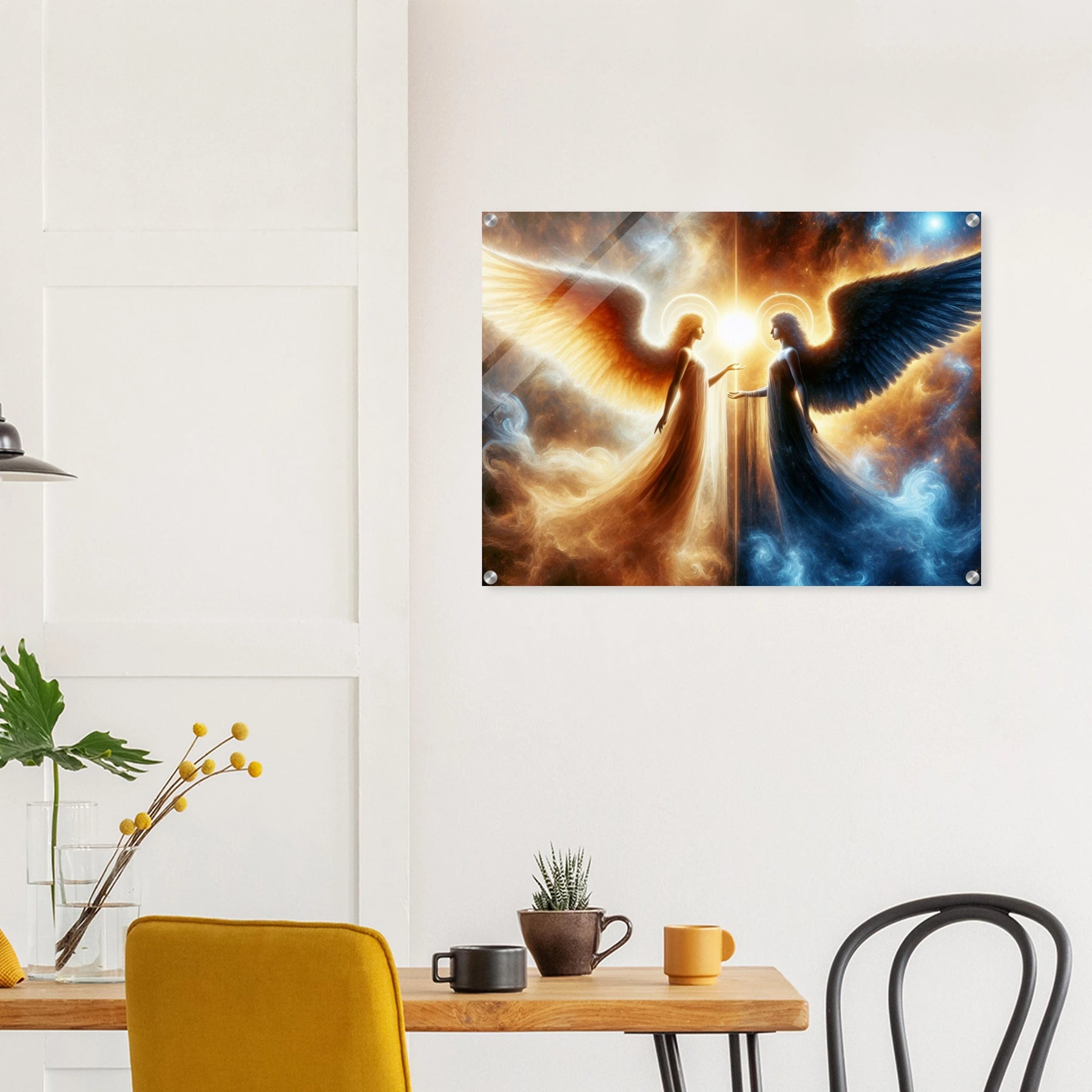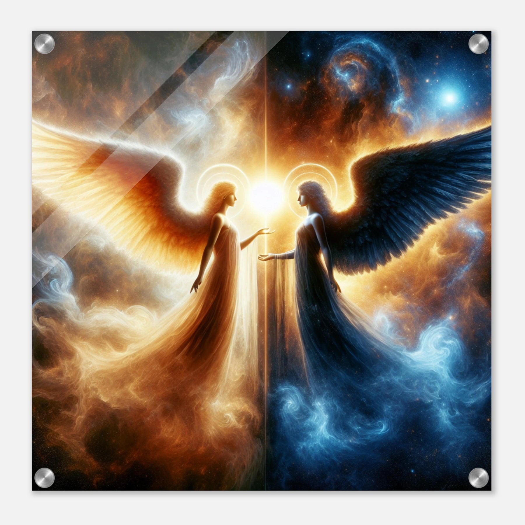 Acrylglasdruck: Zwei Engel im Weltraum gegenübergestellt, heller Schutzengel links und kühler dunkler Engel rechts, eindrucksvolle Wandkunst für Sci-Fi-Fans und Kunstliebhaber
