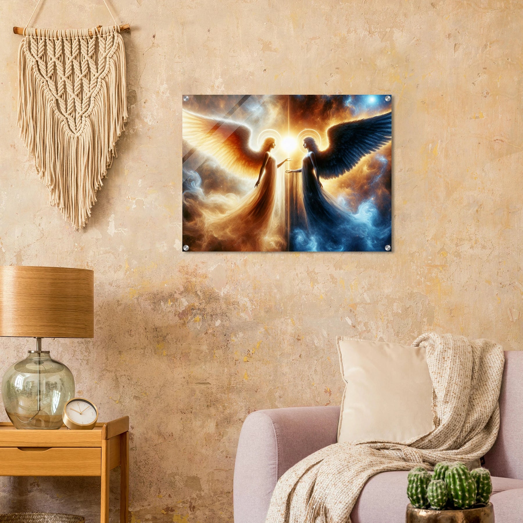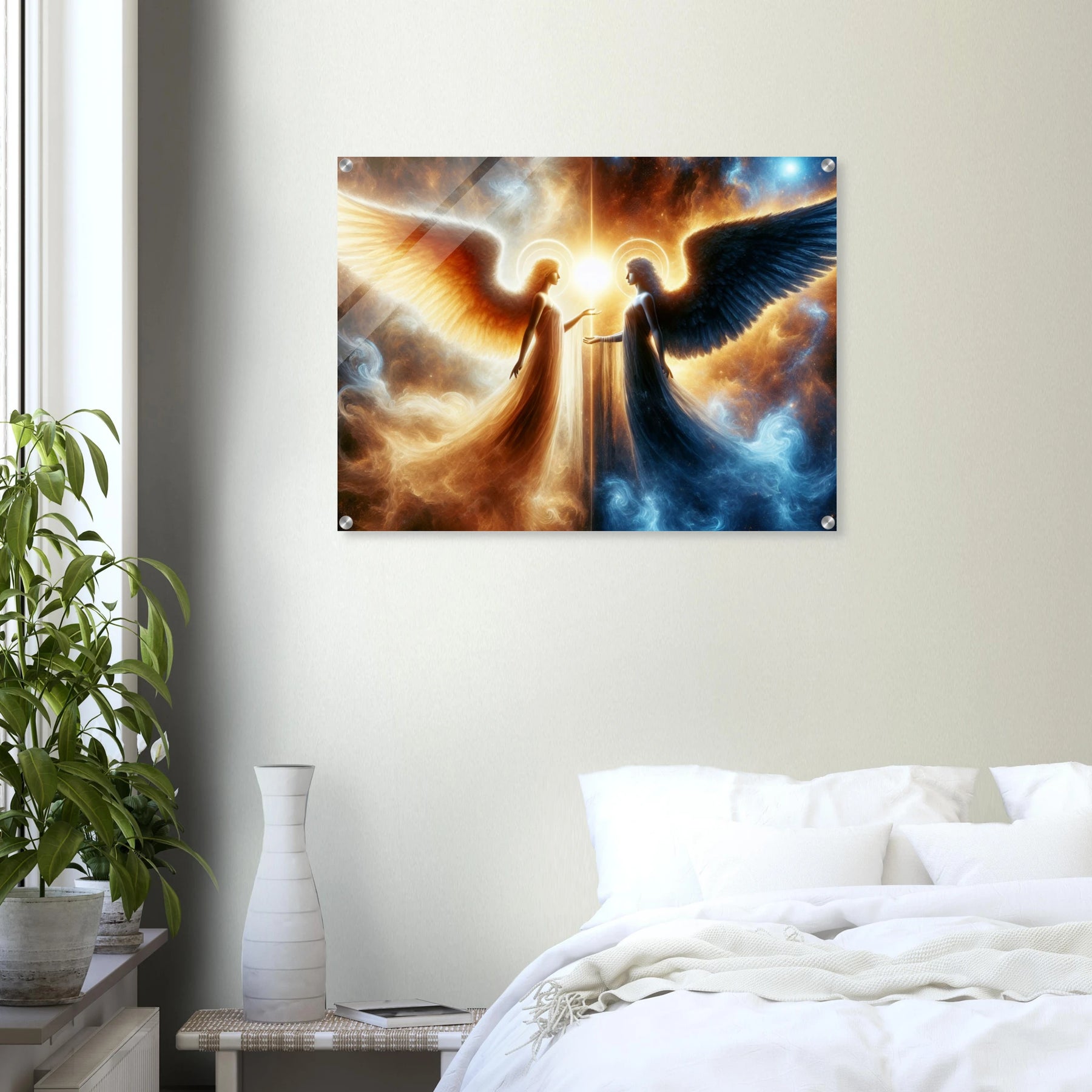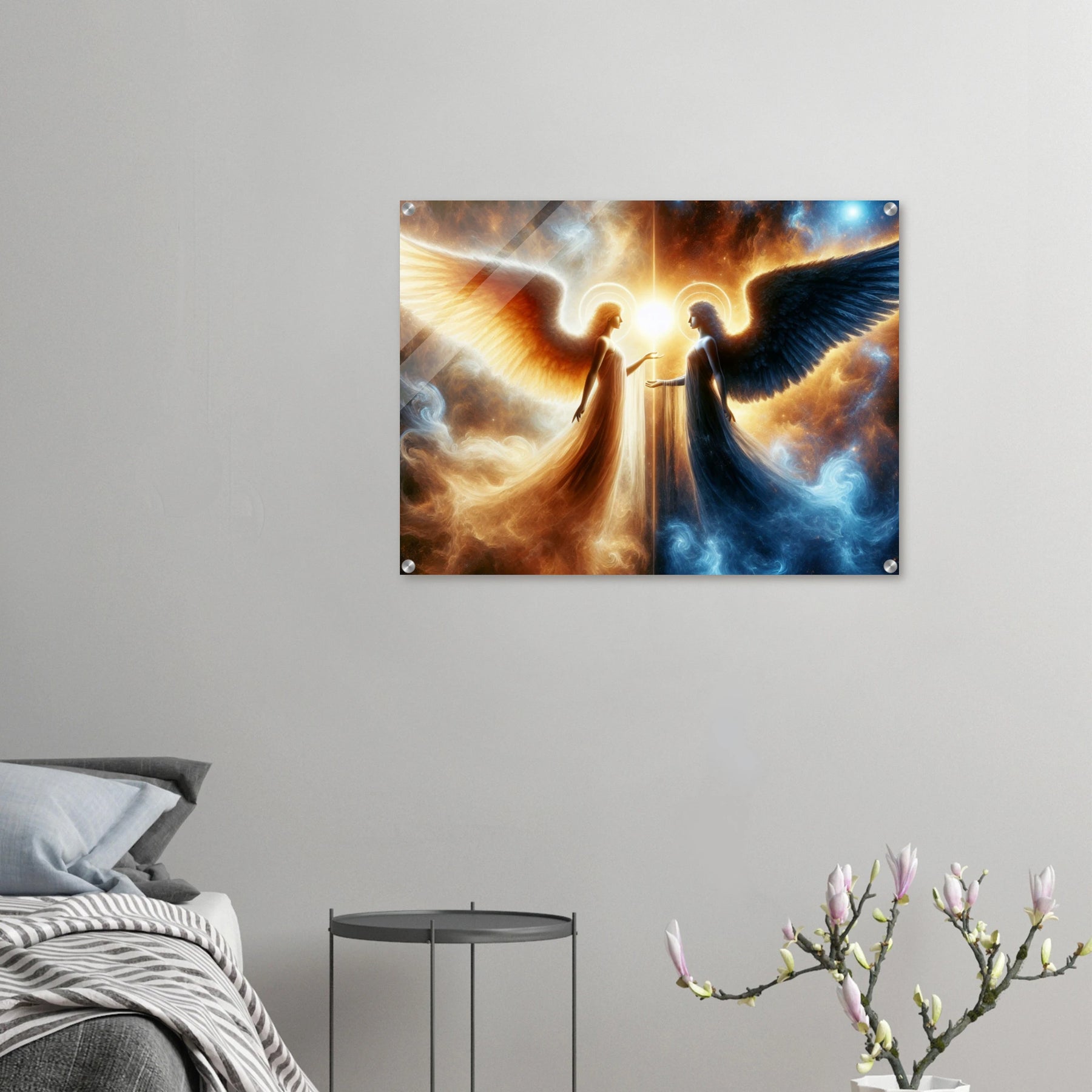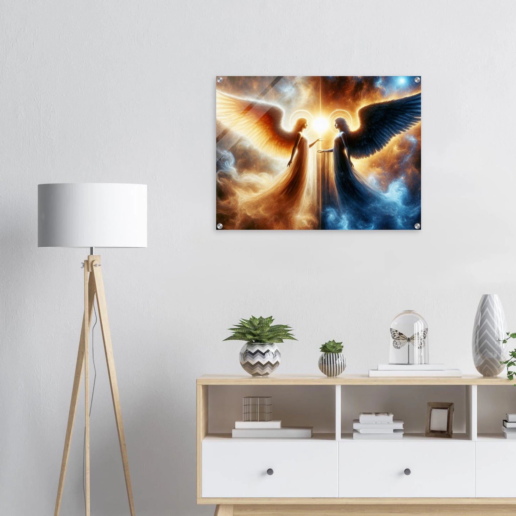 Acrylglasdruck: Zwei Engel im Weltraum gegenübergestellt, heller Schutzengel links und kühler dunkler Engel rechts, eindrucksvolle Wandkunst für Sci-Fi-Fans und Kunstliebhaber