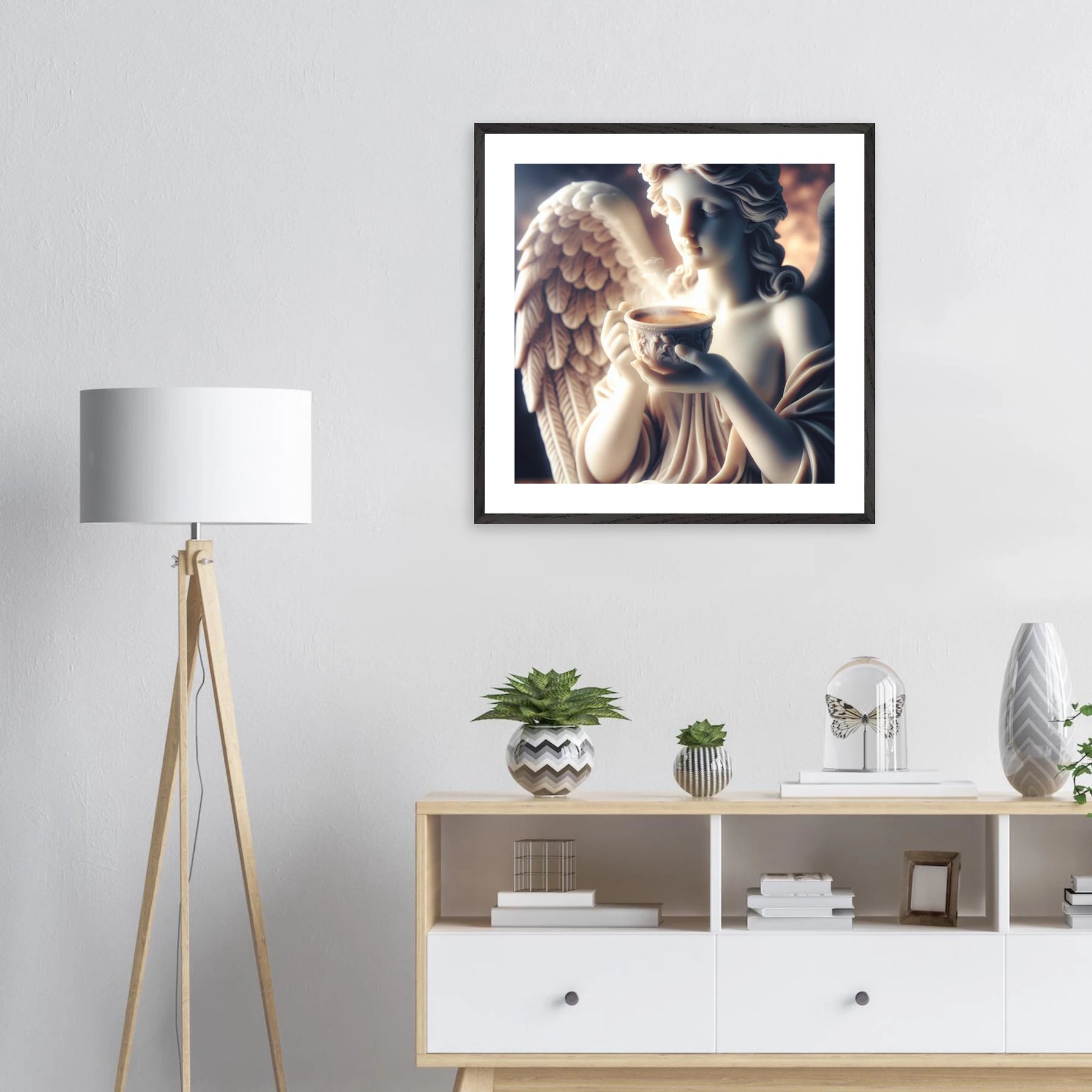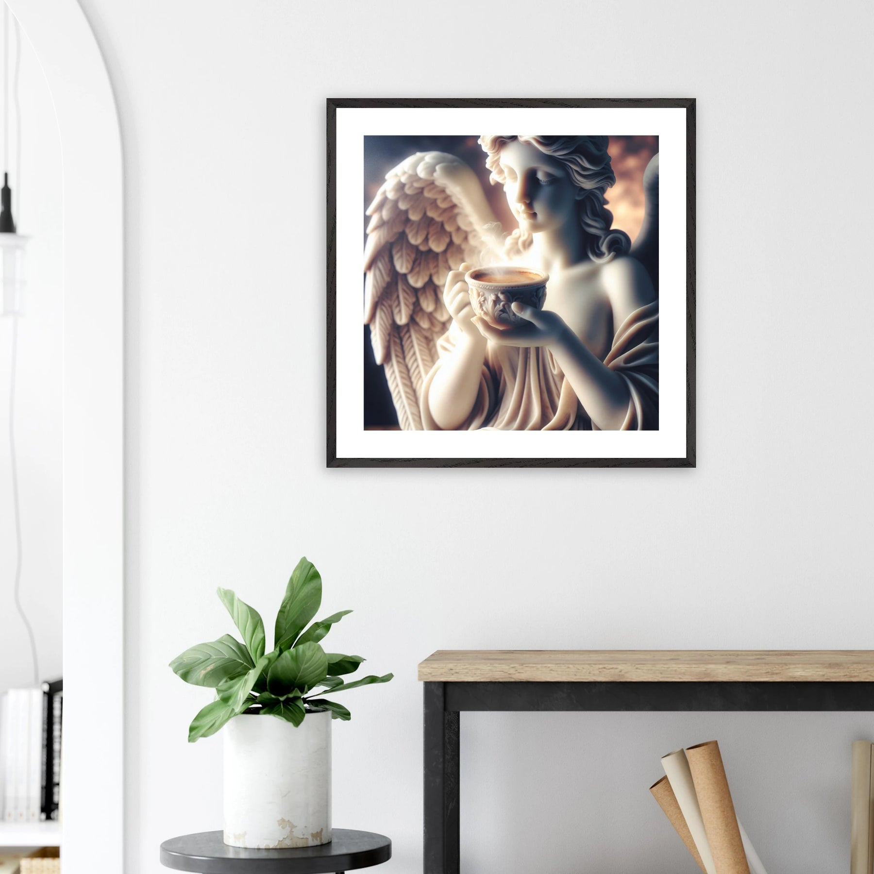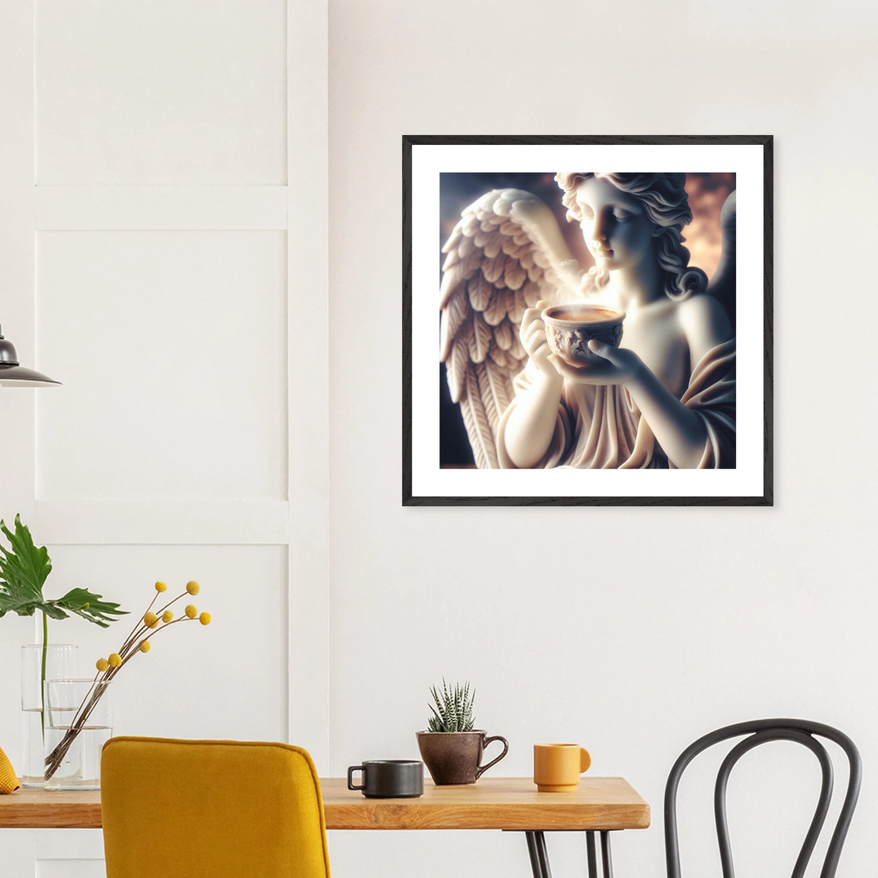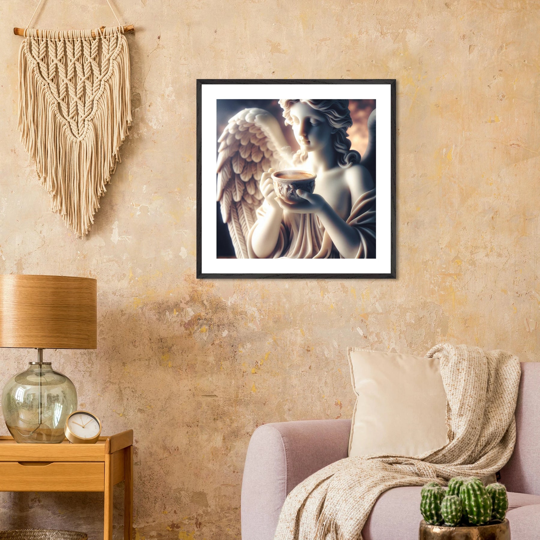 Premium Poster im Rahmen mit Marmorengel und heißen Kaffee – genussvolle moderne Ruhe & spirituelle Ästhetik für dein Zuhause | Dreaming Wings