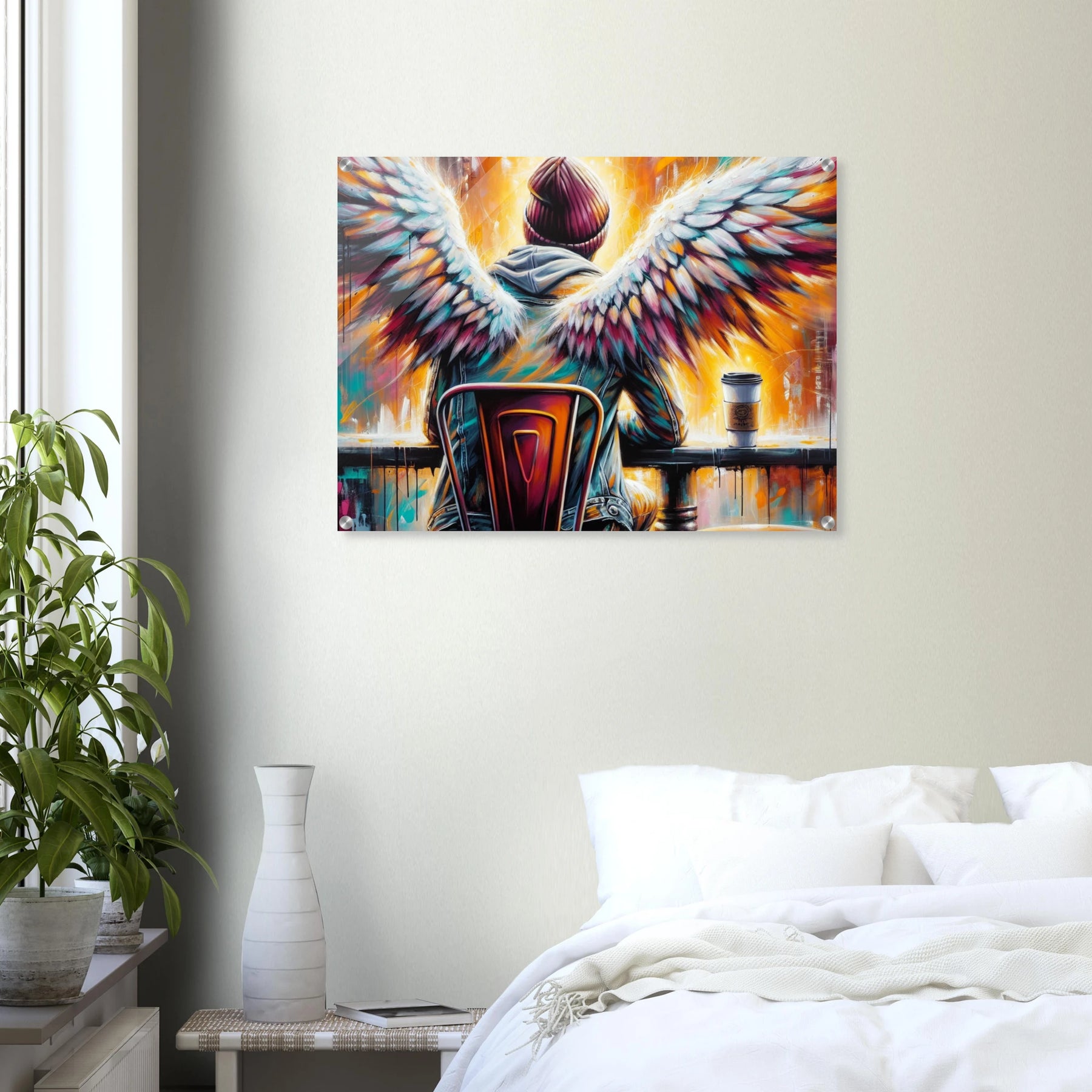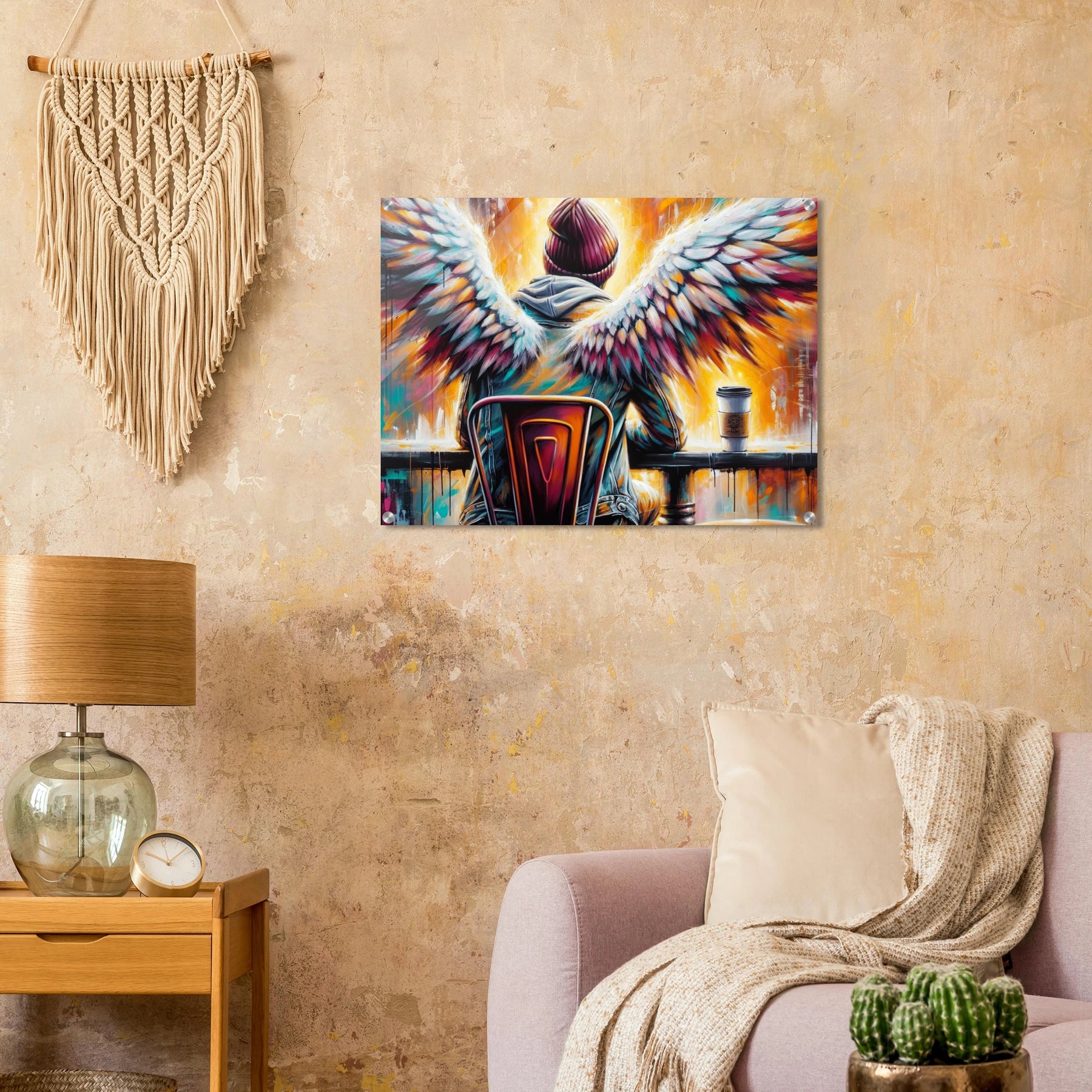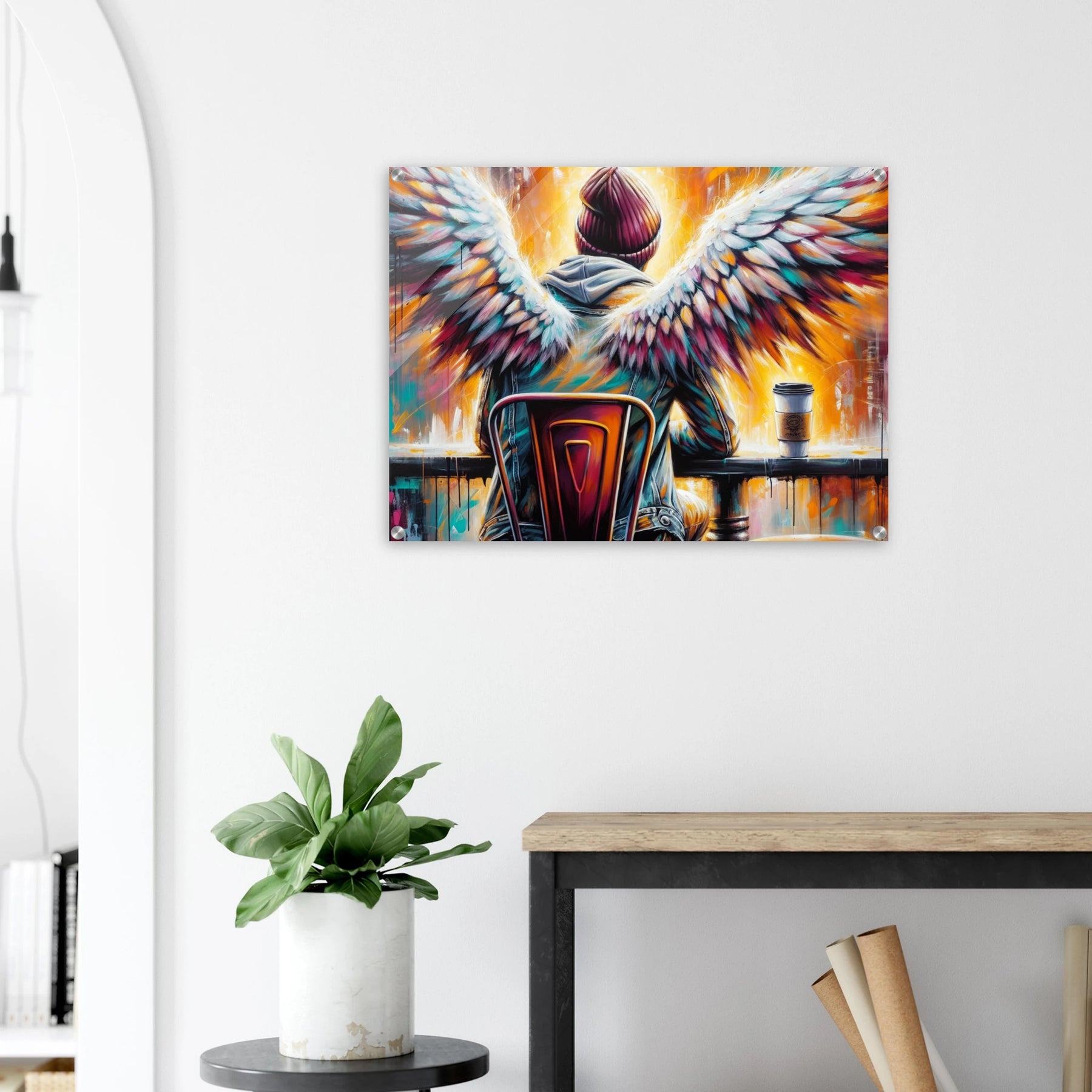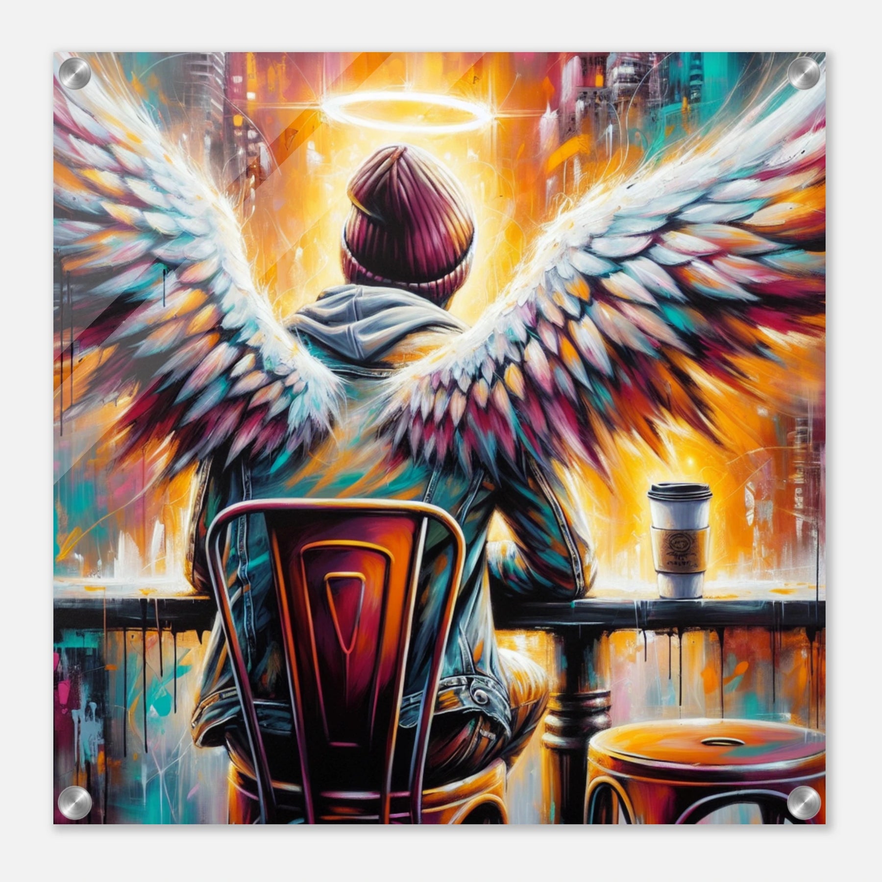 Hipster-Engel mit Heiligenschein im Café – Coffee & Halos Acrylglasdruck, trinkt Kaffee in Acrylfarben
