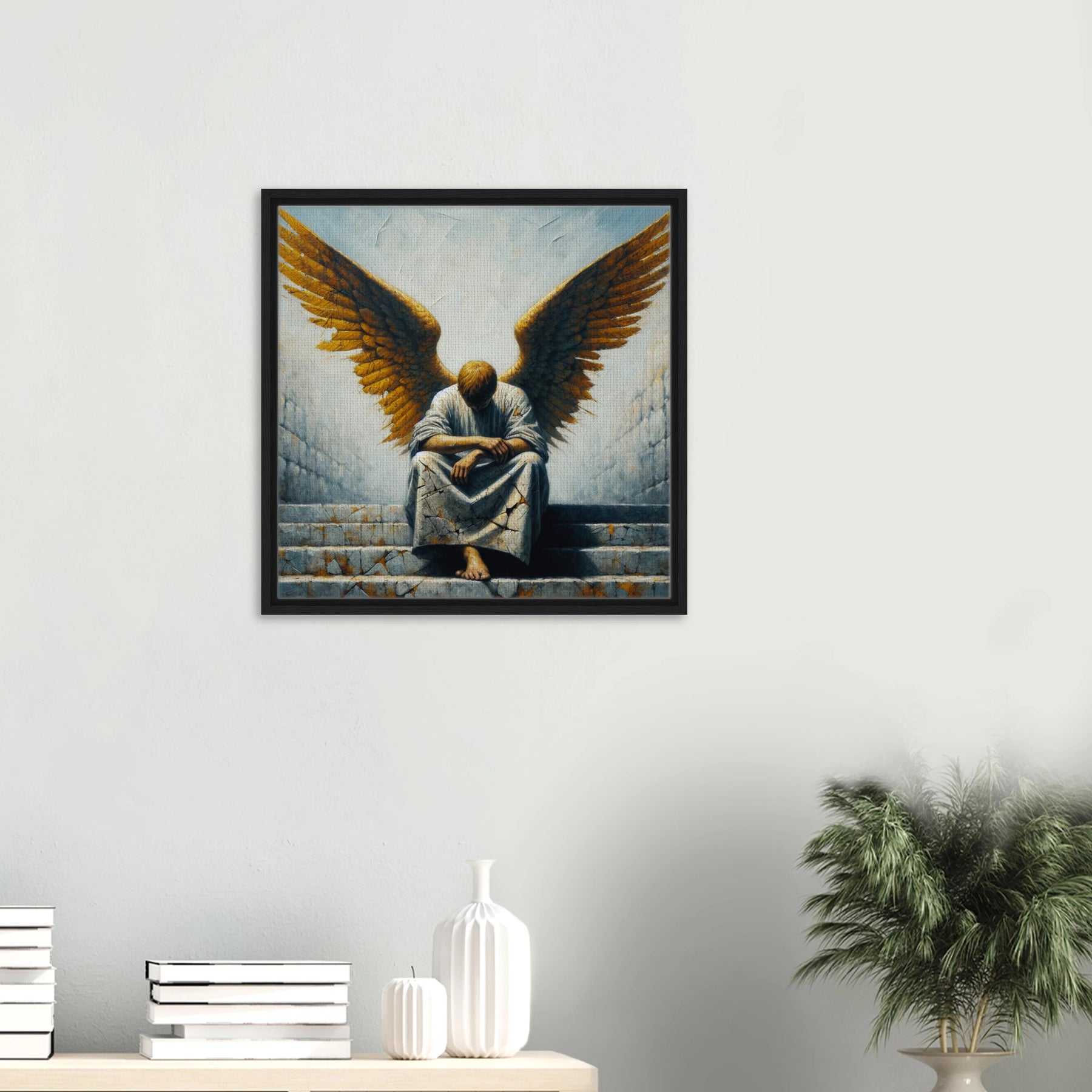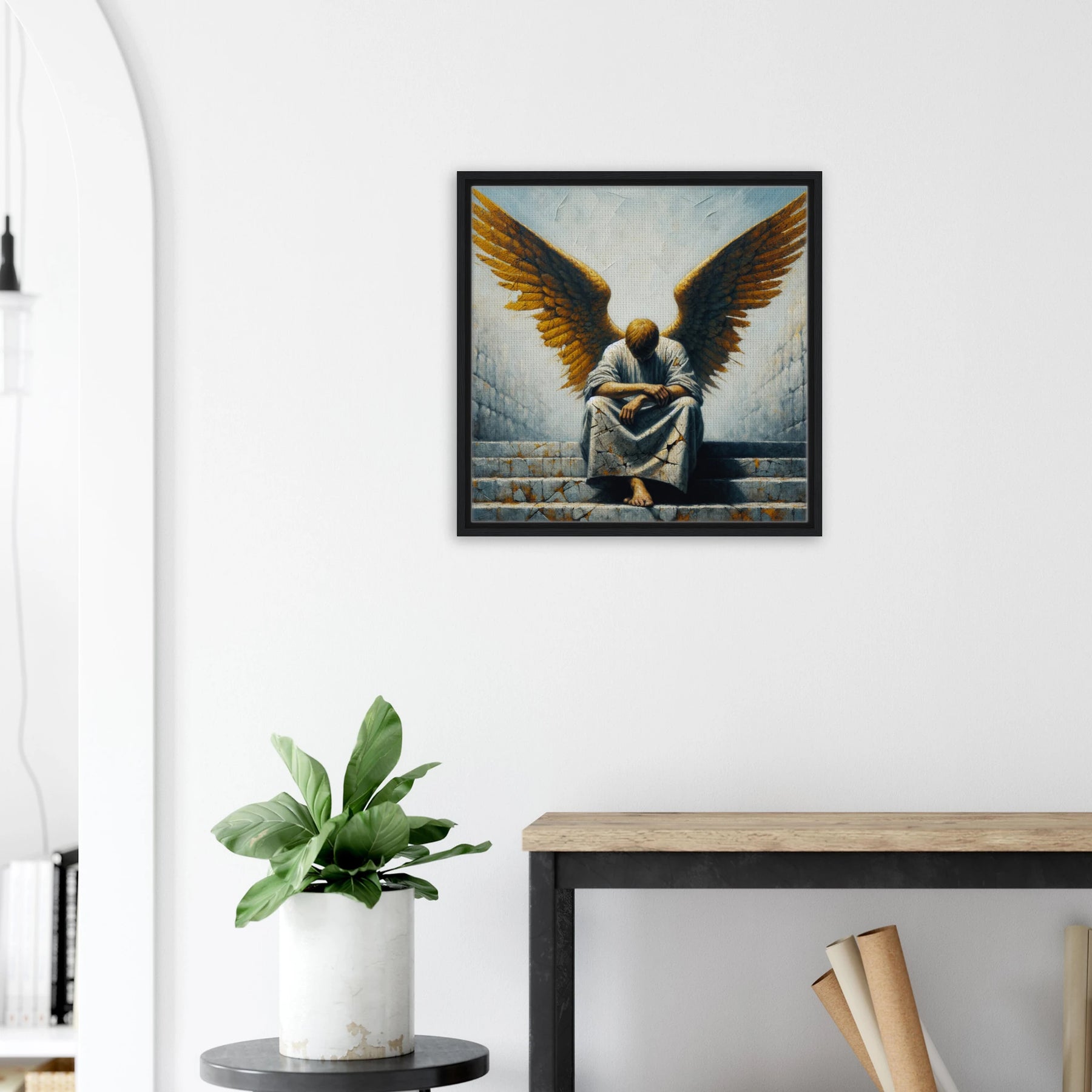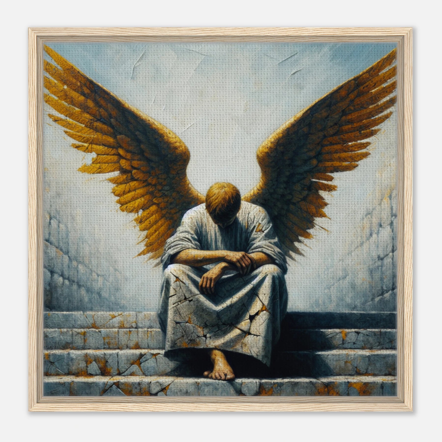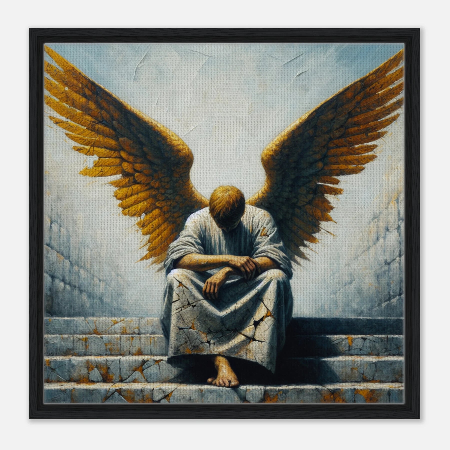Engel sitzt betend auf Treppe – Concrete & Clouds Leinwanddruck, bescheiden und in einfachem Gewand