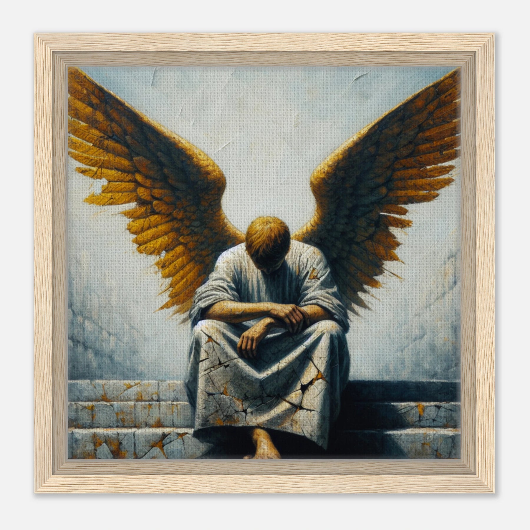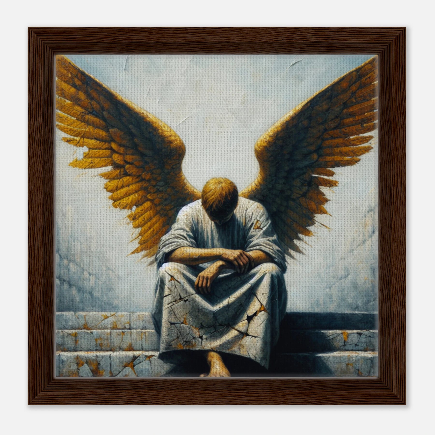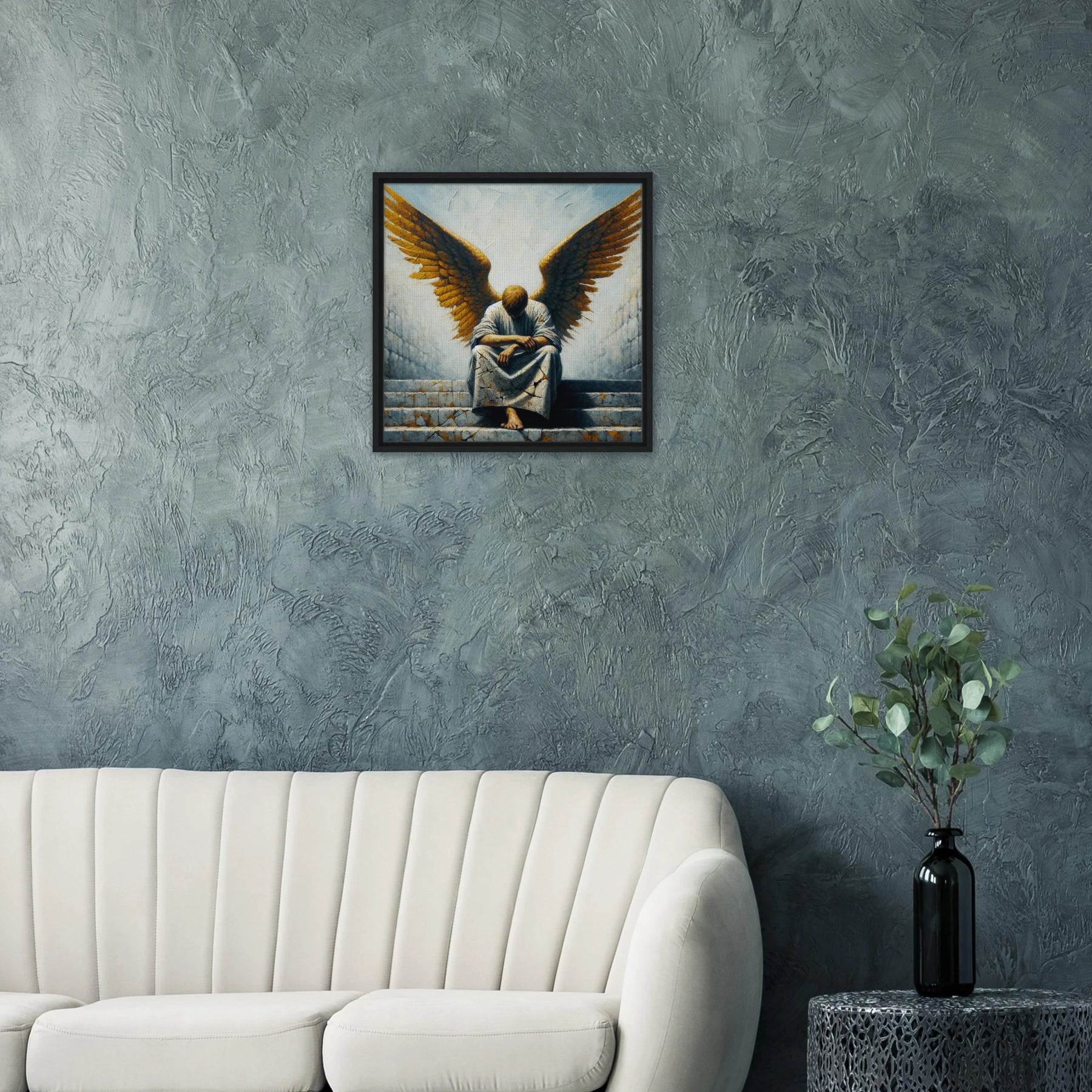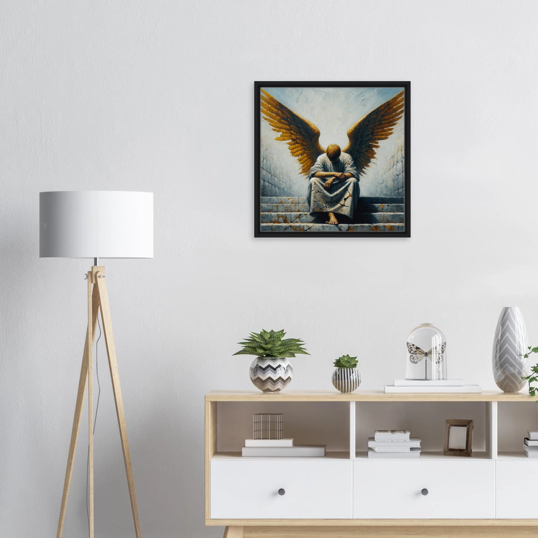Engel sitzt betend auf Treppe – Concrete & Clouds Leinwanddruck, bescheiden und in einfachem Gewand