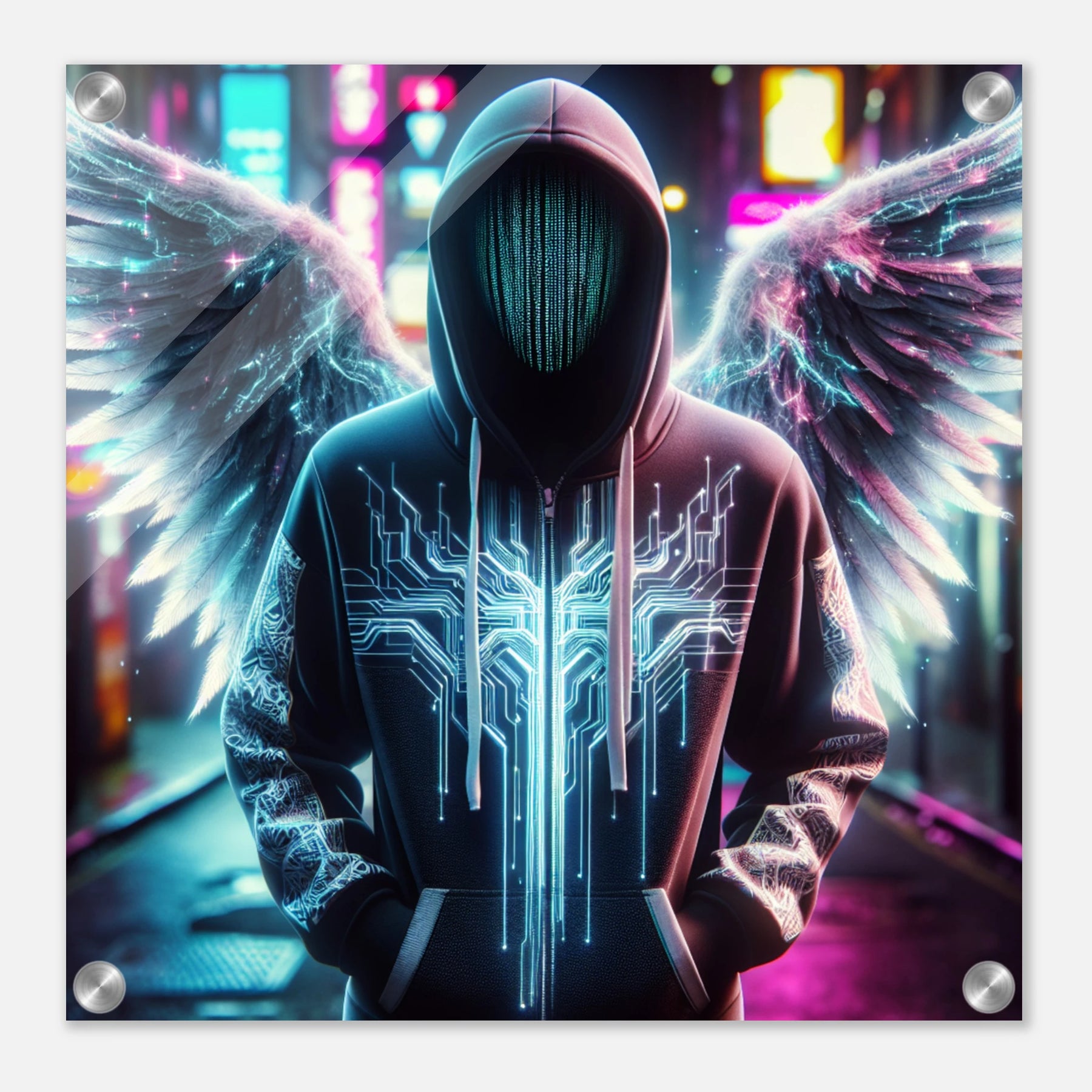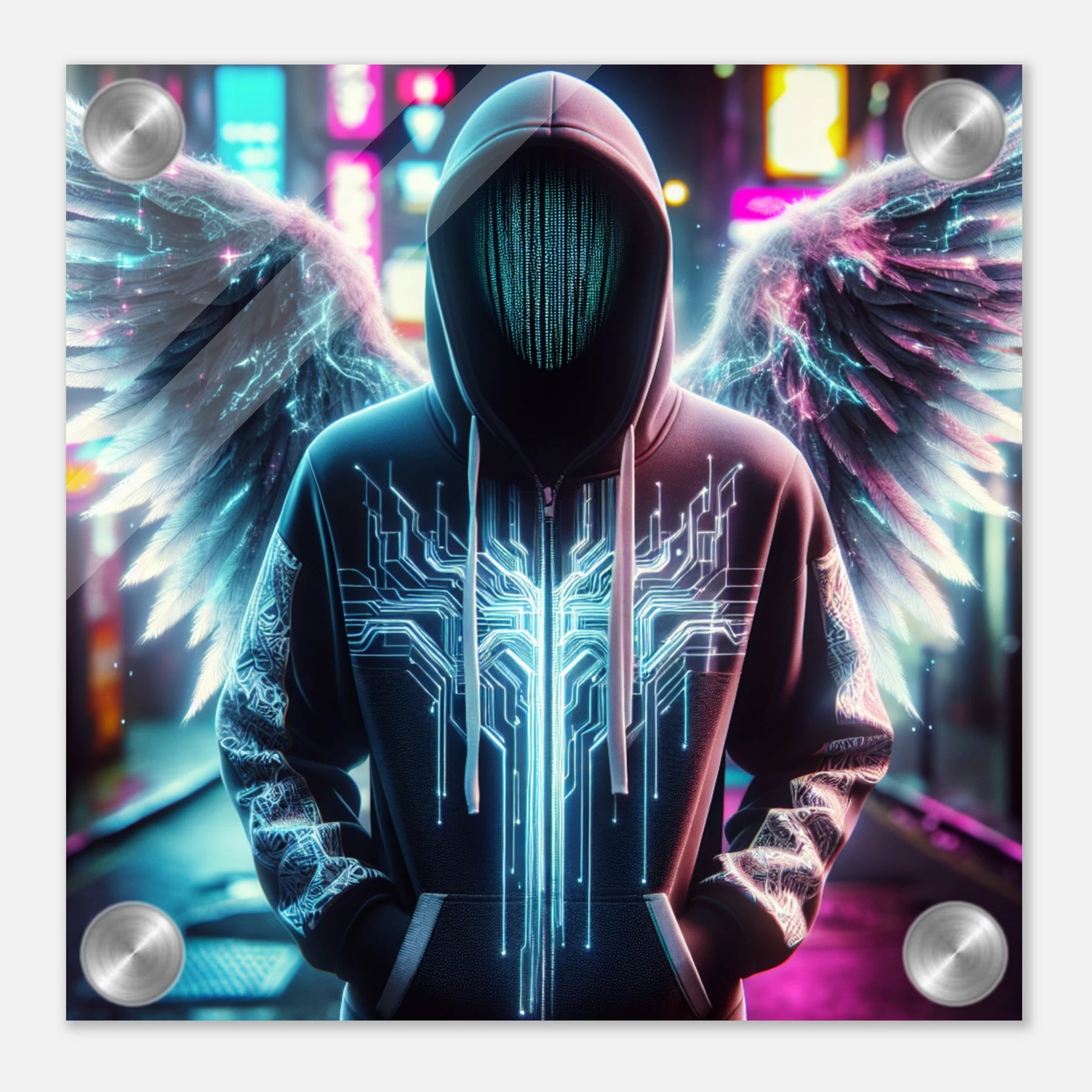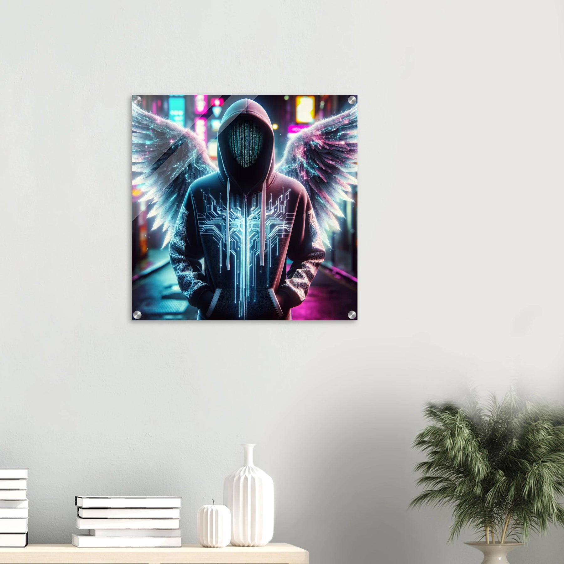 Digitaler Schutzengel unter Strom – Acrylbild mit leuchtenden High-Tech-Flügeln im Cyberraum