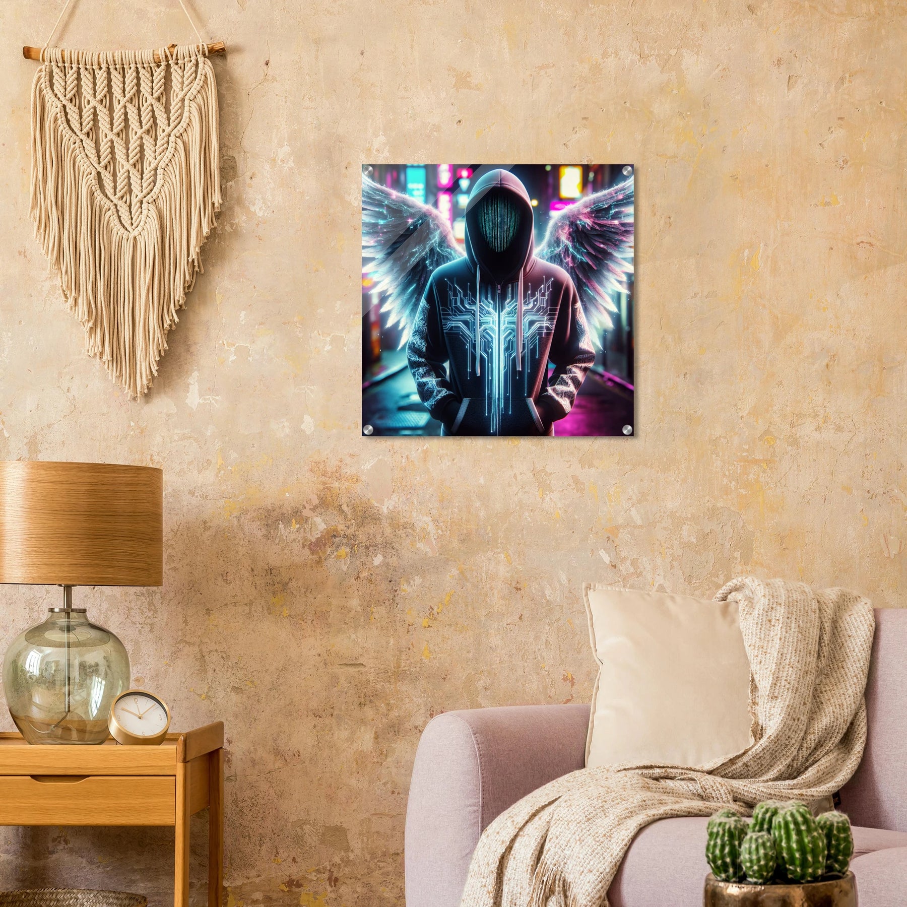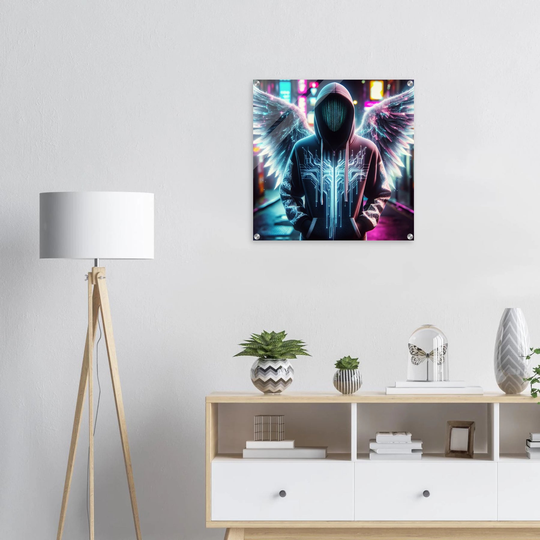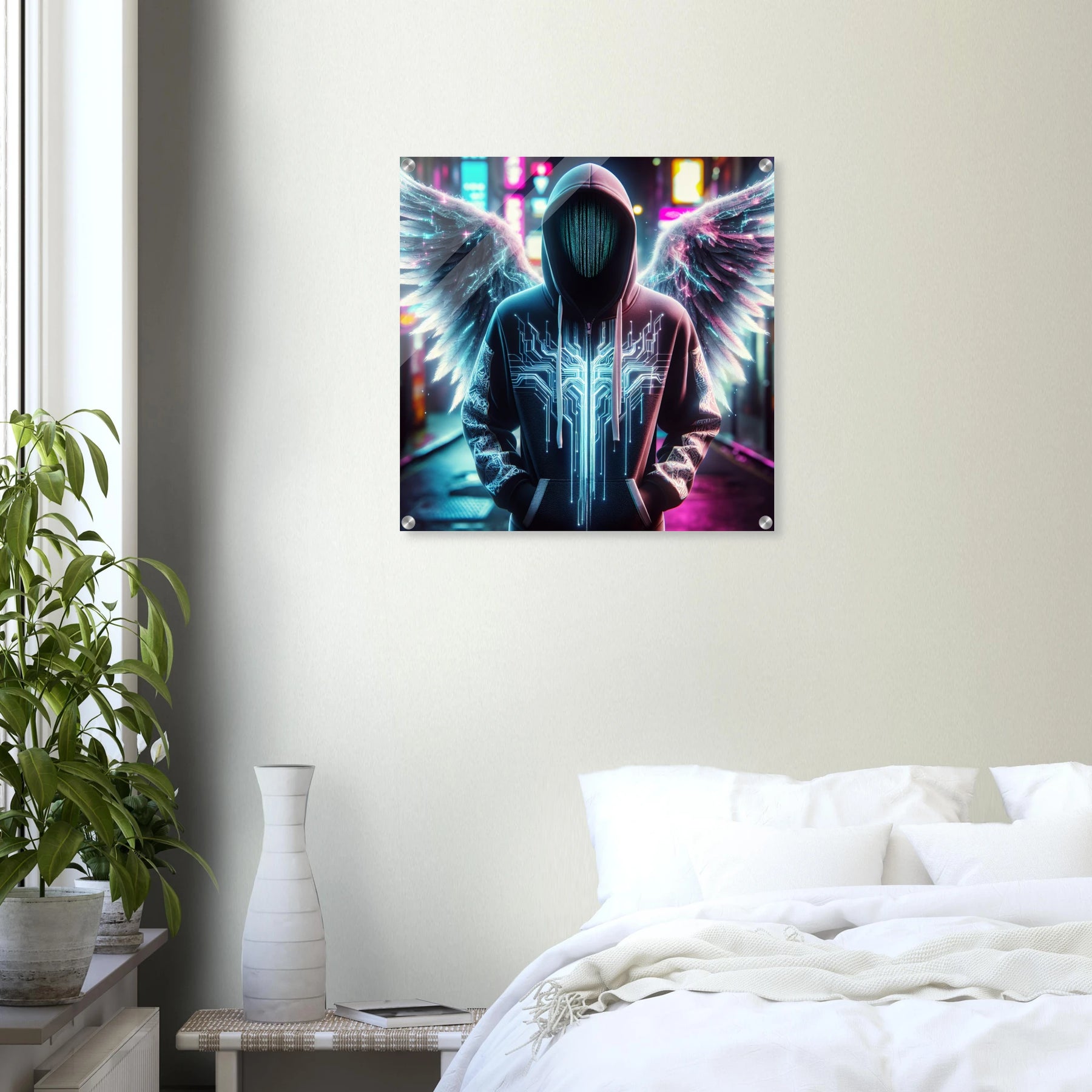 Digitaler Schutzengel unter Strom – Acrylbild mit leuchtenden High-Tech-Flügeln im Cyberraum