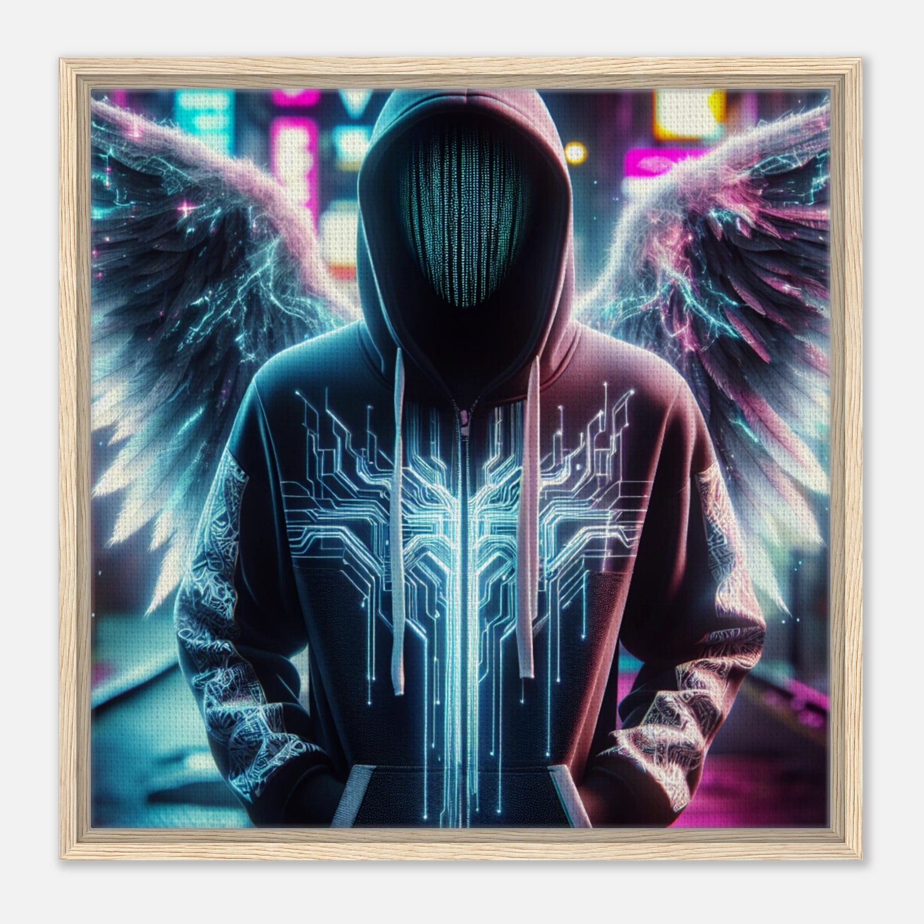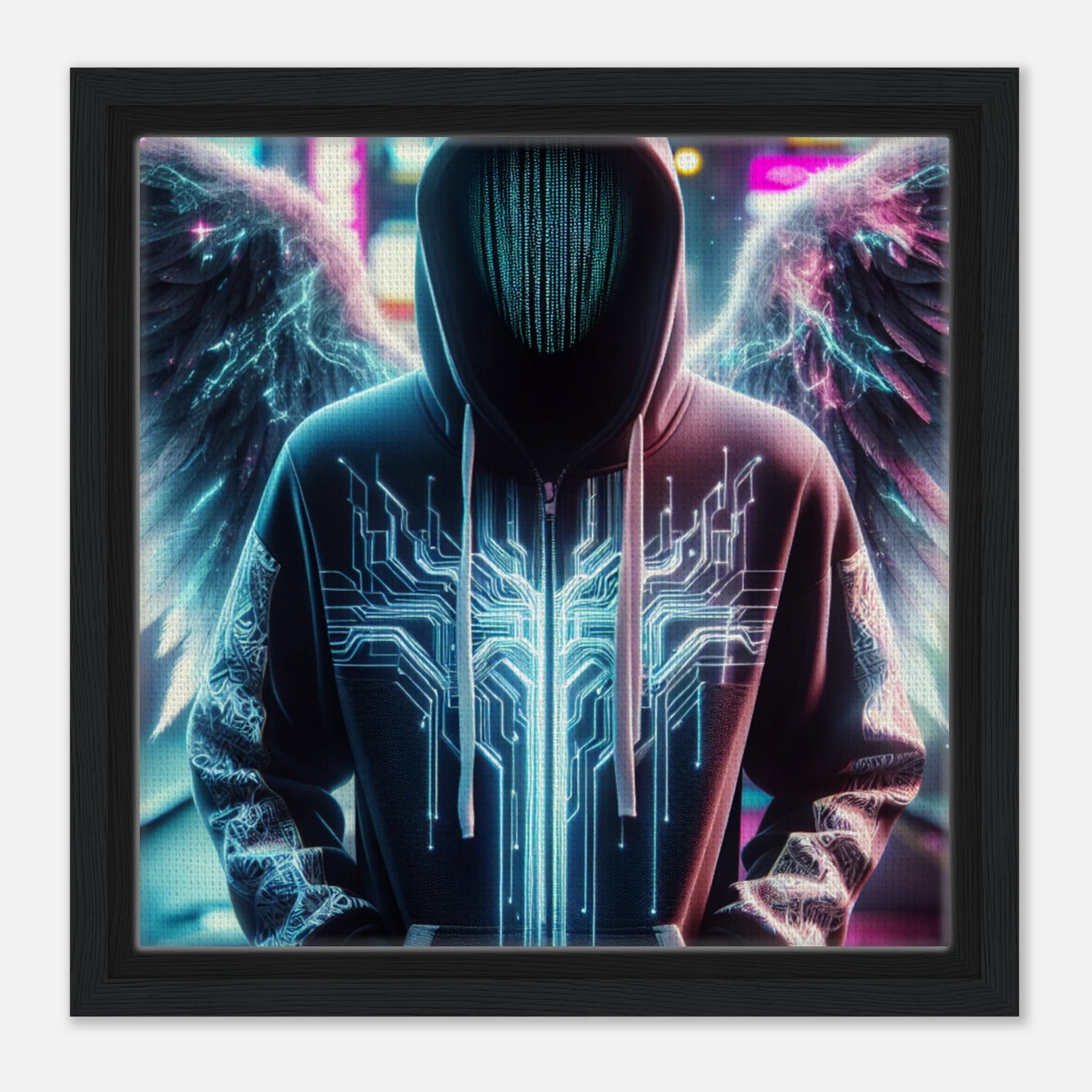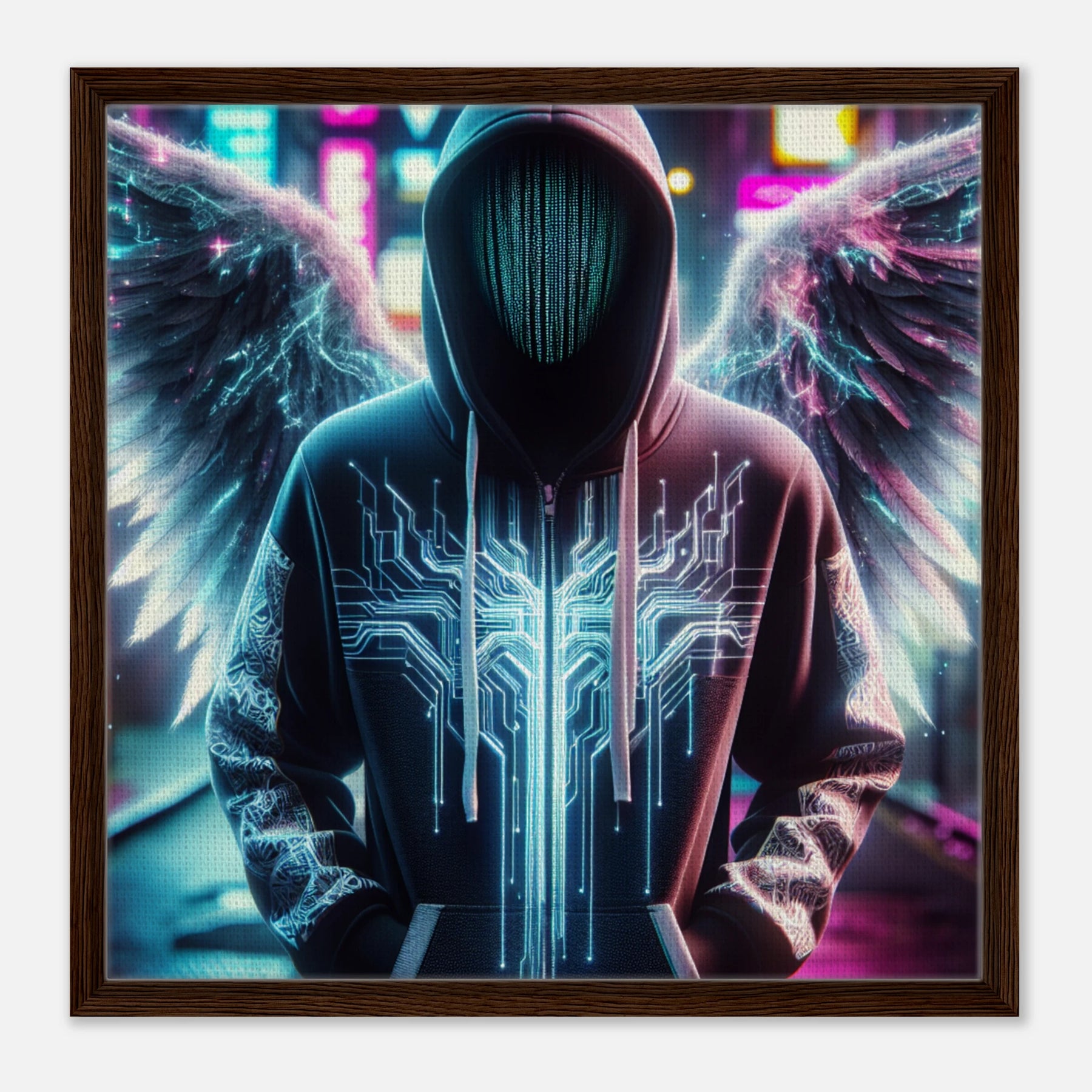 Elektronischer Engel in der digitalen Sphäre – moderne Leinwandkunst mit spannungsgeladenen Flügeln