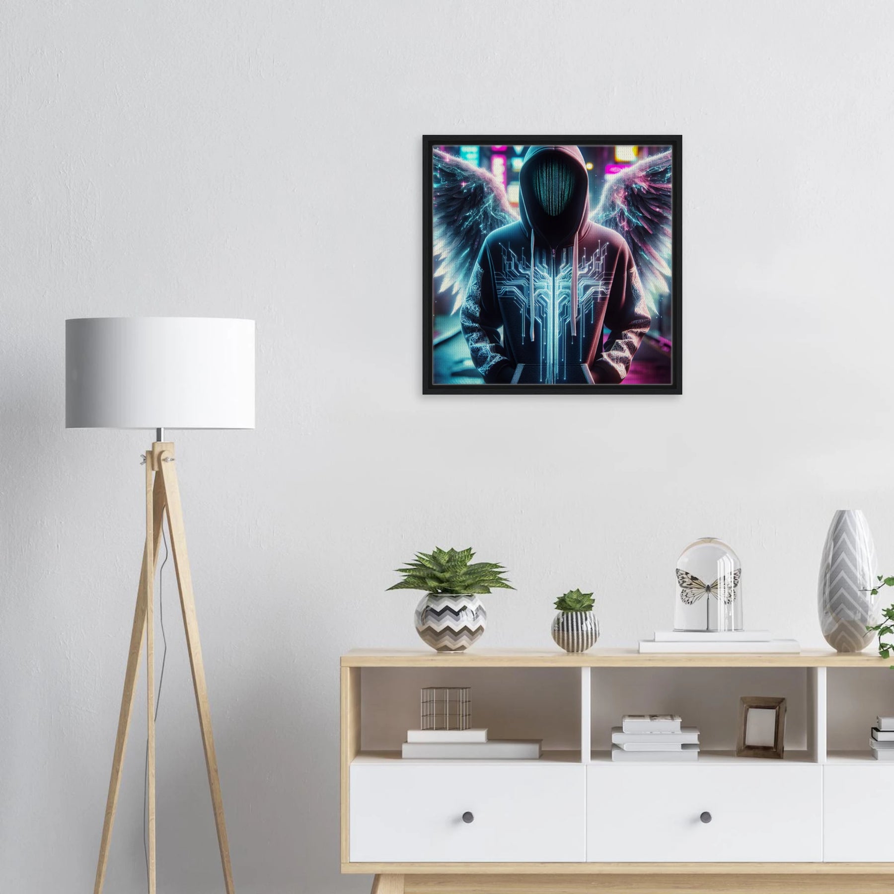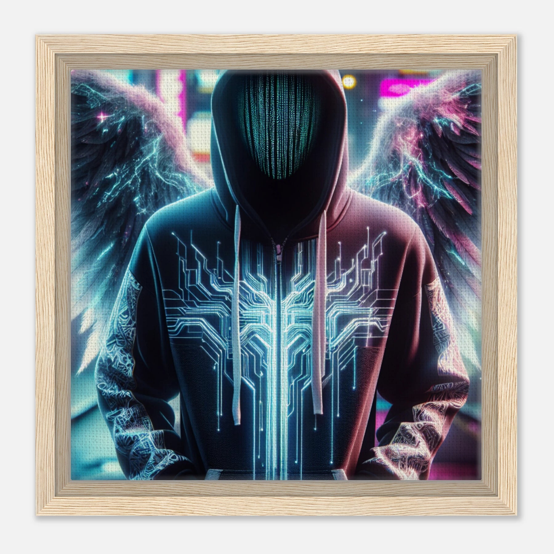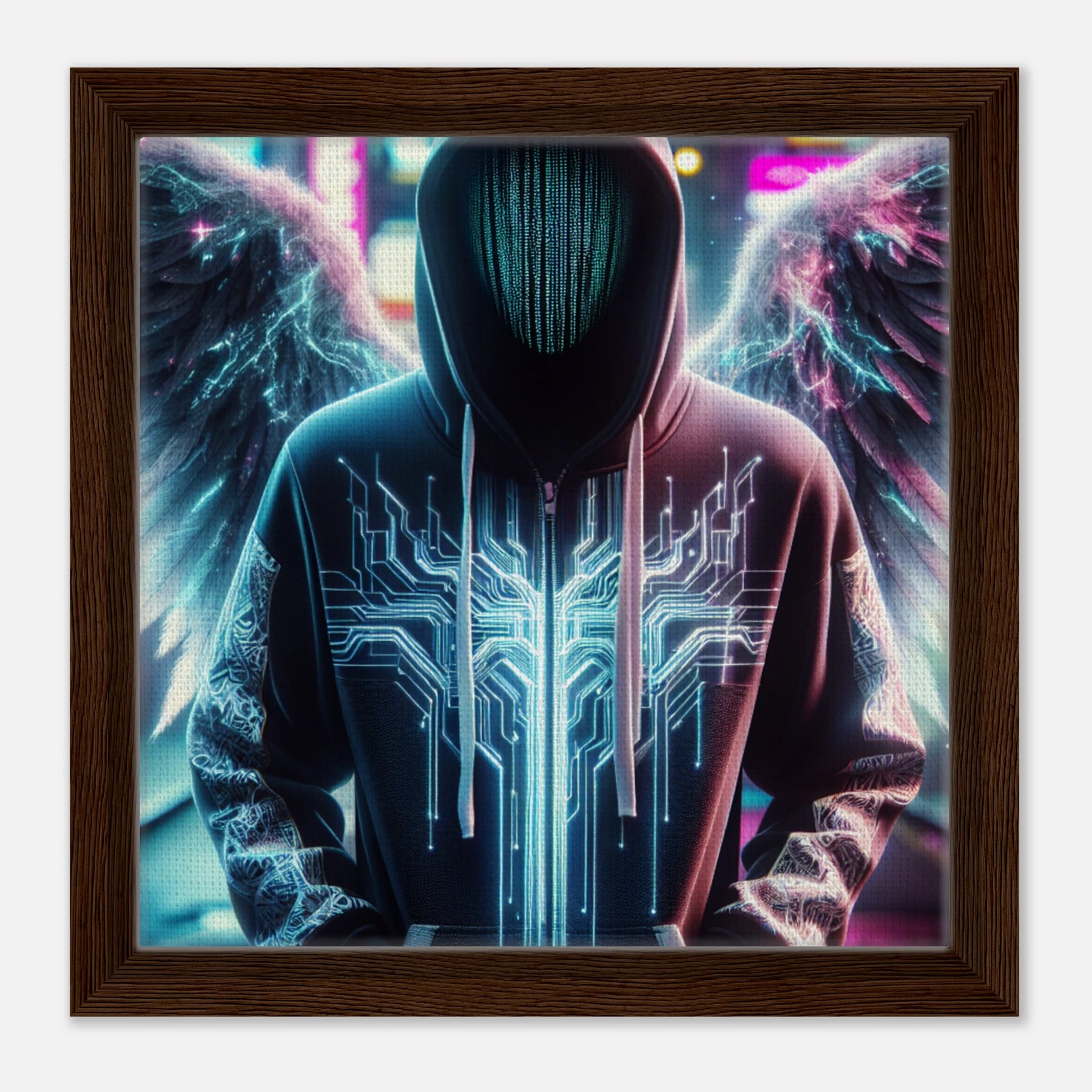 Elektronischer Engel in der digitalen Sphäre – moderne Leinwandkunst mit spannungsgeladenen Flügeln