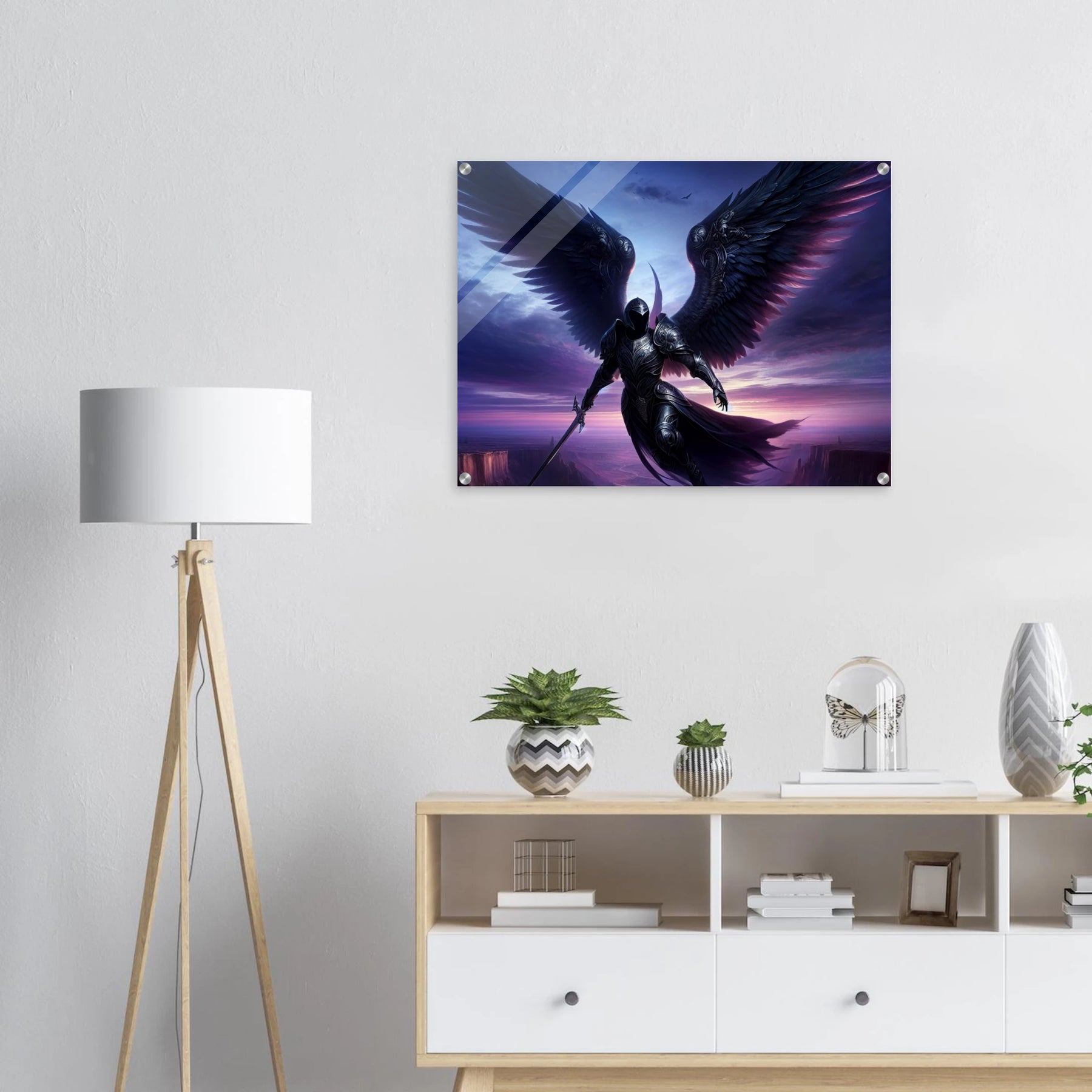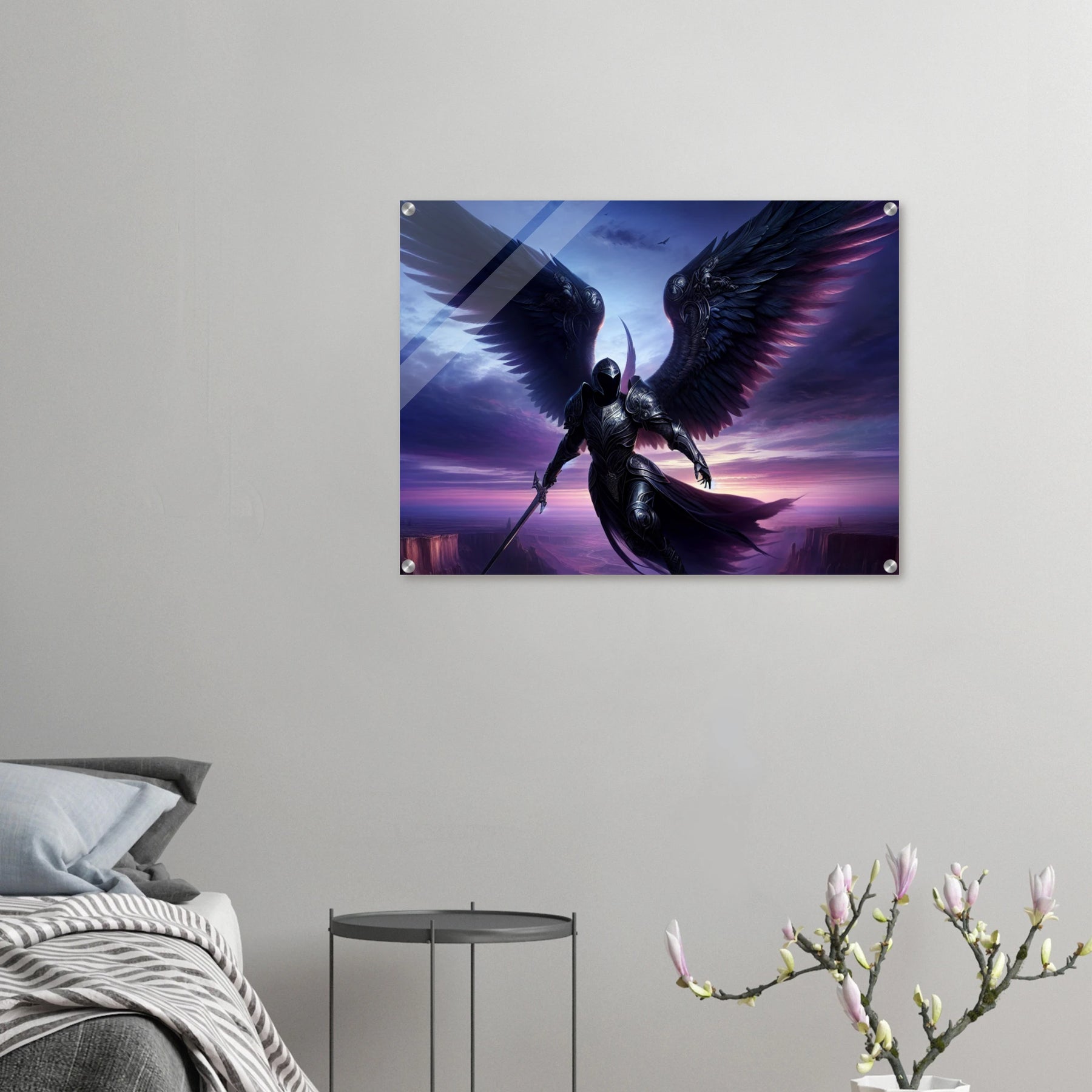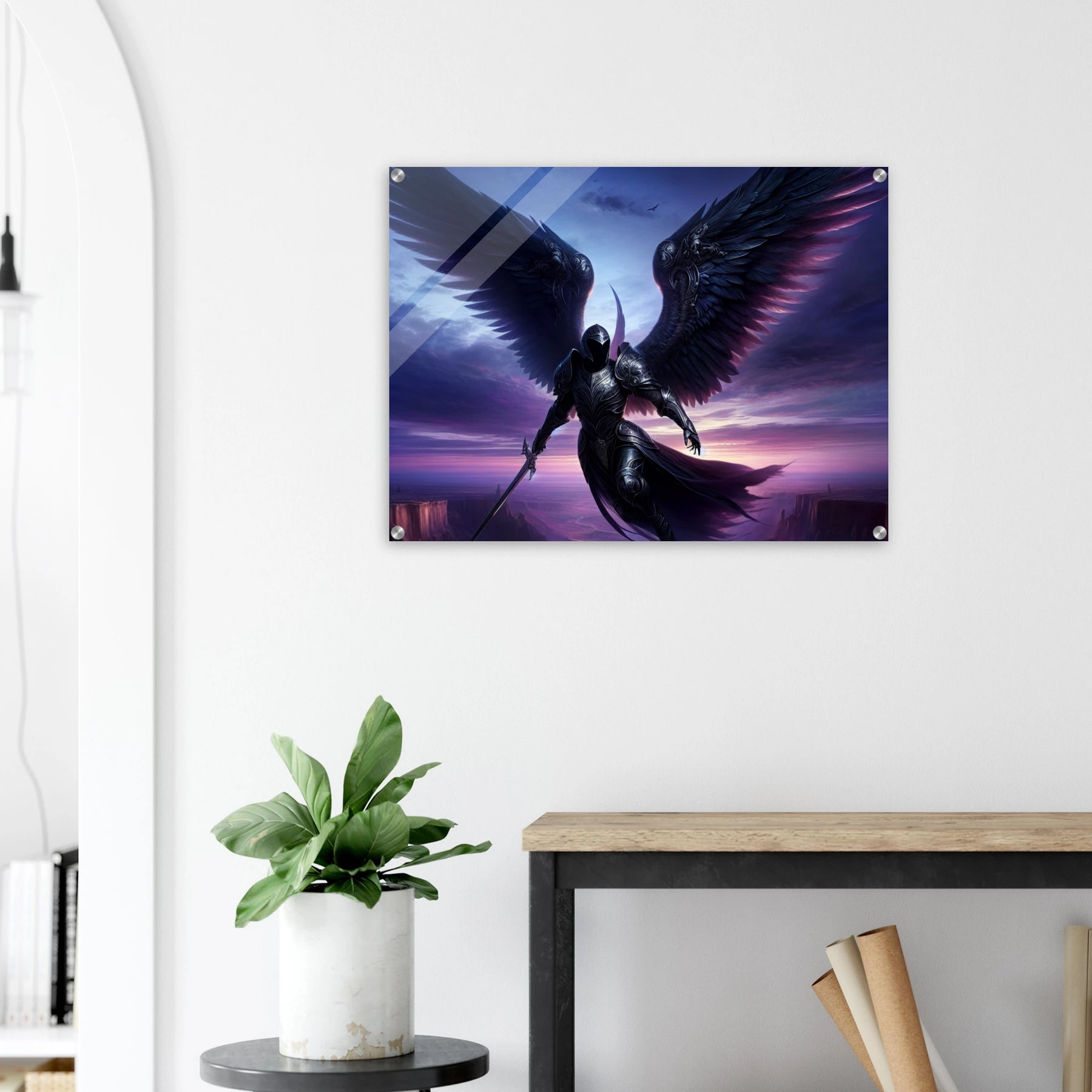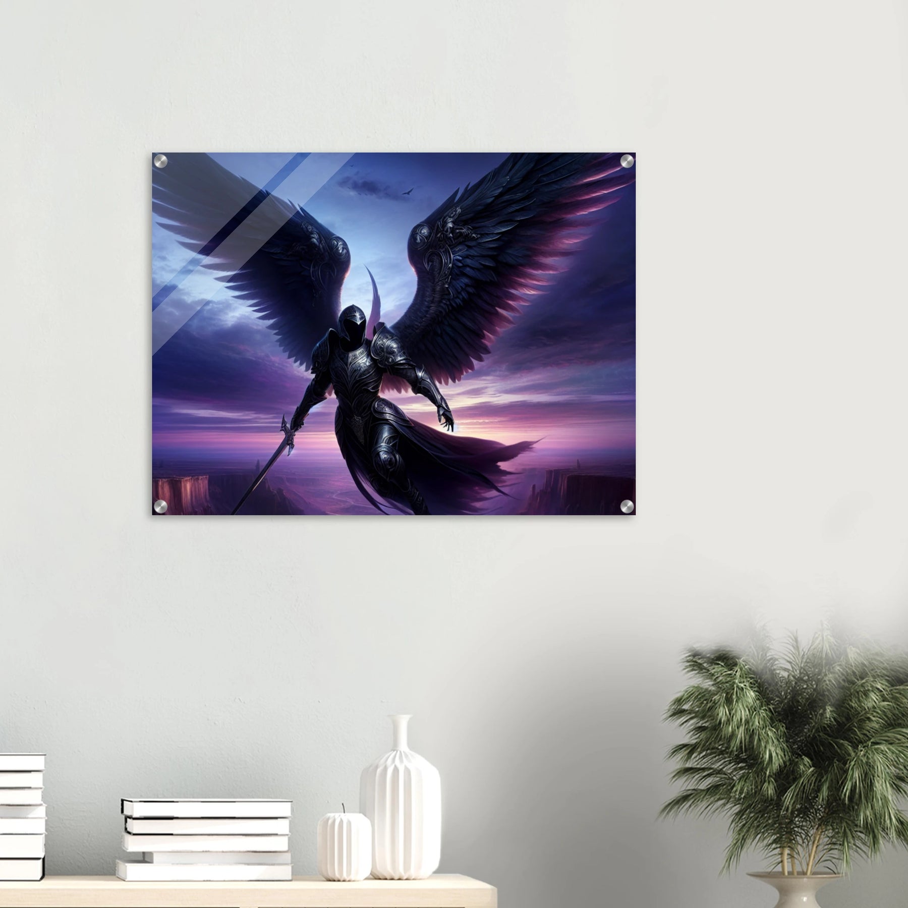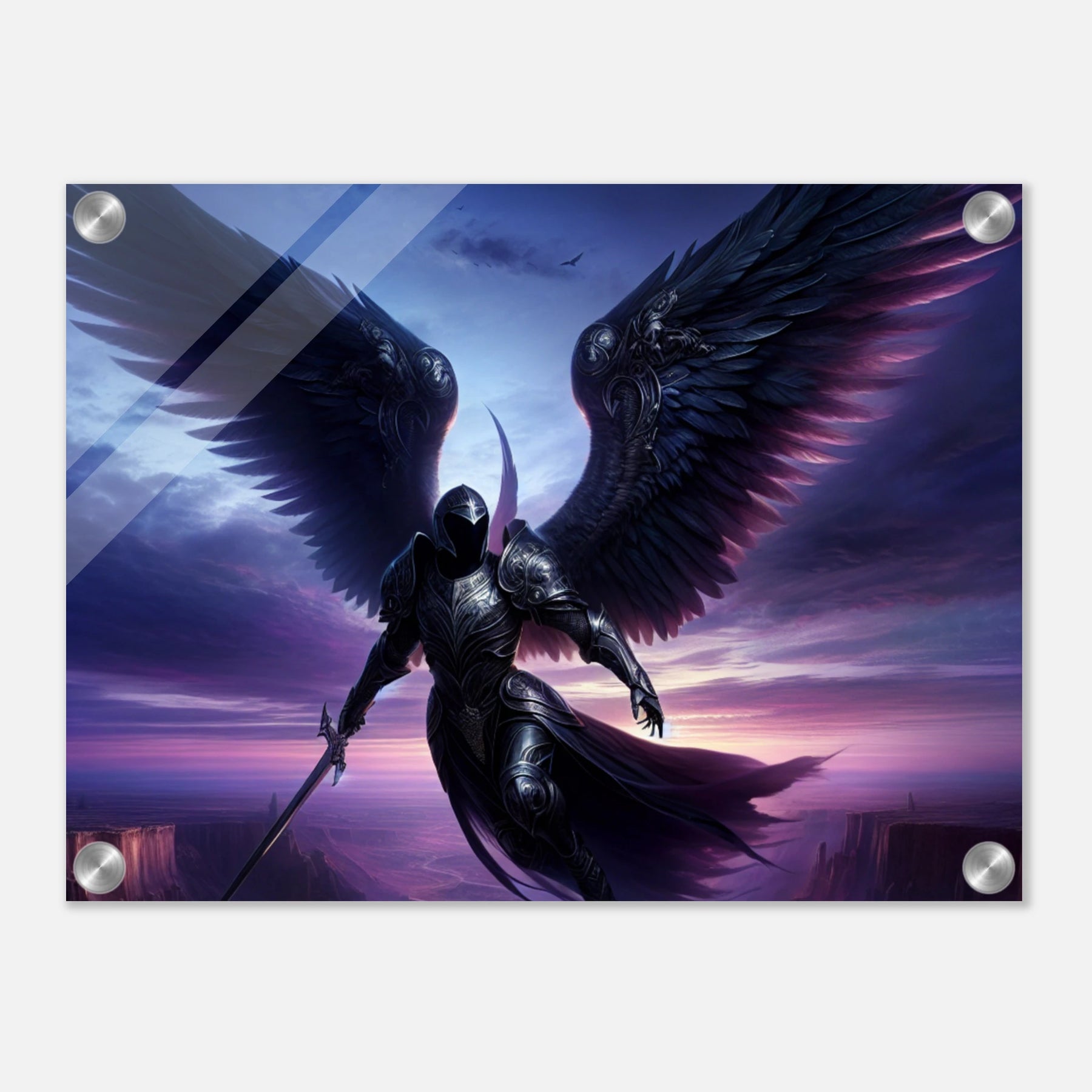 Acrylglasdruck: Geflügelter Ritter in Rüstung fliegt durch die Nacht in violetten Farben, hält Wache und beschützt die Menschen, eindrucksvolle Wandkunst für Fantasy-Fans und Kunstliebhaber